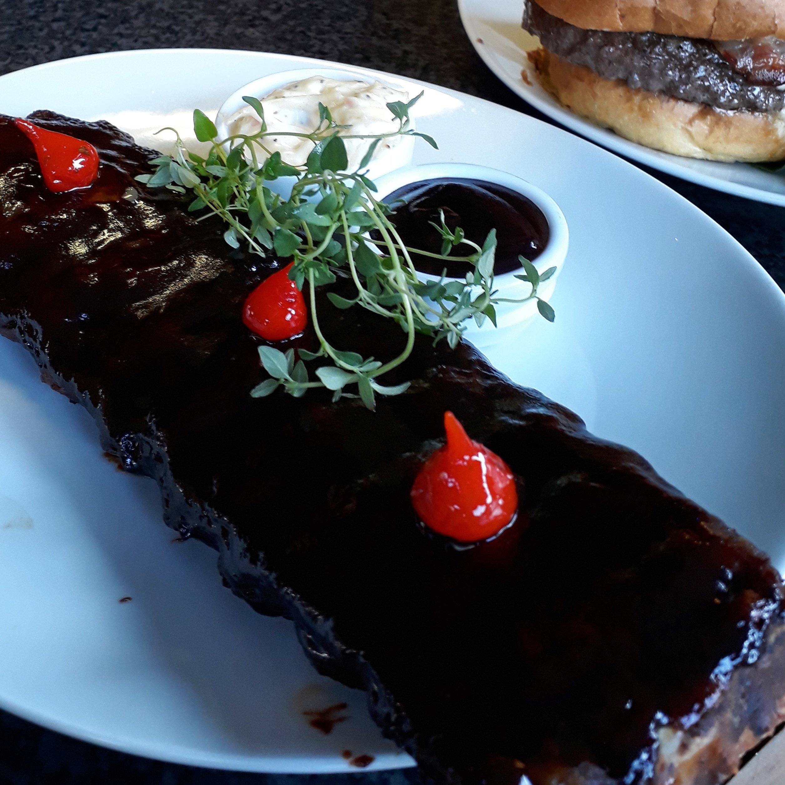 På övre delen av krogen är det fri placering samt så finns det fyra sittplatser vid utebaren där jag finns. Många gäster kommer att äta och som alltid när någon frågar vad jag rekommenderar, ribs eller grilltallrik för två.