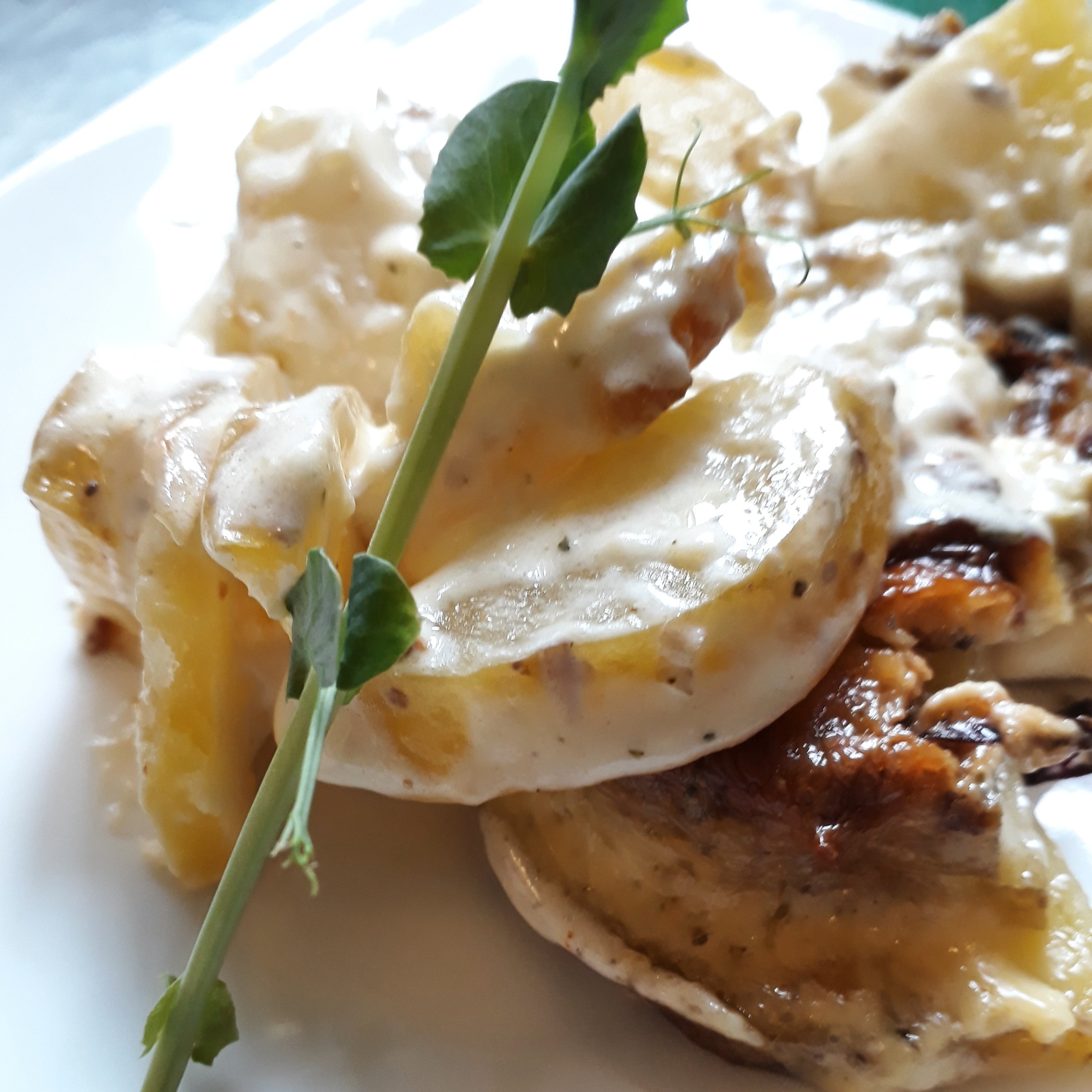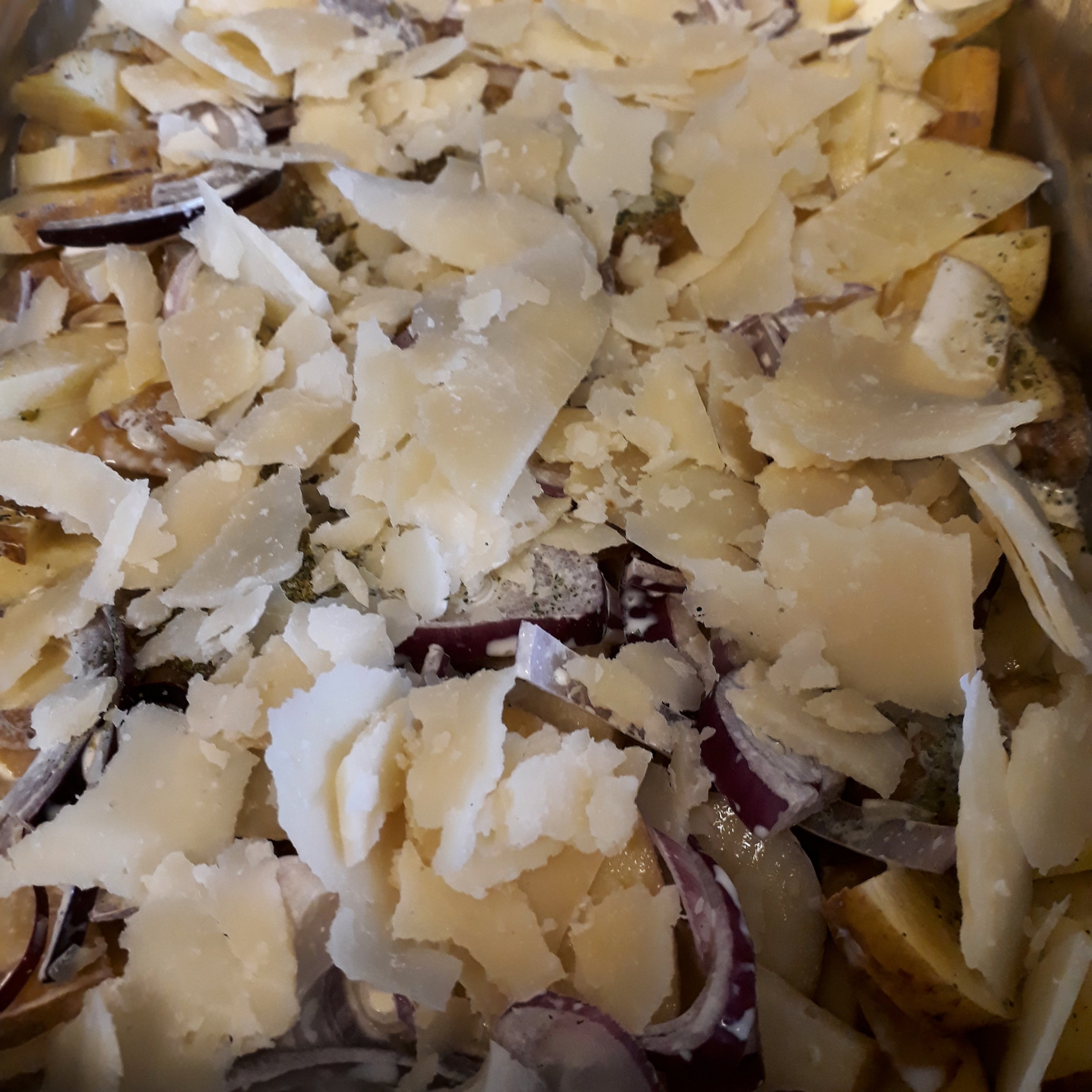 Dagens rätt blev potatisgratäng med mycket laktosfri grädde, persilja, chili, lök, salt, peppar och en massa hyvlad parmesanost. En behöver inte krångla till det. Det räcker med en enkel kryddning.