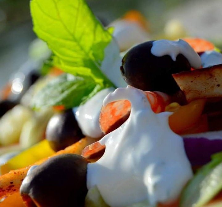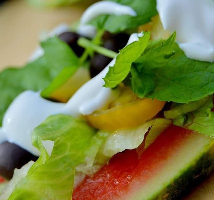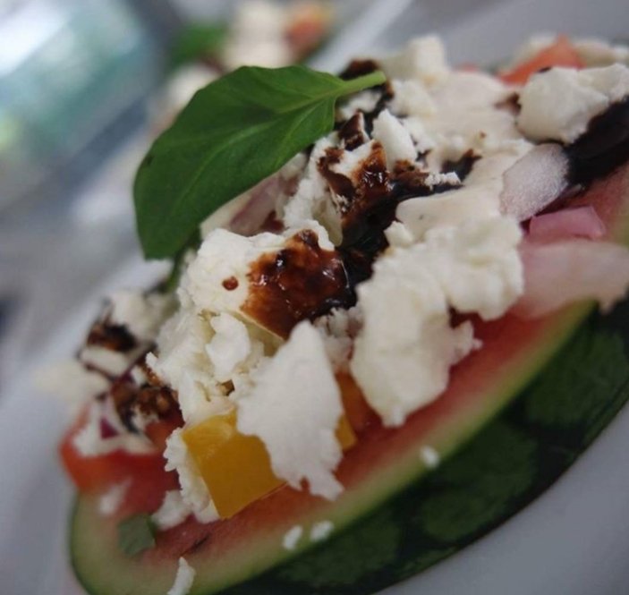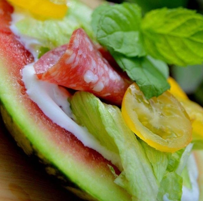 Dagens fräscha pizza när det är så varmt ute blir på vattenmelon med salami, halloumi, basilika och mozzarella med kall sås på creme fraiche, lime, salt och peppar.