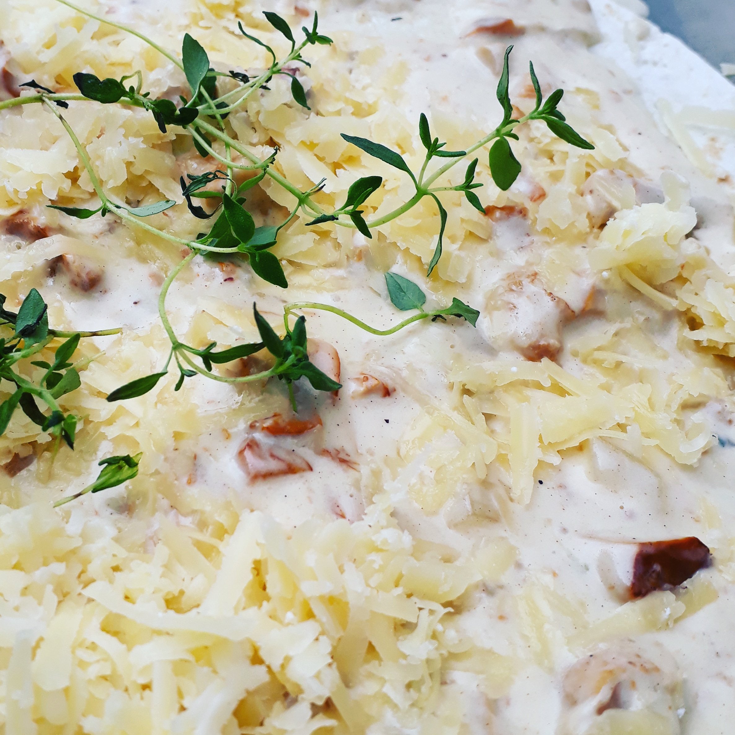 Du gör en vanlig redning, steker lök och kantareller, rör om och duttar på brödet, riv västerbotten och in i ugn.