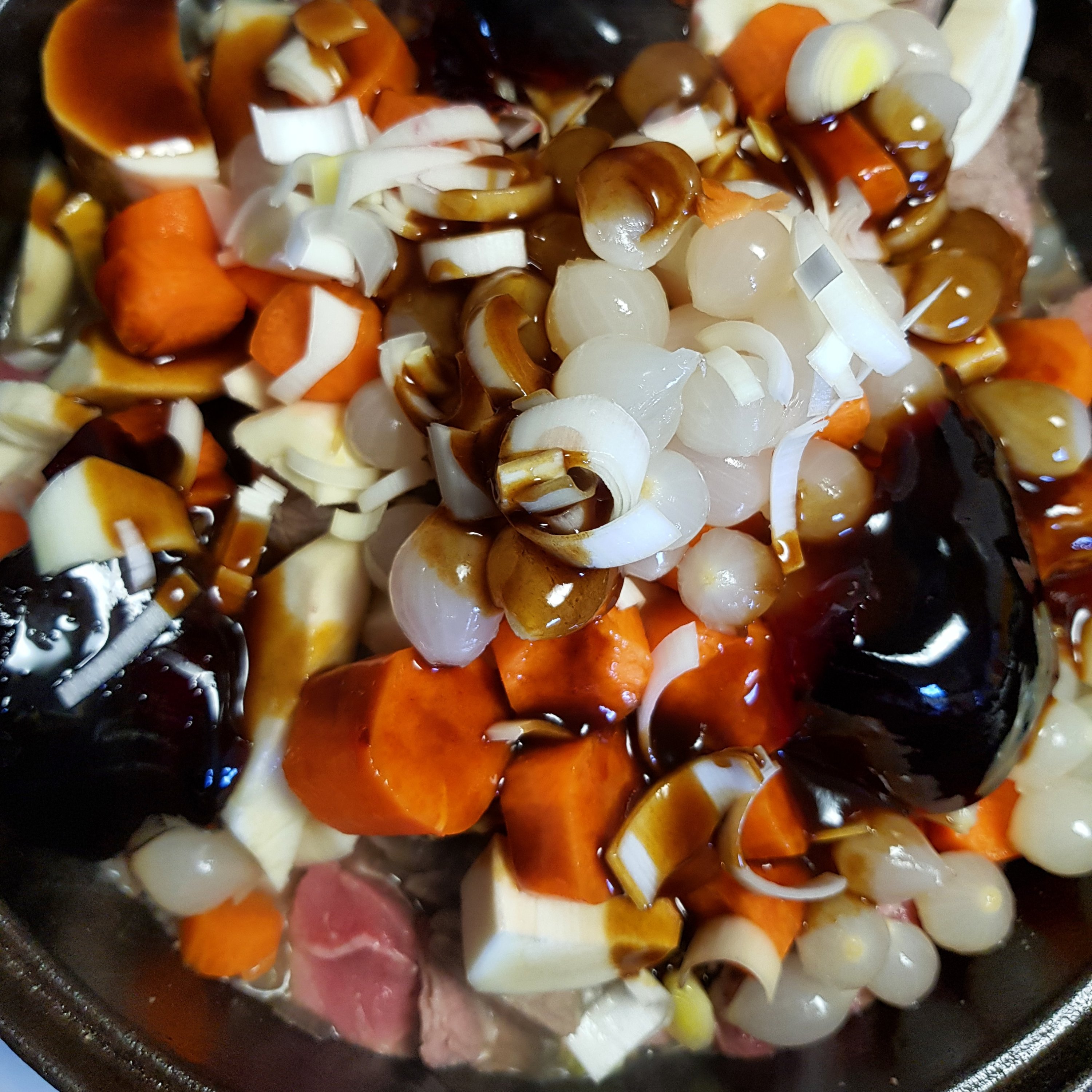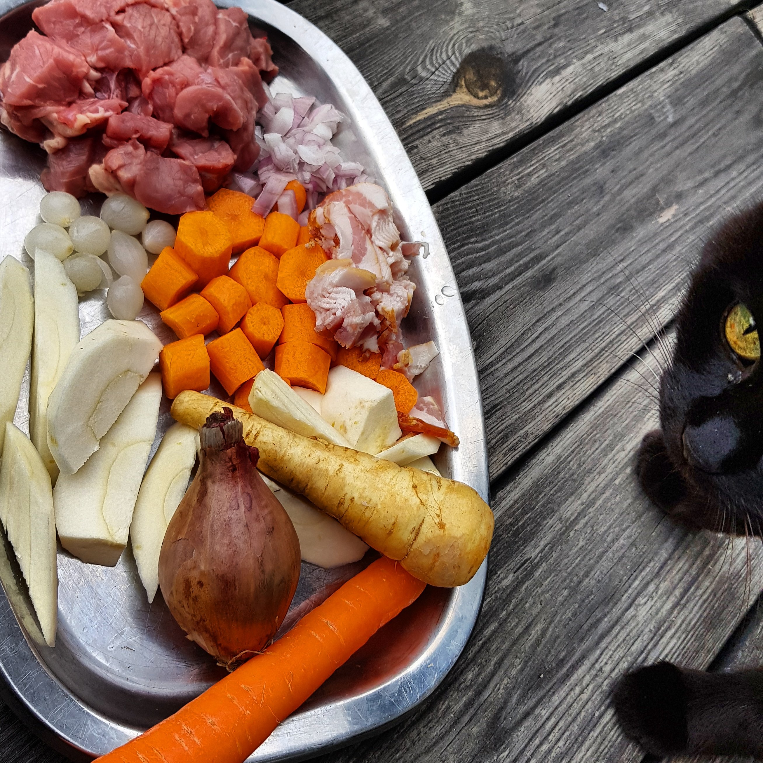 Ni fräser finhackad lök med bacon och kryddar. Blanda runt en tesked gelé. I med köttet som kryddas och fräs på innan grönsakerna åker i och får puttra i tusen år. Det sista ni gör är att hälla i laktosfri grädde och rör om. Servera med baguette, Amarone eller mjölk.