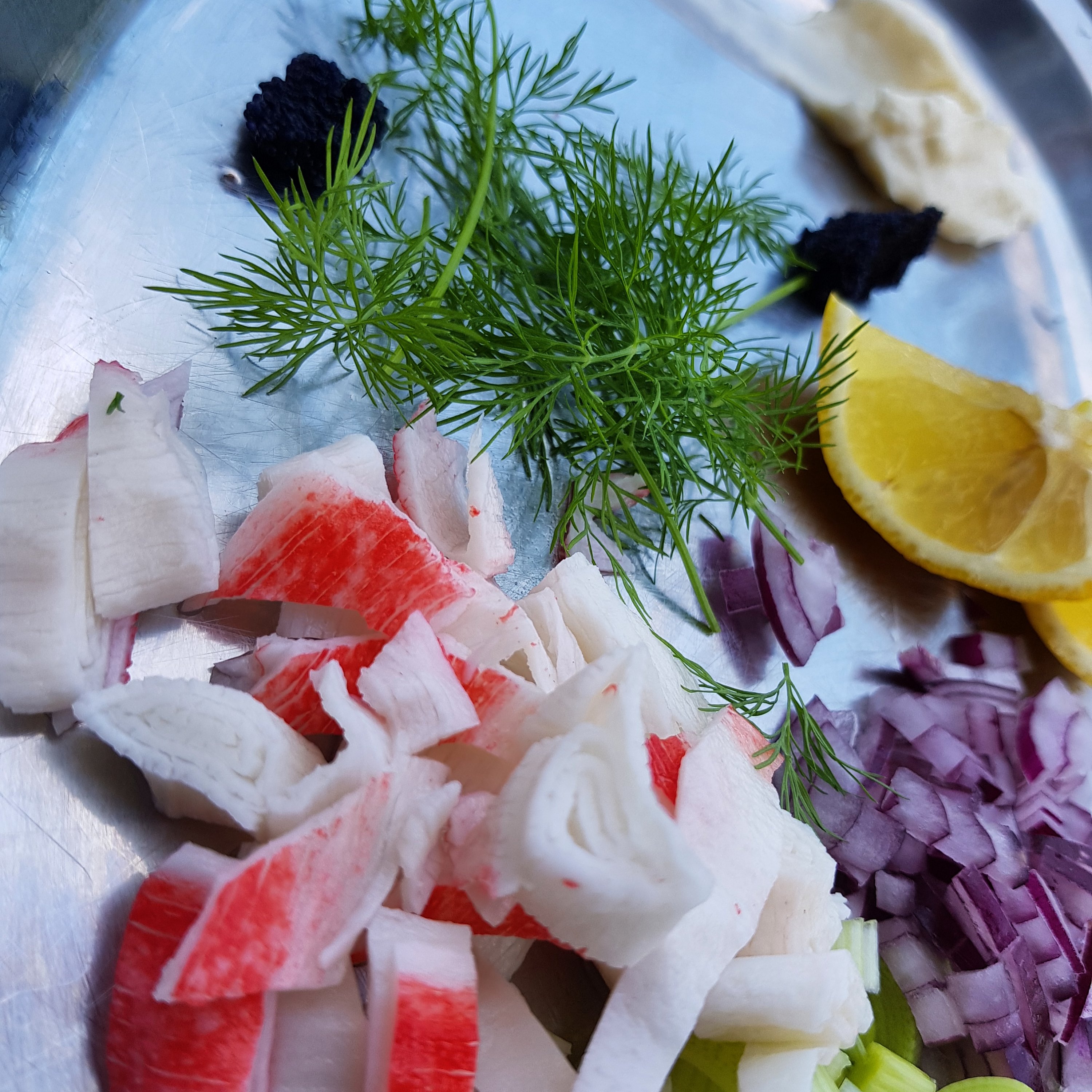Finhacka och rör ihop allt och låt det gotta till sig. Hur mycket av allt? Improvisera för sjutton eller sök på nätet. Servera på smörstekt bröd och toppa med räkor, dill och citron.