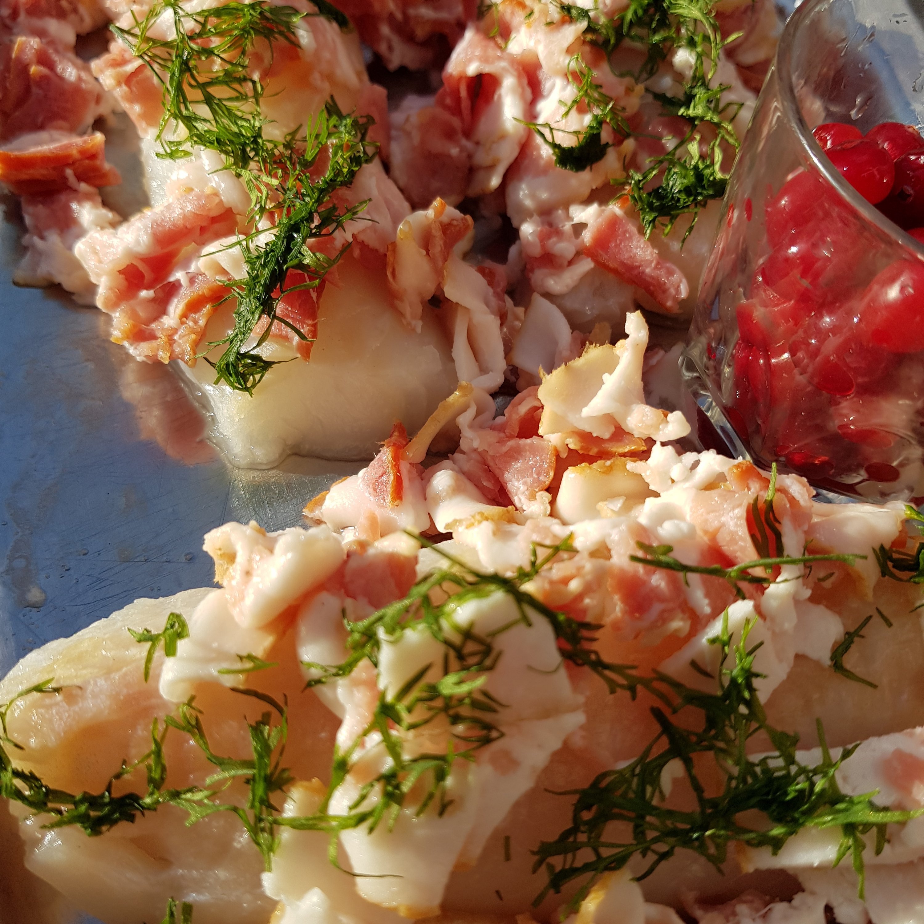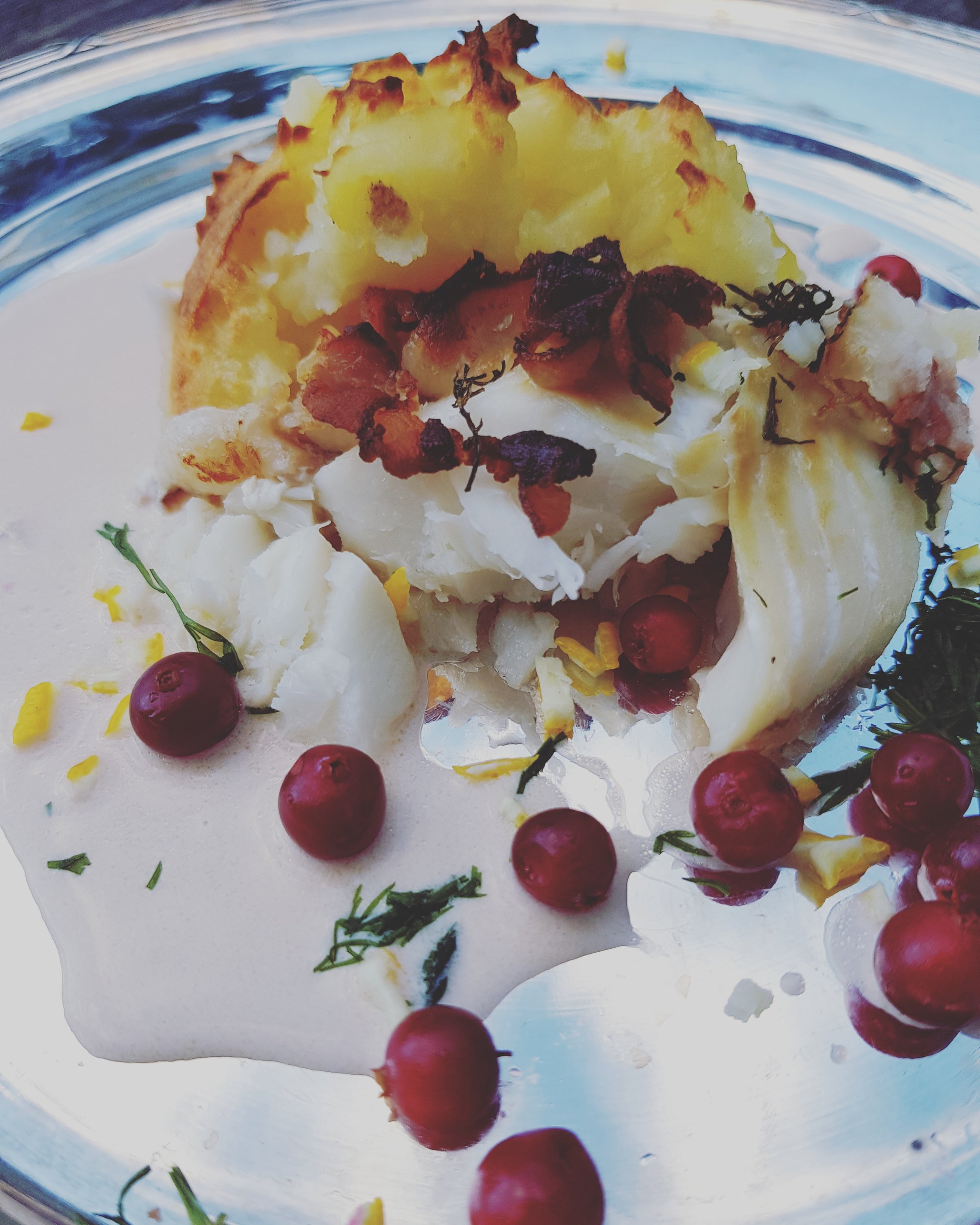 Idag fick det bli torsk i ugn med strimlad bacon, dill, salt, vitpeppar och en klick laktosfritt smör tillsammans med en potatismos som fick frodas i samma form. Till detta skirade jag smör, karamelliserade tranbär och skummade grädde.