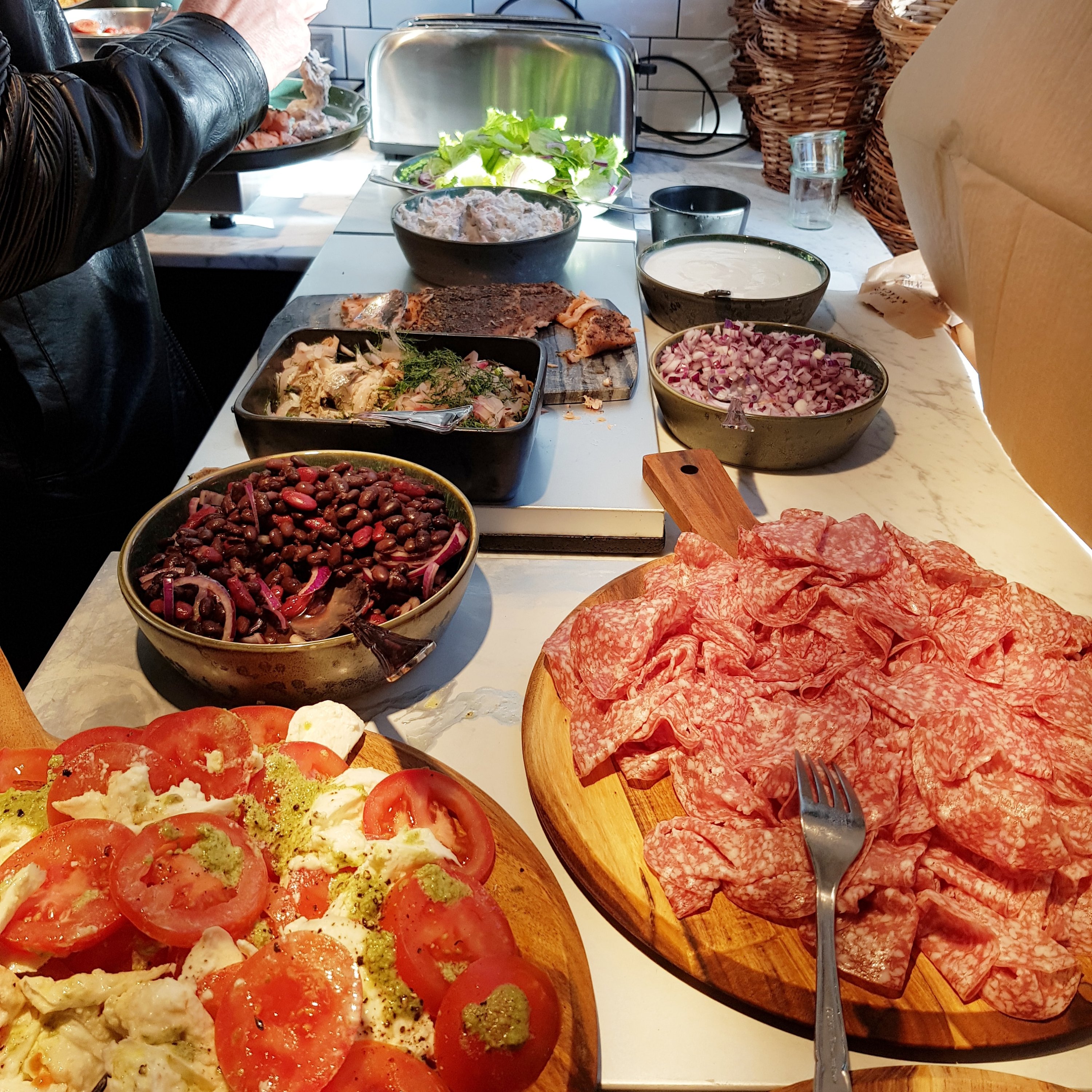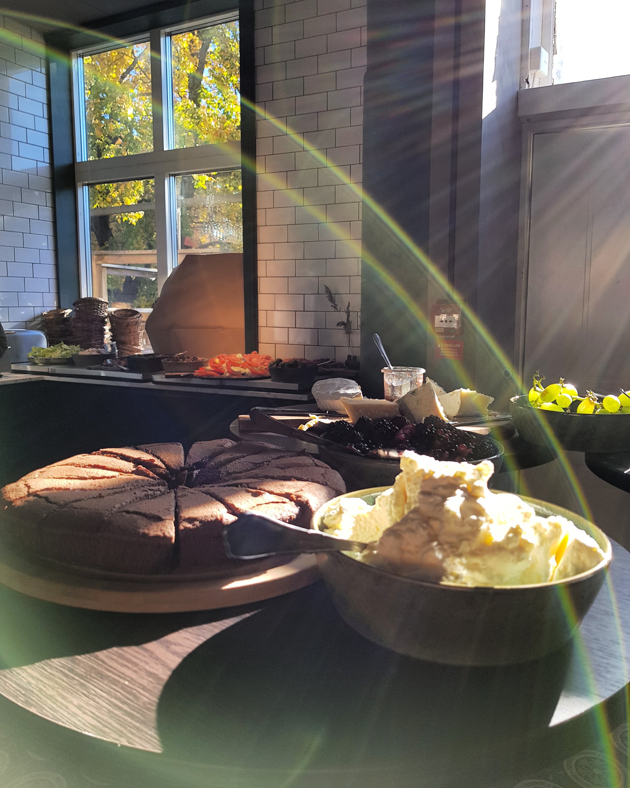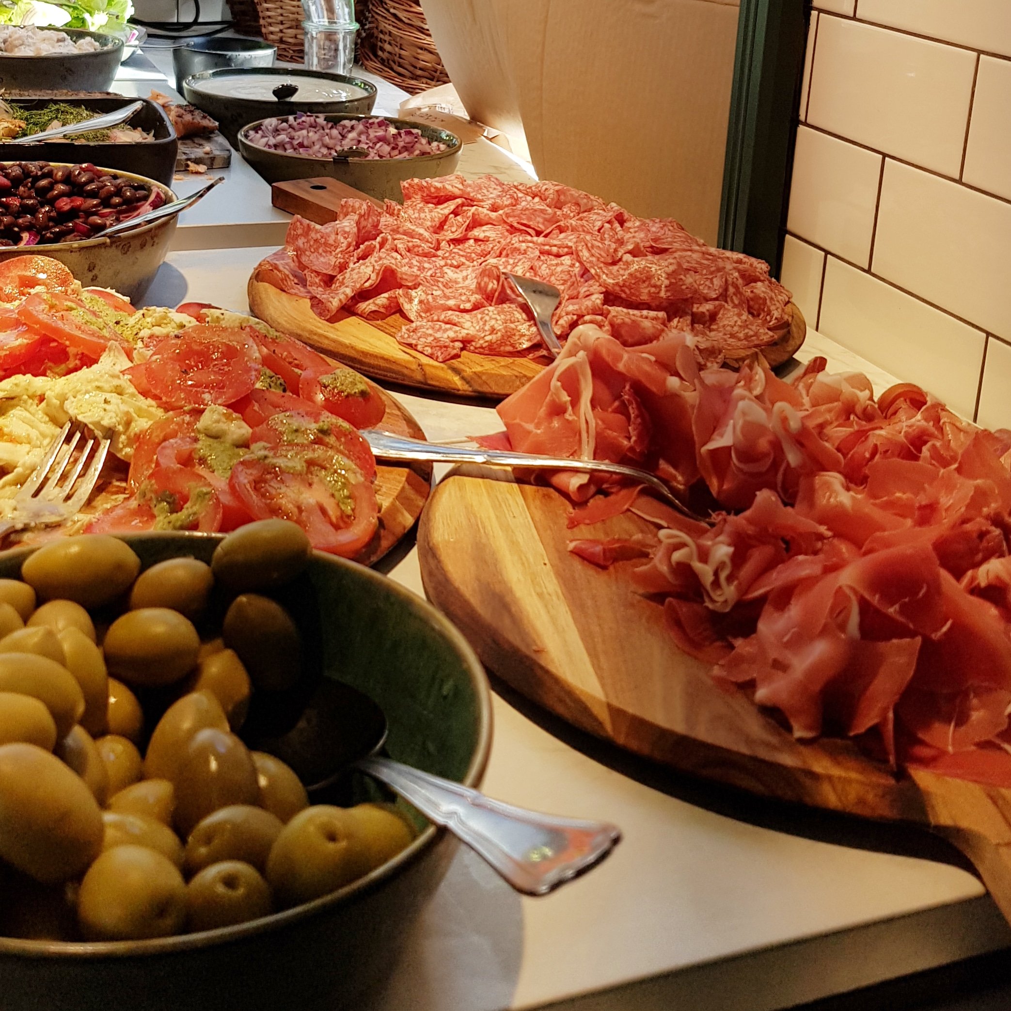 Här erbjuds ni en riktigt bra brunch med variation på flatbread, pancakes, salami, prouscuttio, oliver, äggröra, bacon, härliga smörgåsar, ostar, marmelad och mycket mera som mättar magen.