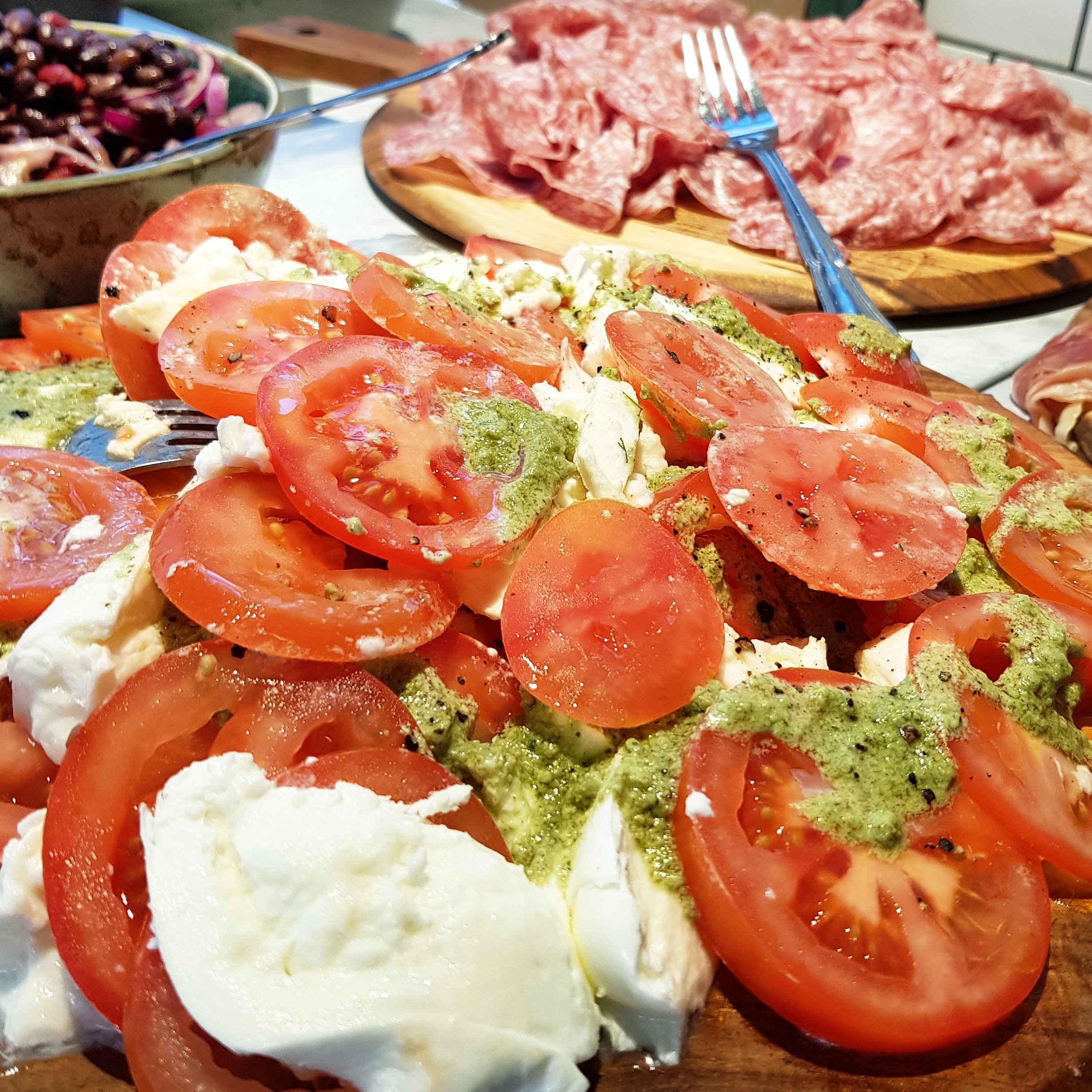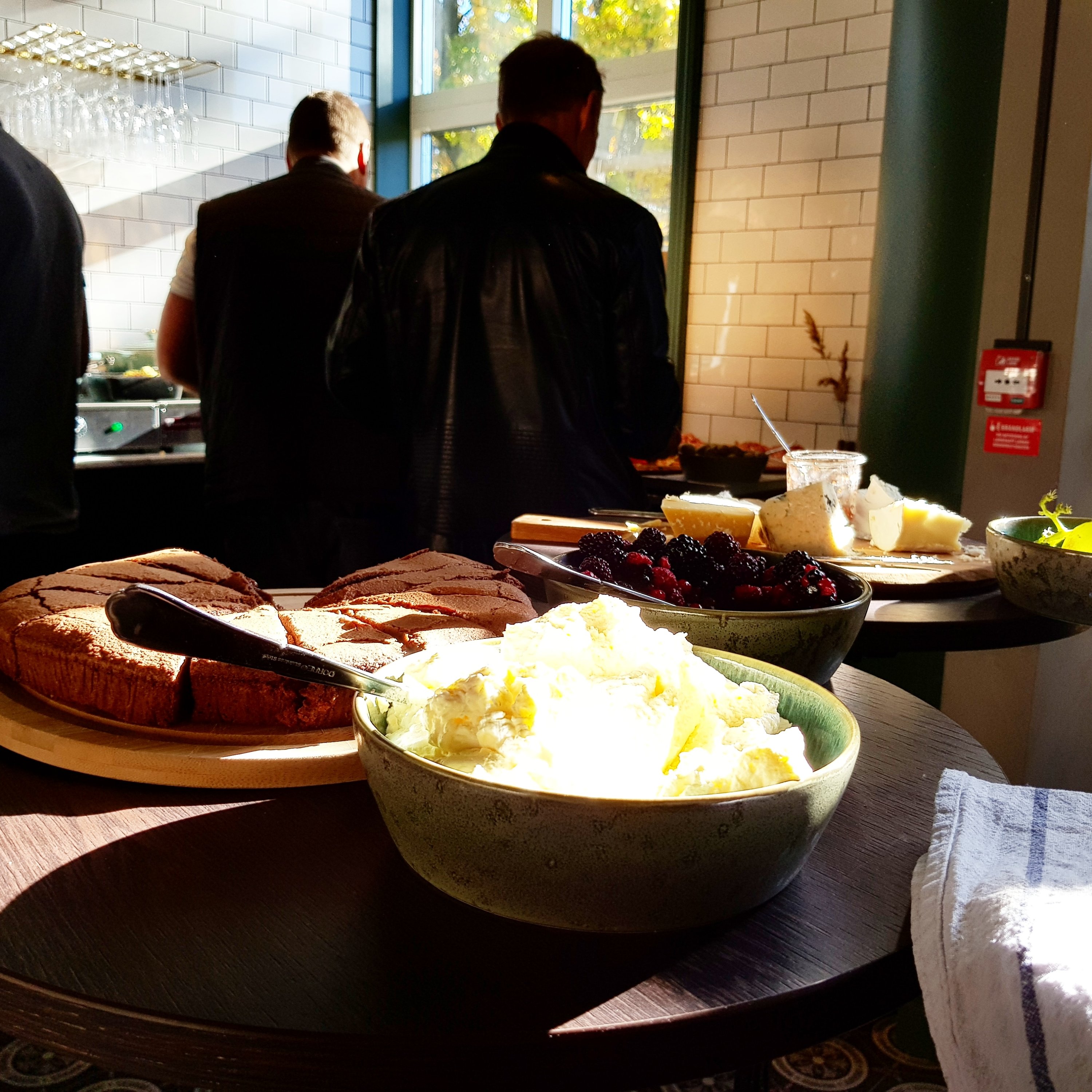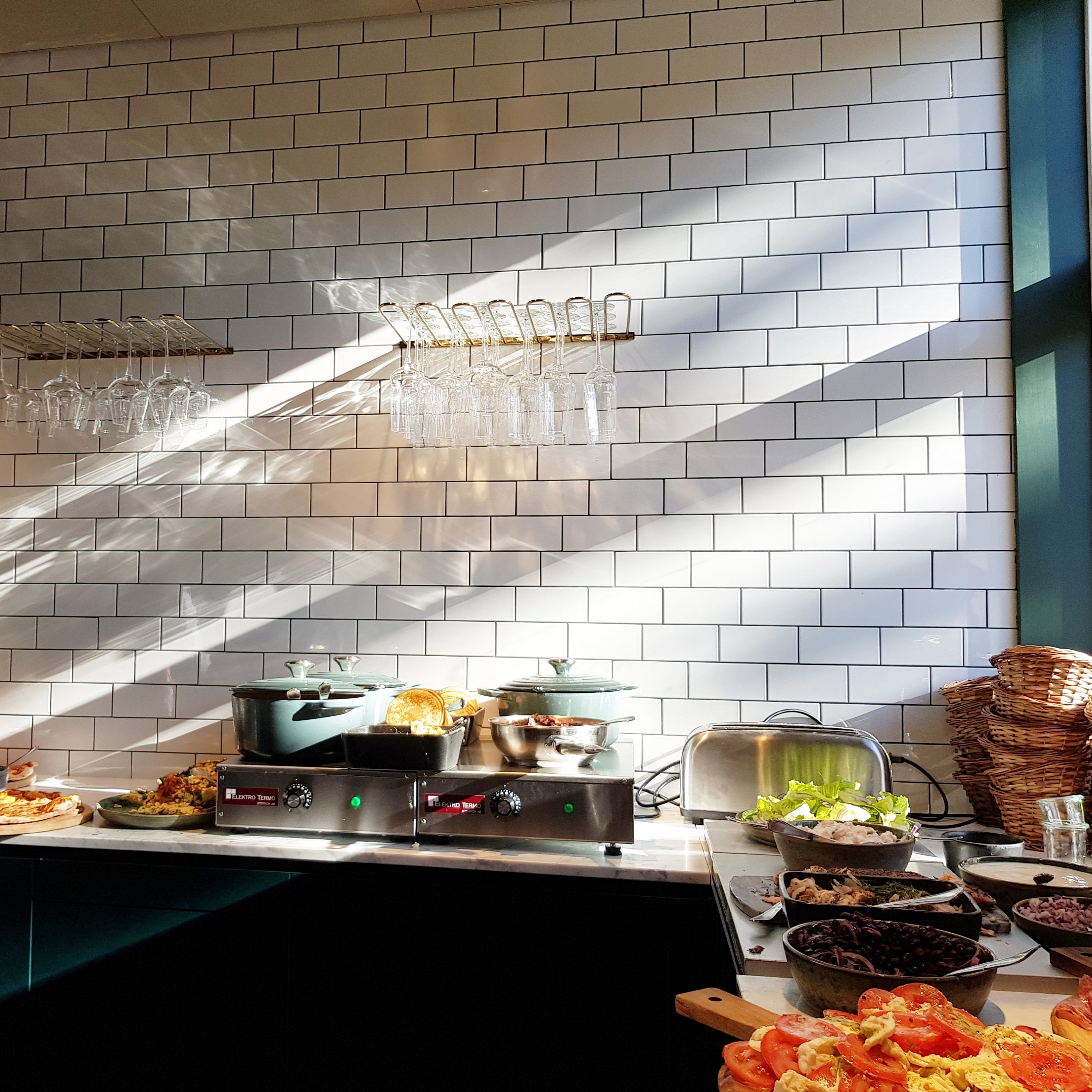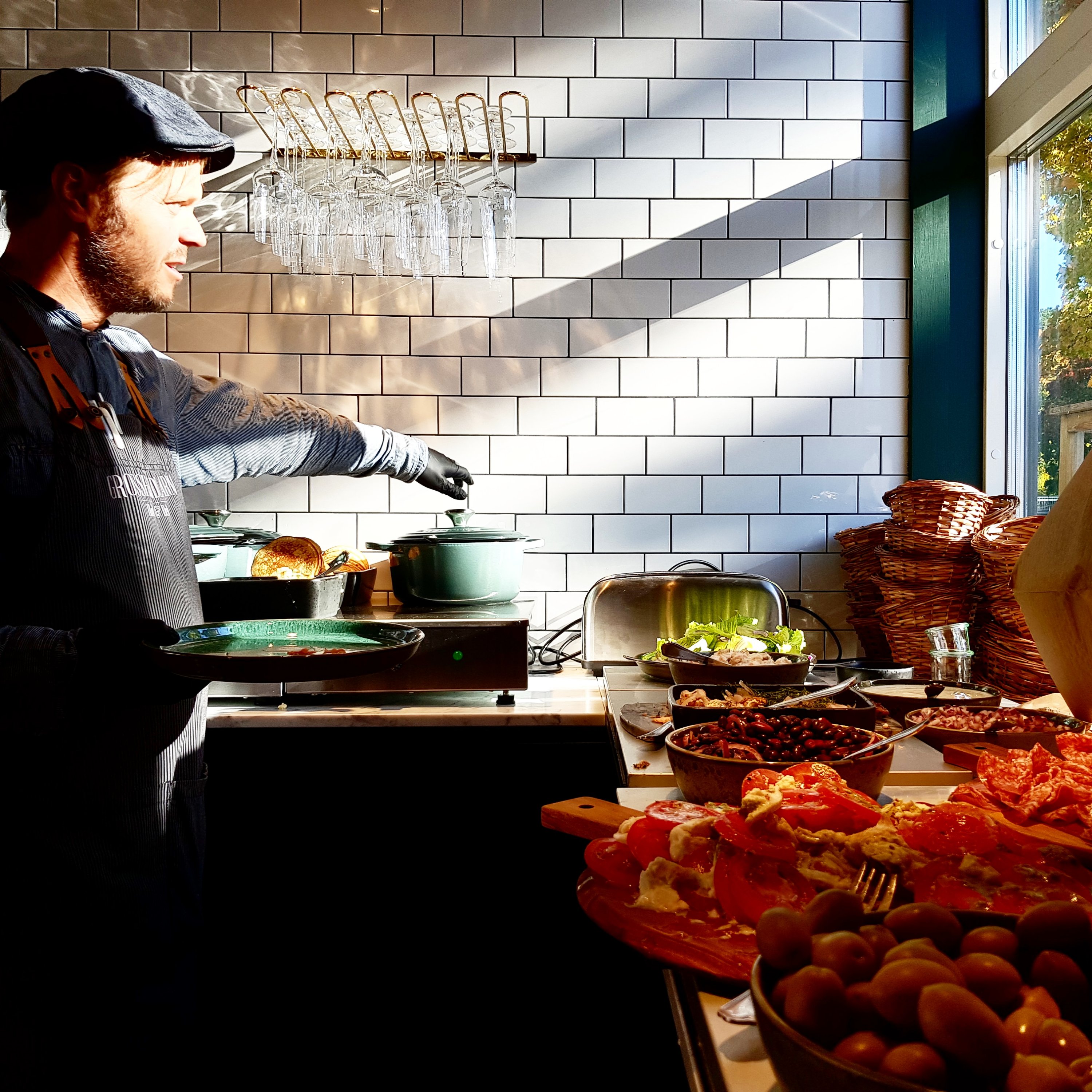 Här erbjuds ni en riktigt bra brunch med variation på flatbread, pancakes, salami, prouscuttio, oliver, äggröra, bacon, härliga smörgåsar, ostar, marmelad och mycket mera som mättar magen.