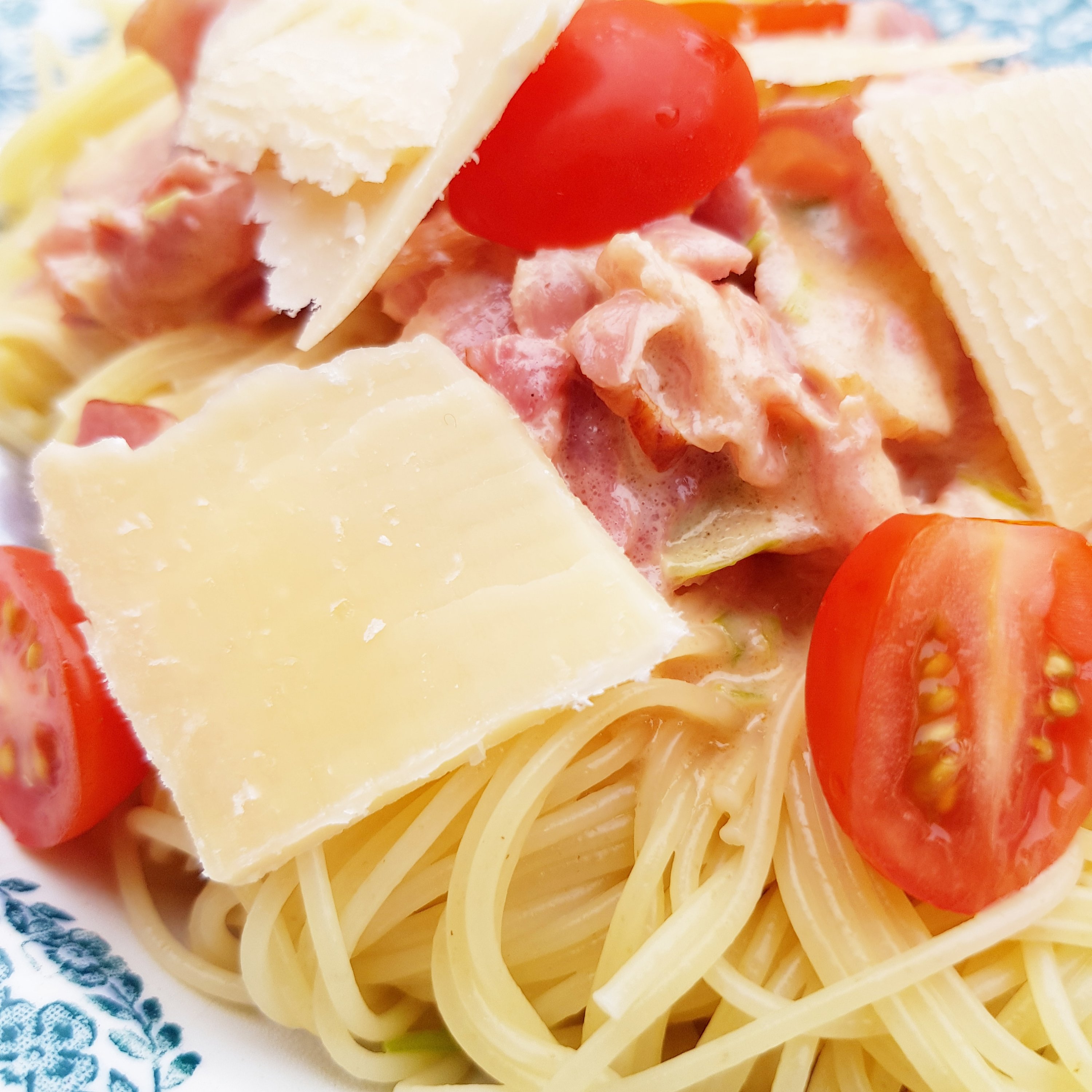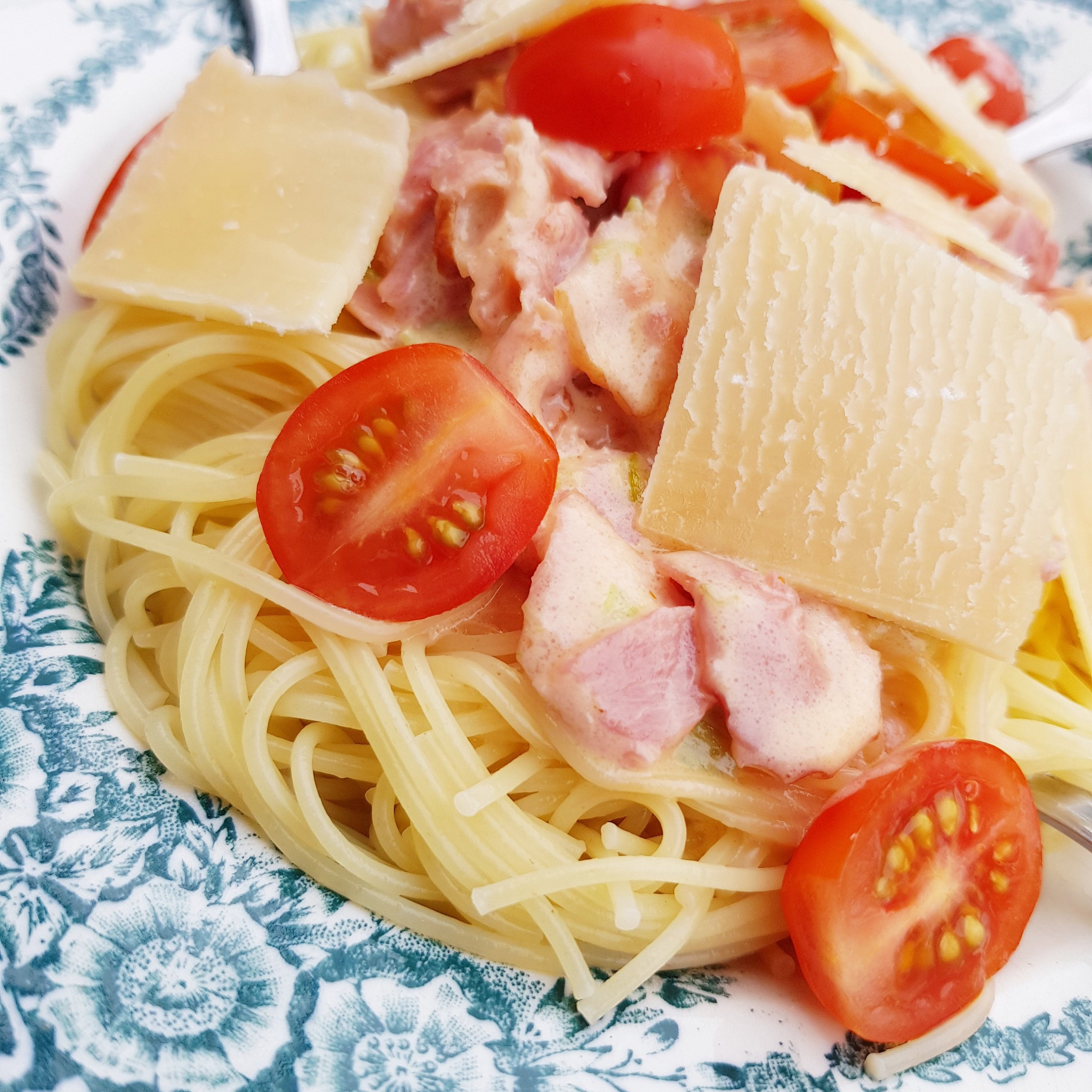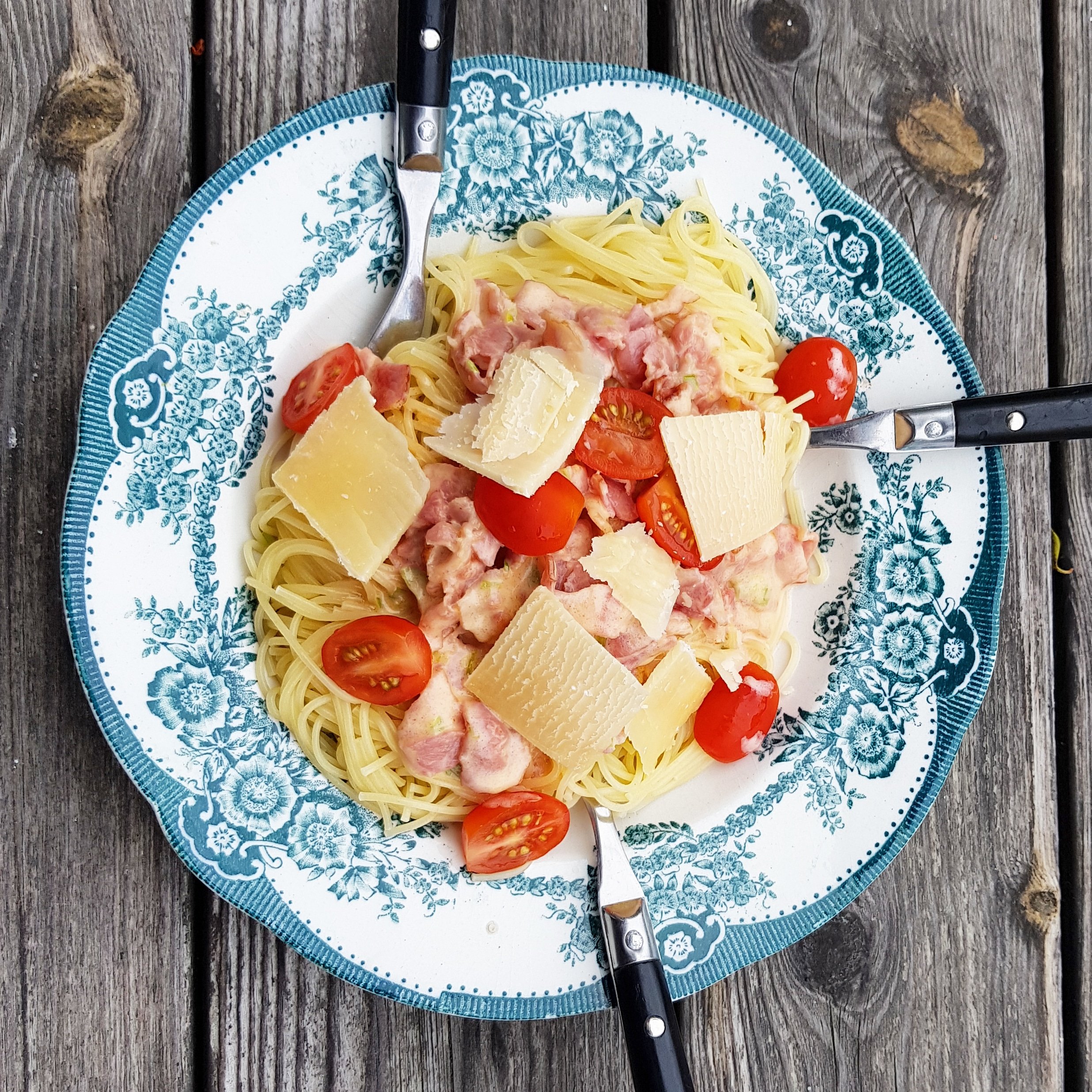 Finhacka lök, bacon och stek tillsammans med laktosfritt smör. Ner med grädde och en matsked cremèfraiche, krydda och koka spaghetti. Serveras det till barn brukar ketchup önskas. Själv föredrar vi hyvlad parmesanost och cocktailtomater. Viktigt. Ta bort tomatroten!