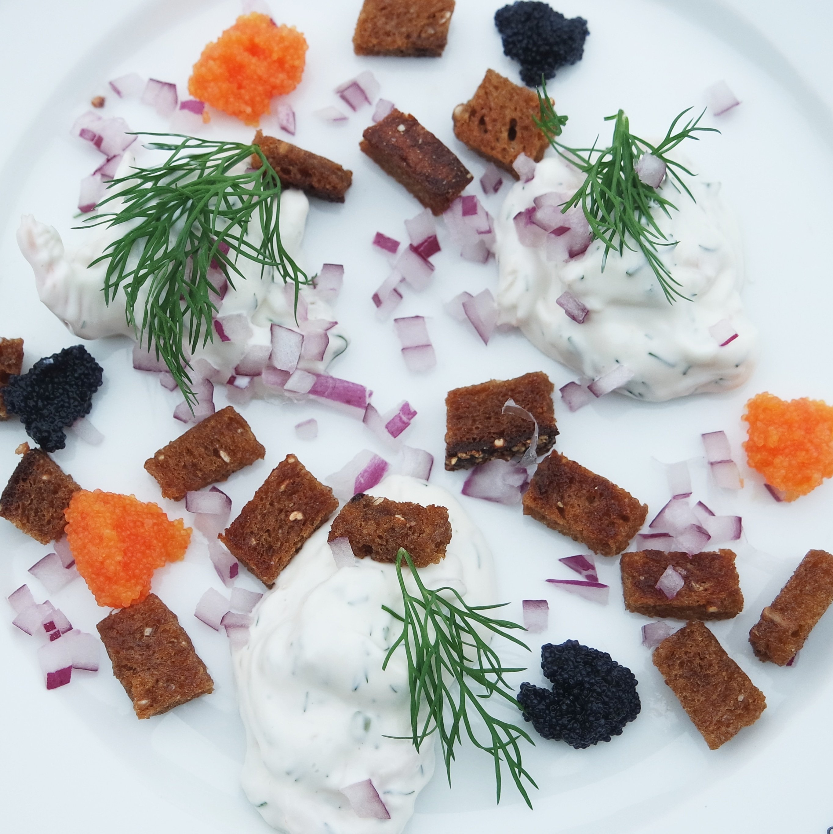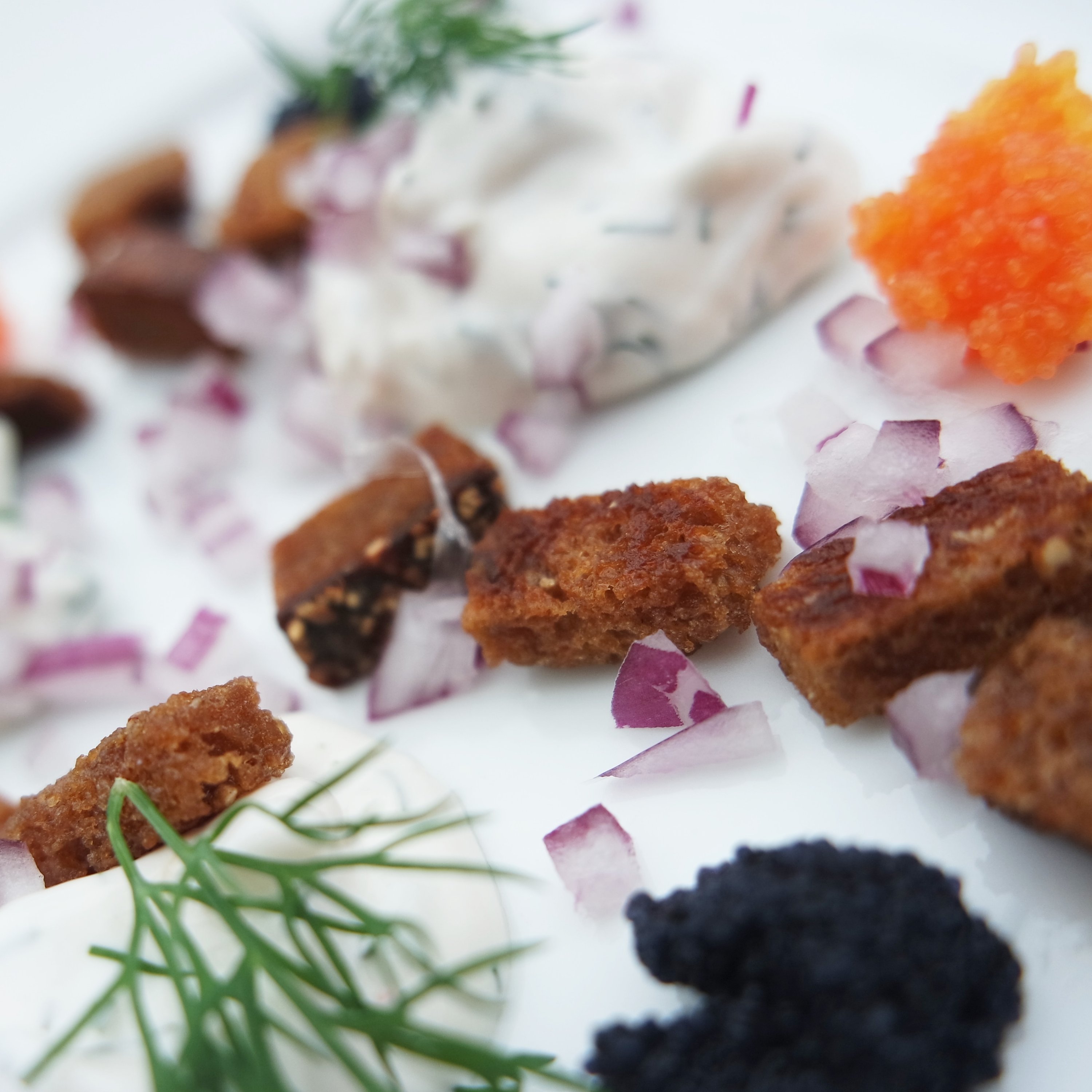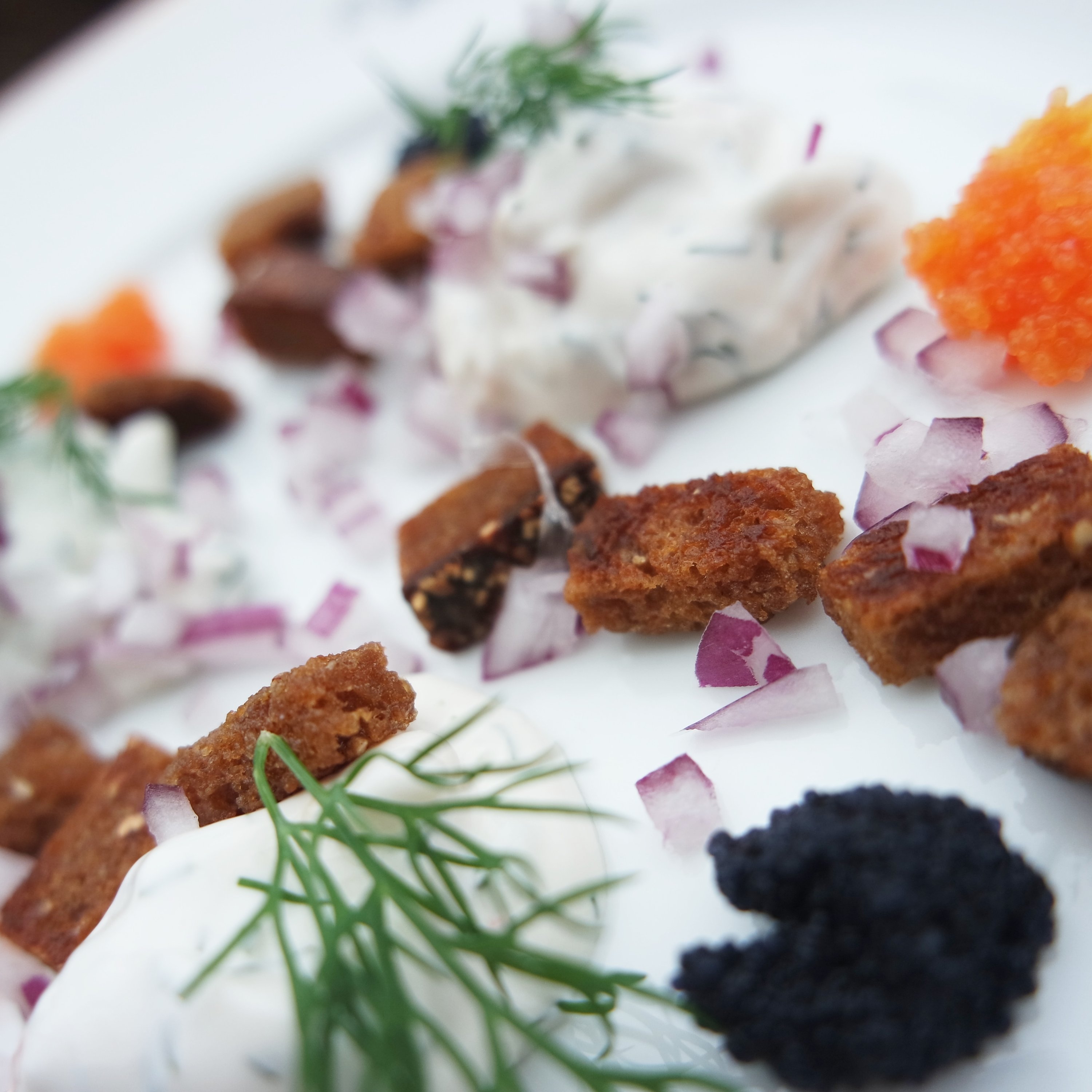 Jag smörstekte lite kavring, duttade i vitvinsvinäger, salt och vitpeppar och toppade med löjrom, finhackad rödlök och dill.