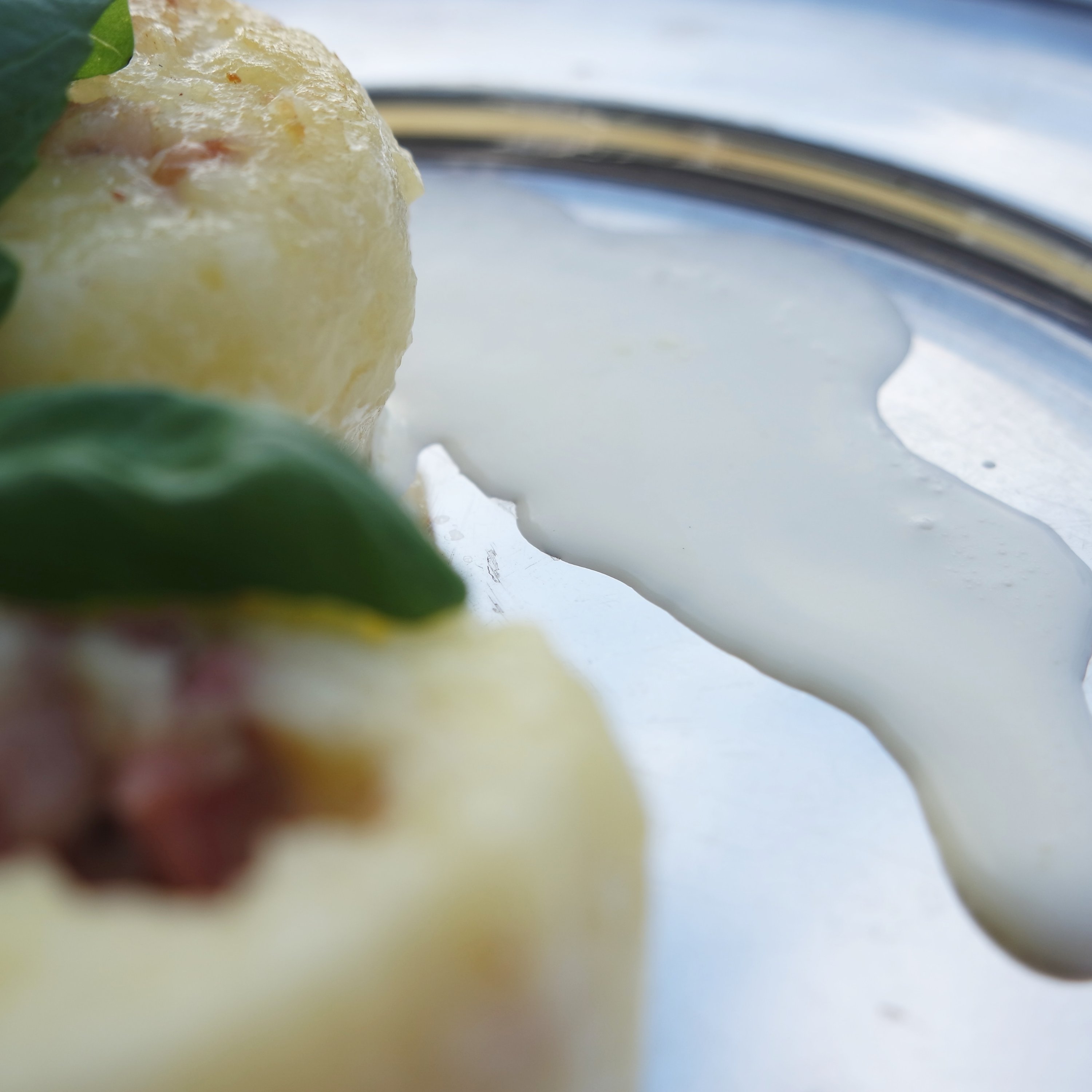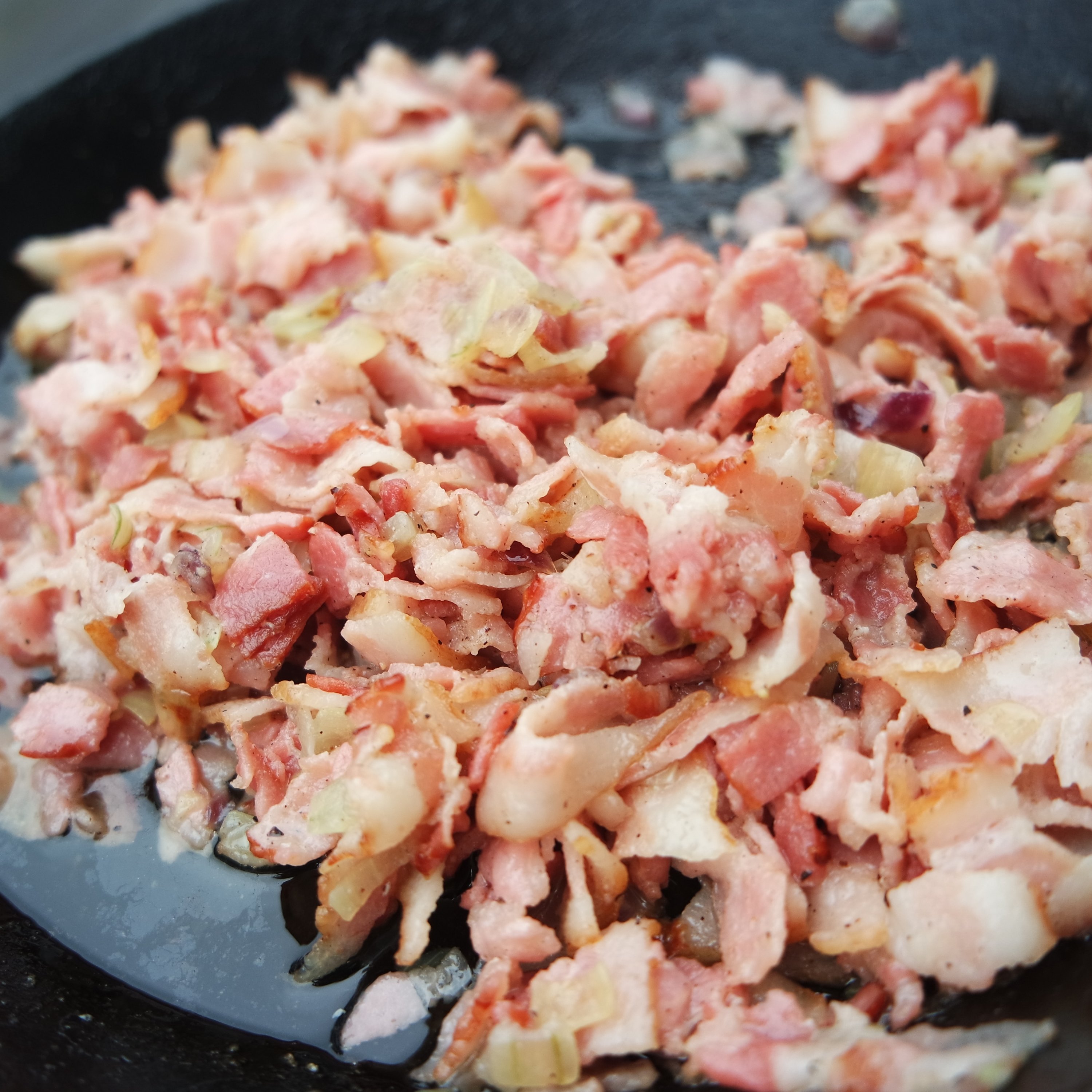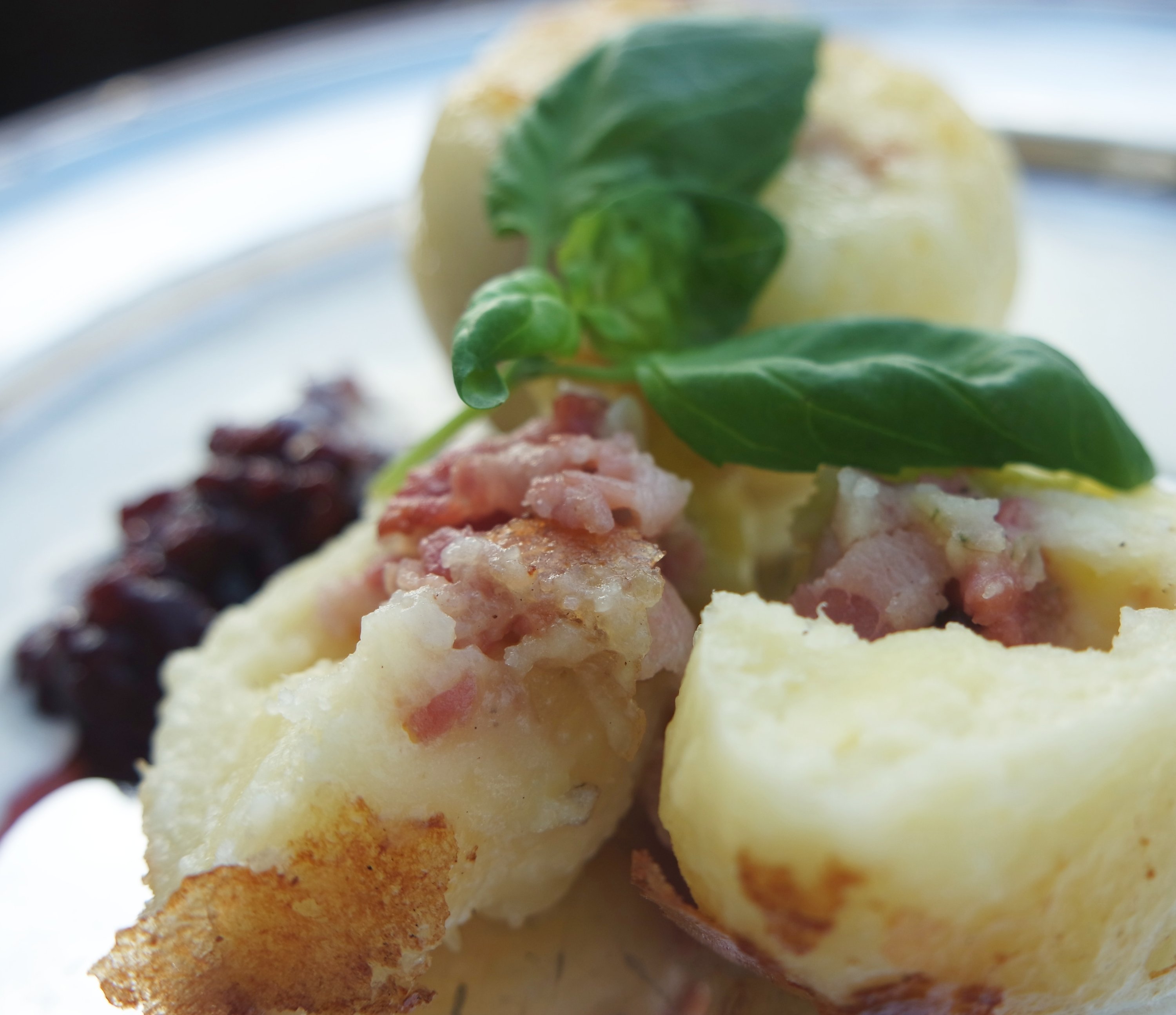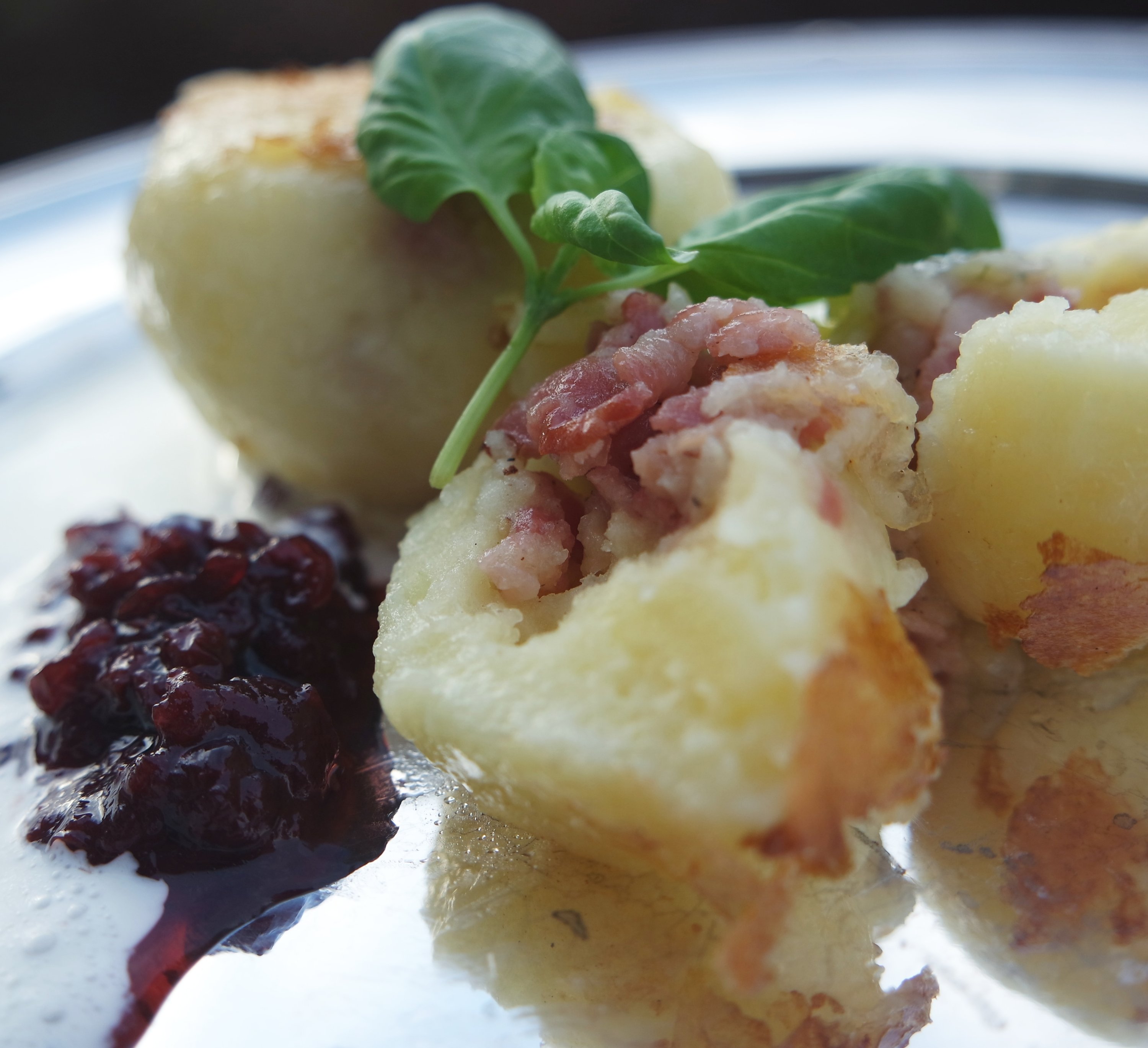 Stek fläsk och bacon. Rulla degen så det är fast och tryck ner ett hål i mitten som ni fyller med fläsk. Koka upp vatten, låt kroppkakorna koka. Dom är klar när dom kommer till ytan. Smörstekt kakorna och servera med det ni önskar. Grädde eller brynt smör och lingon. Toppas med basilika eller timjan.