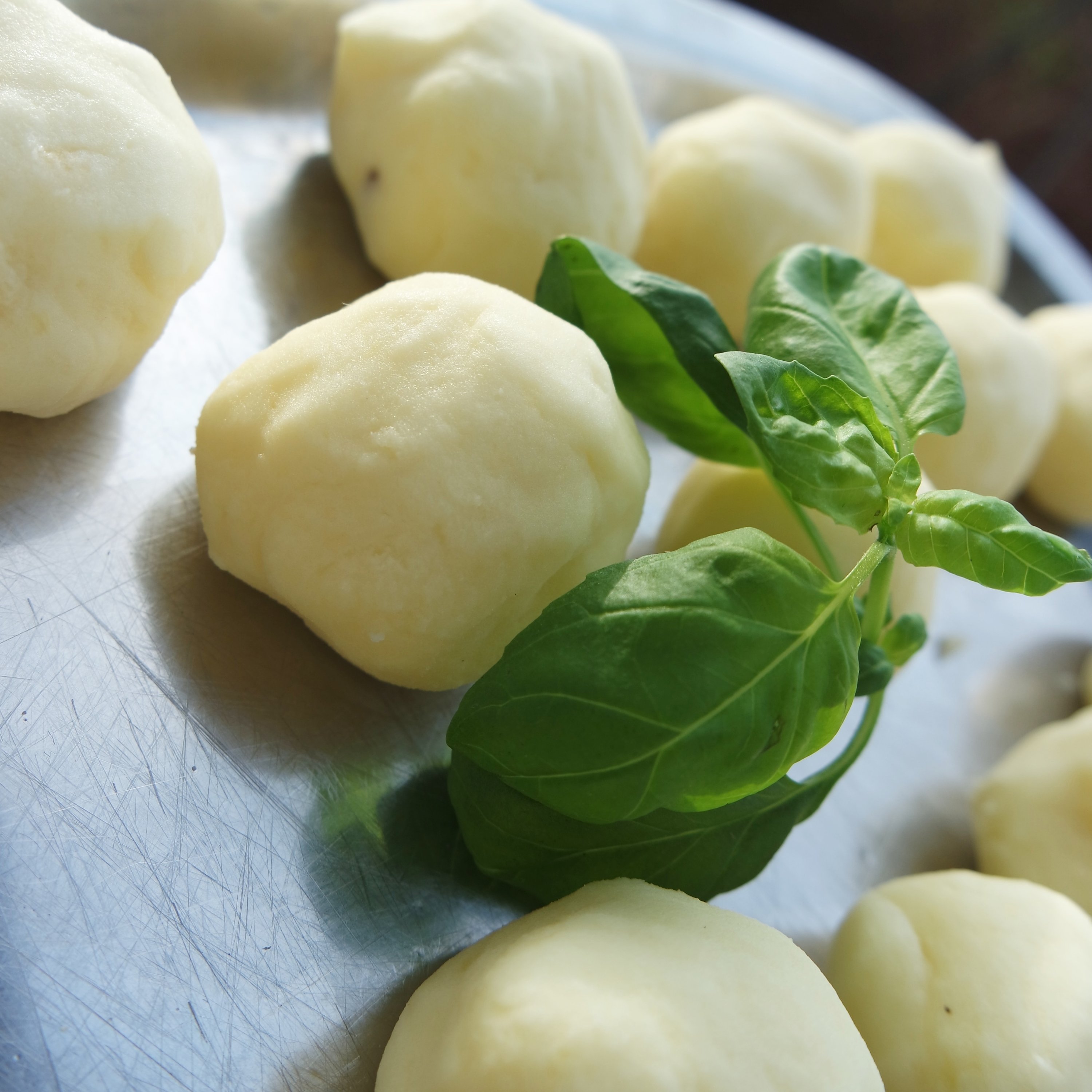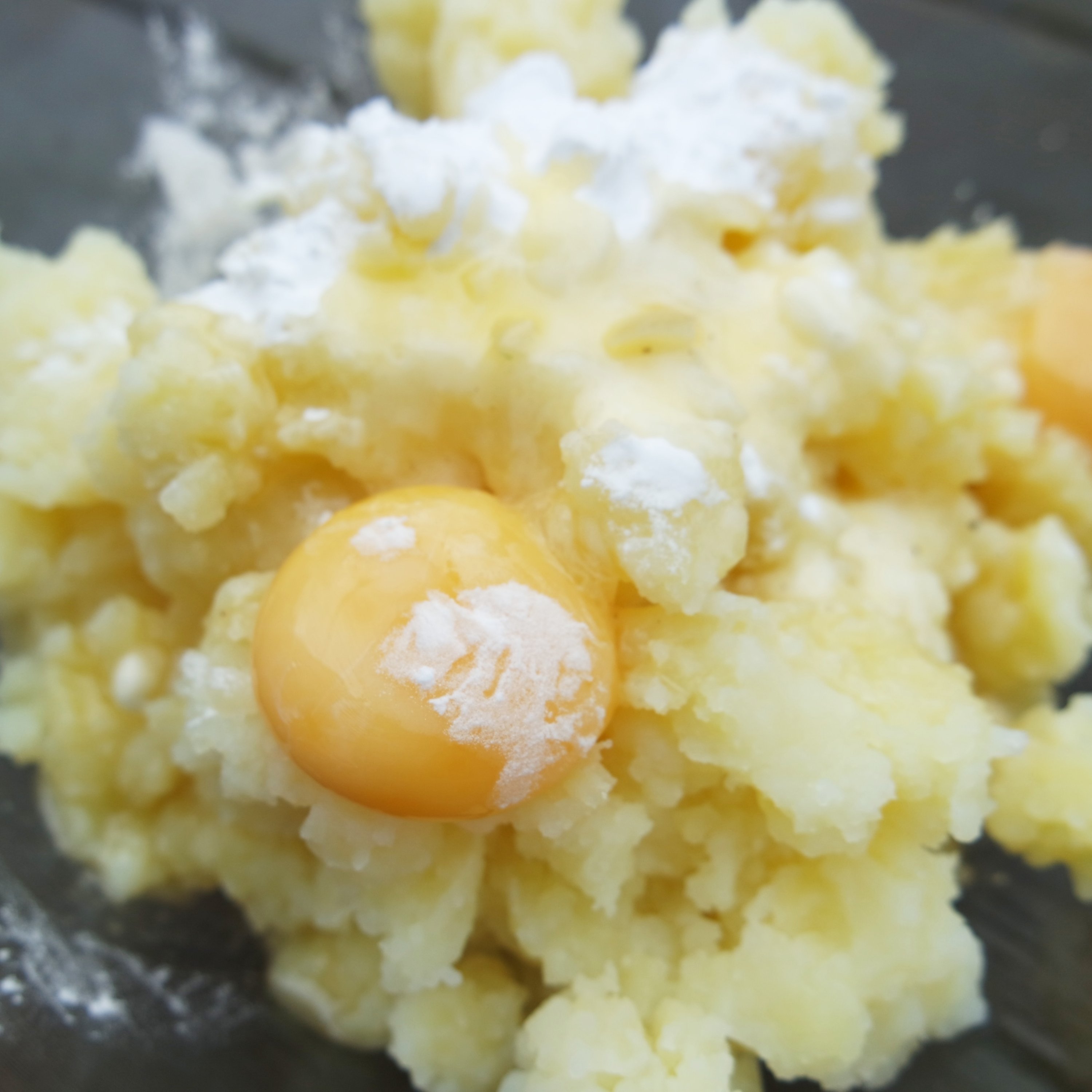 Koka potatis, pressa och låt det svalna. Bryn laktosfri smör och vänd ner det i potatisen när det här svalnat. Häll även ner potatismjölet och knäck ner äggulorna.