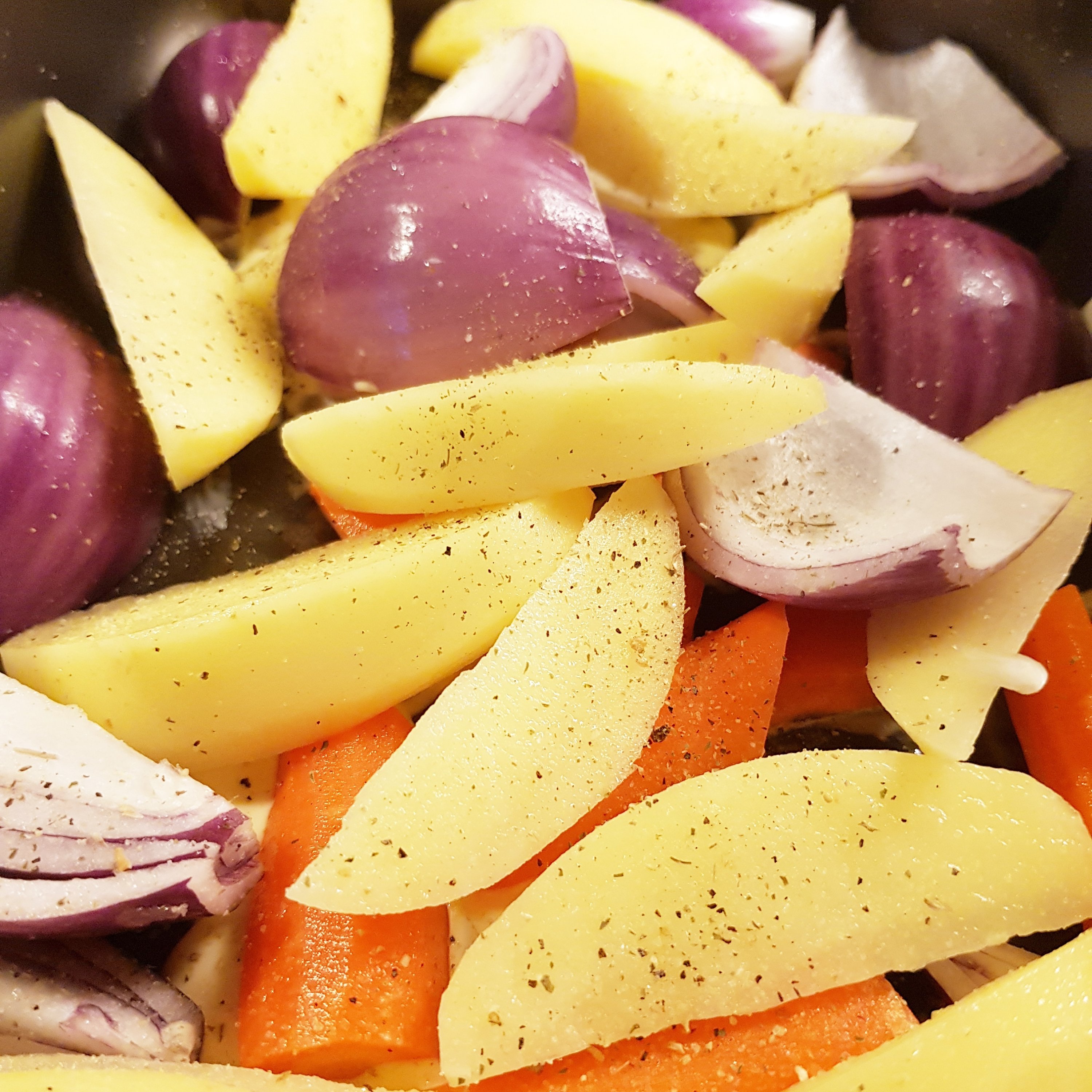 Blanda ner högrevsfärs i en skål, krydda med valfria kryddor och som ni själva tycker om. Lite salt, vitpeppar, persilja och oregano? Häll ner en skvätt kalvfond från Bong, grädde och rör om. Forma färsen till en limpa och linda runt bacon. In i ugn på ca 220 grader i 30 min beroende på hur stor limpa ni har. Tvätta och skala rotsakerna, dela och in i ugn, krydda efteråt.