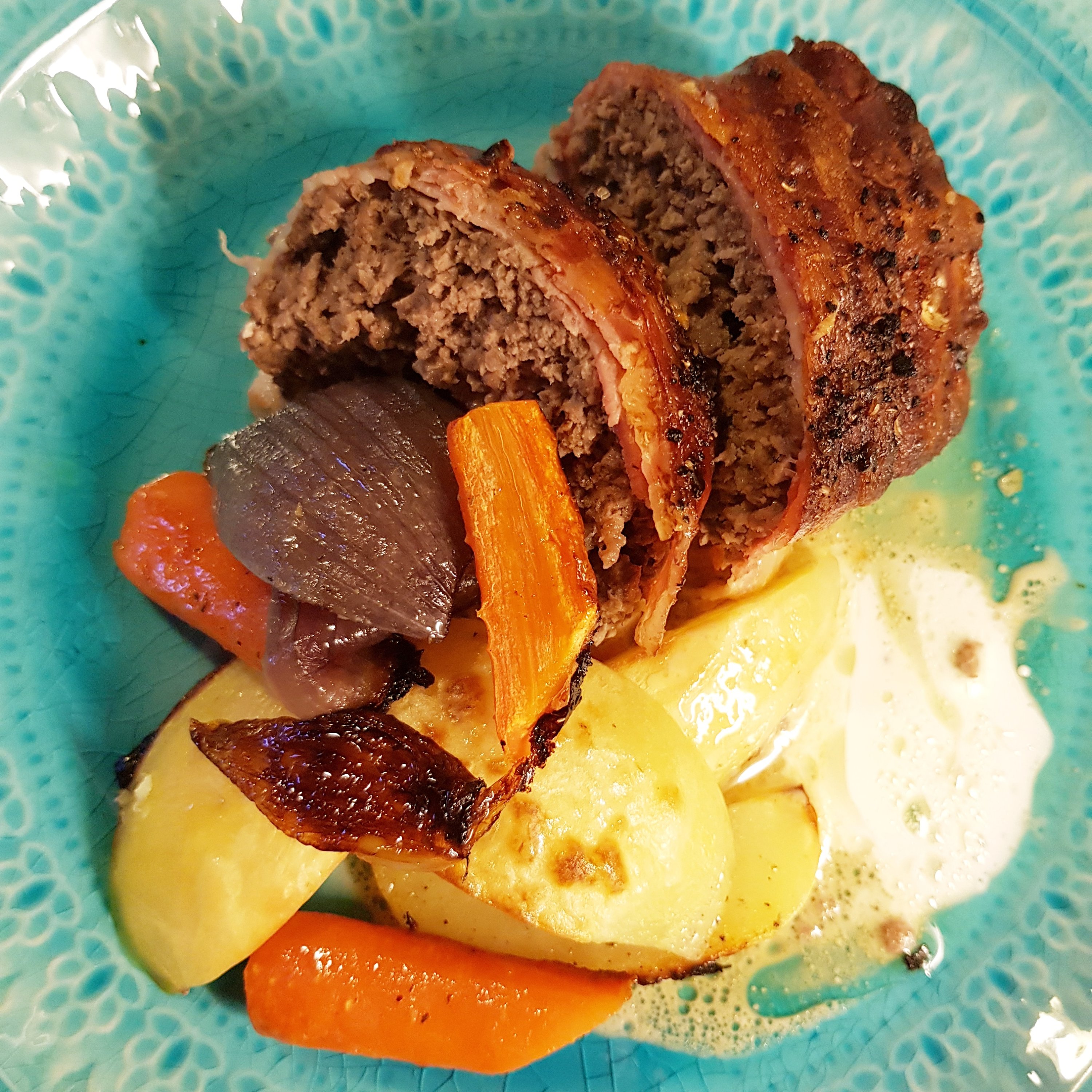Baconlindad högrevslimpa med ugnsrostad potatis och grönsaker som serveras på gräddsky. Det här är inget komplicerat alls.