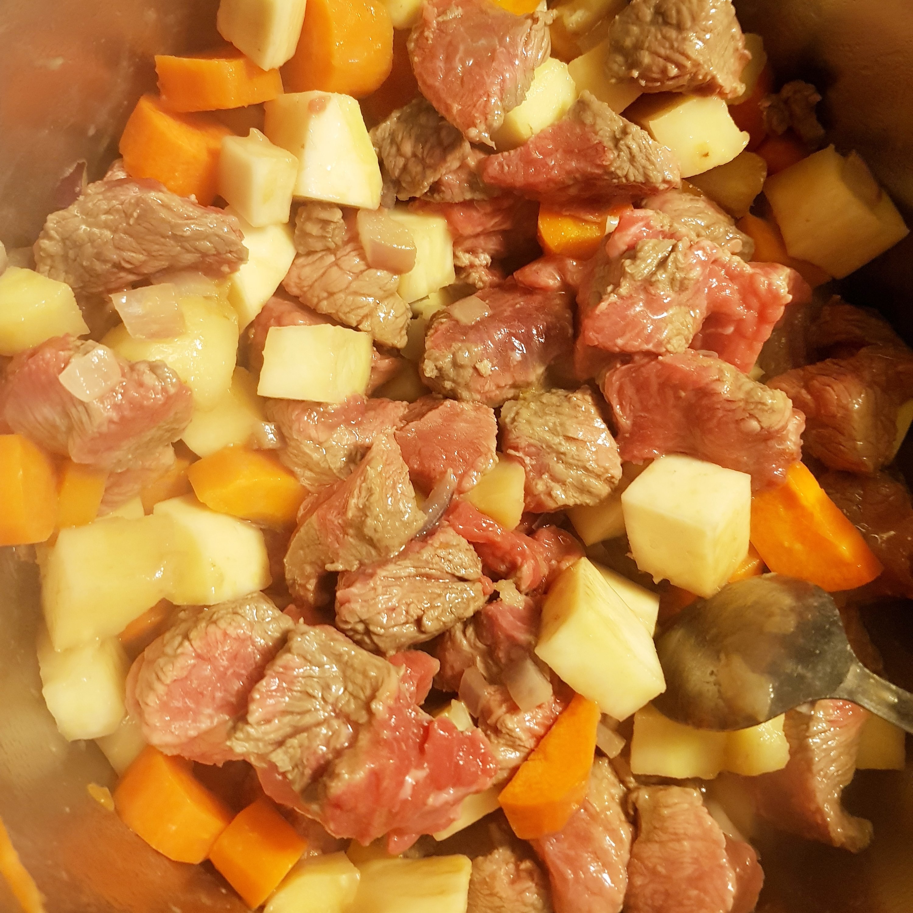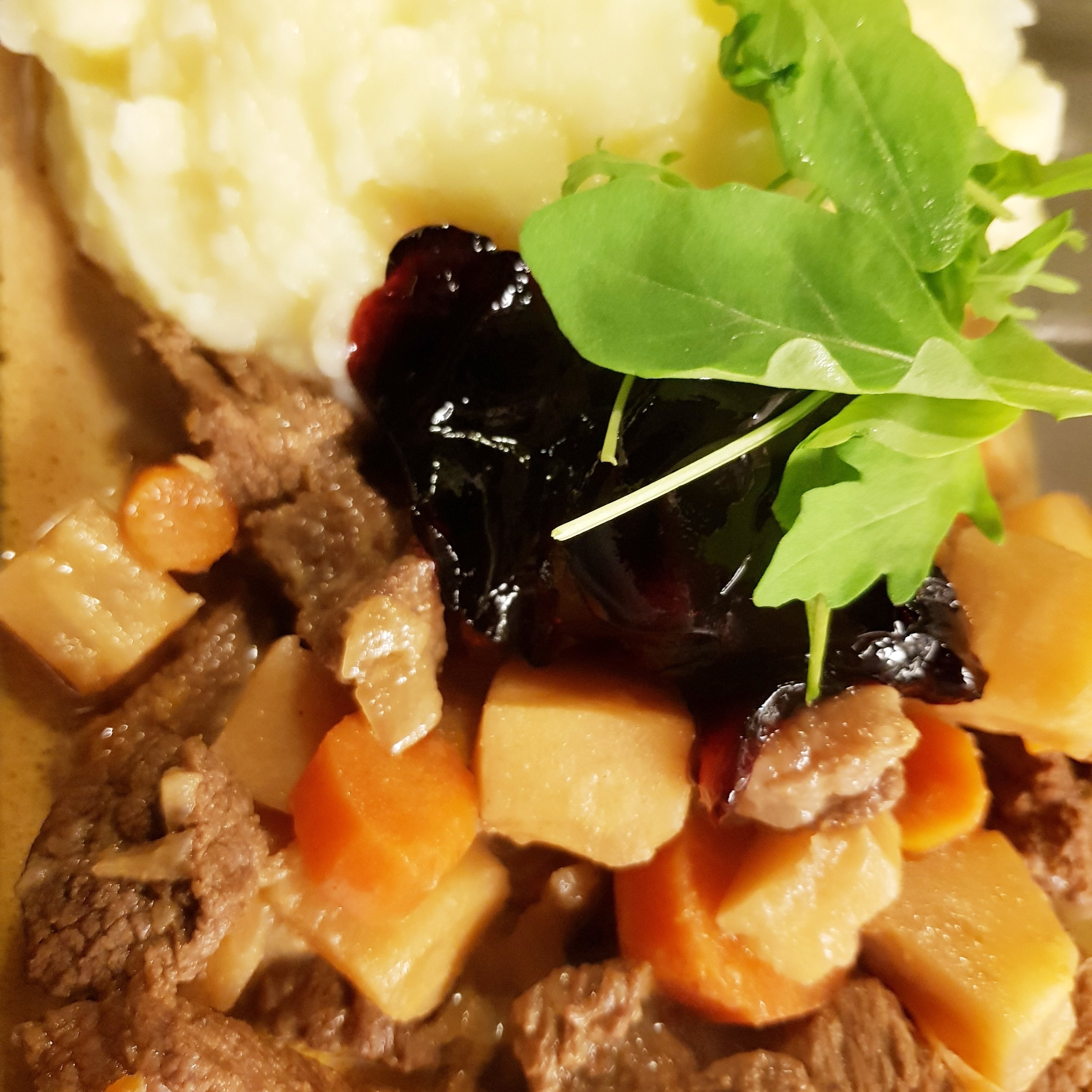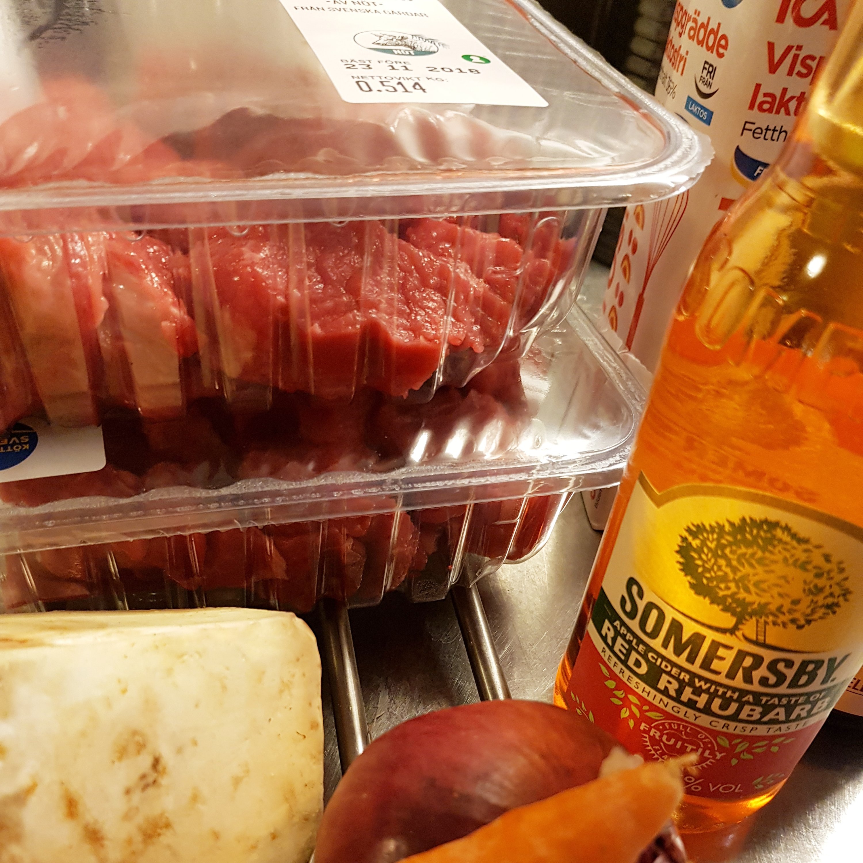 Cutta ner högrevsbitar och krydda. Finhacka schalottenlök och smörstek tillsammans med köttet. Tvätta och skala rotsakerna som du hackar ner i enkronaform i en kastrull som där fylld med smör. Ner med grönsakerna, i med köttet och löken, på över fond (bong) julmust, rabarber cider och grädde. Låt det koka upp och den sjuda i 3-4 timmar. Det går bra att ersätta julmusten med Enbärs Must i från Svenskt Mathantverk.