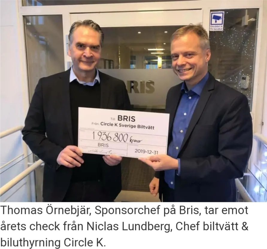 – Vi är väldigt stolta över hur mycket pengar vi tillsammans med våra kunder har samlat in till Bris viktiga arbete. Det här visar att vårt samarbete ligger både våra kunder och medarbetare varmt om hjärtat. Jag vill rikta ett stort tack till alla som har varit med och bidragit, säger Niclas Lundberg, Chef biltvätt och biluthyrning Circle K Sverige.
