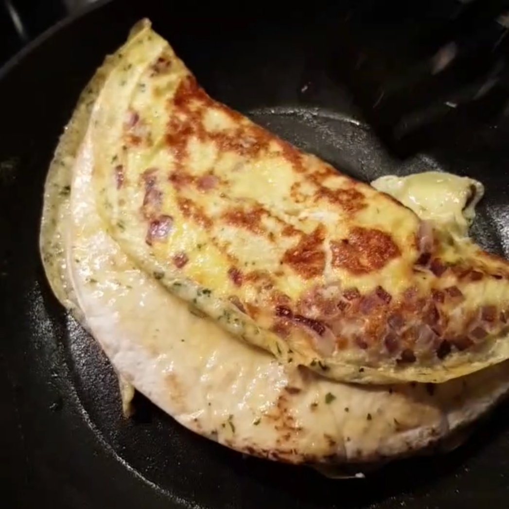 Häll ner smeten över löken i pannan och låt det sätta sig, lägg över ett tortillabröd, ta en tallrik och vänd så ena biten på brödet där en gyllenbrun färg.