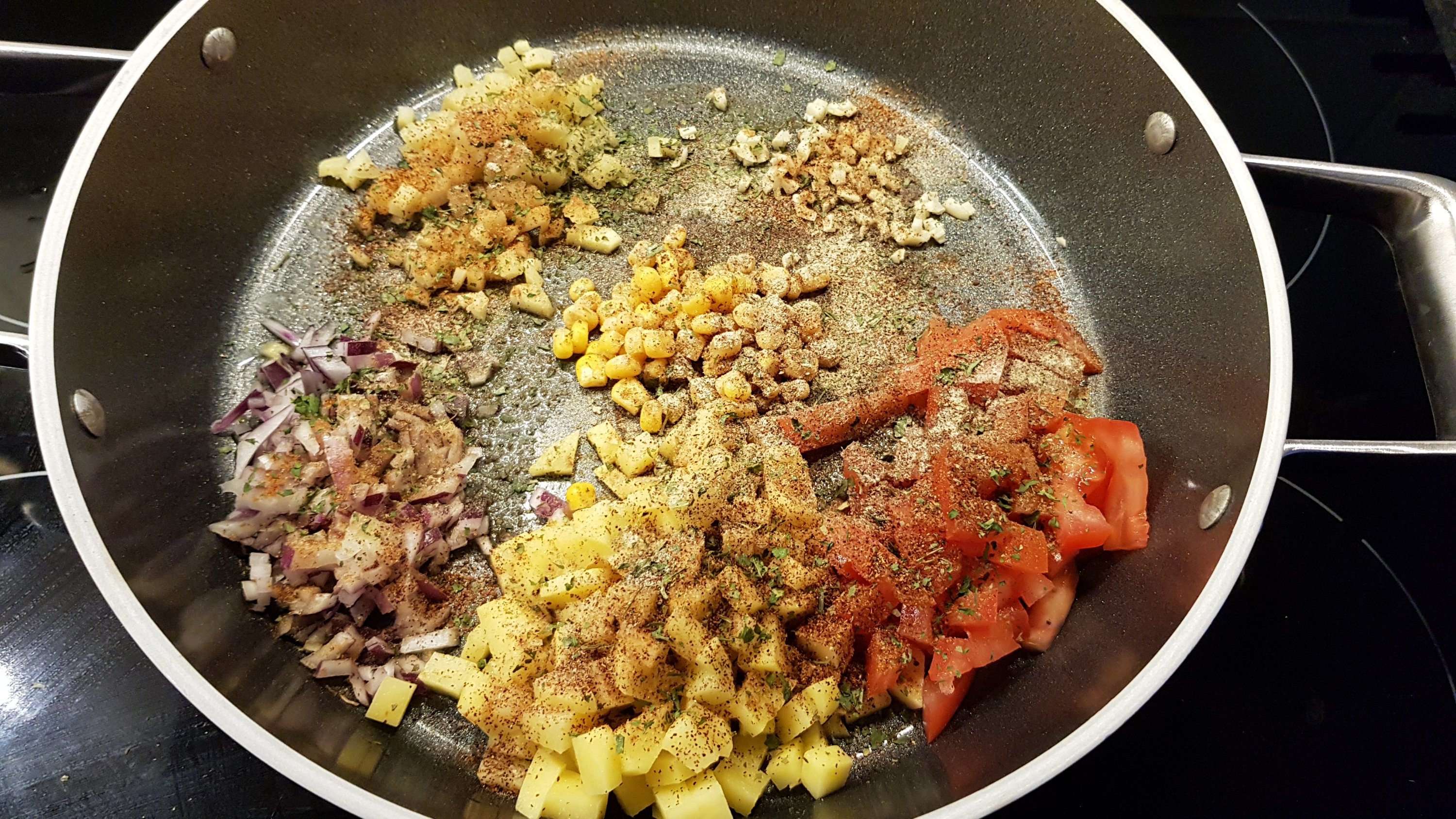 Finhacka rödlök eller annan lök, ingefära, chili, potatis, tomat och häll ner en burk majs, stek ihop med olja eller smör. Stek runt i ca 5 min och häll ner en skvätt whisky, krydda med salt, vitpeppar, cayennepeppar och persilja.