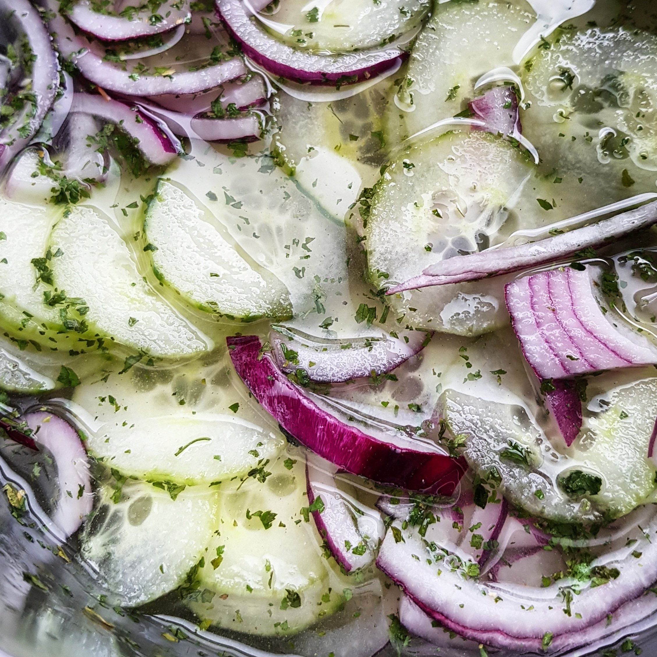 Skala gurka och rödlök, skiva med osthyvel. Koka upp ättika och vatten tillsammans med salt och tills det löst sig. Lägg skivorna av lök och gurka i en glasburk och slå på lagen, rör om med vitpeppar och persilja. Smaka av och låt stå i kyl.