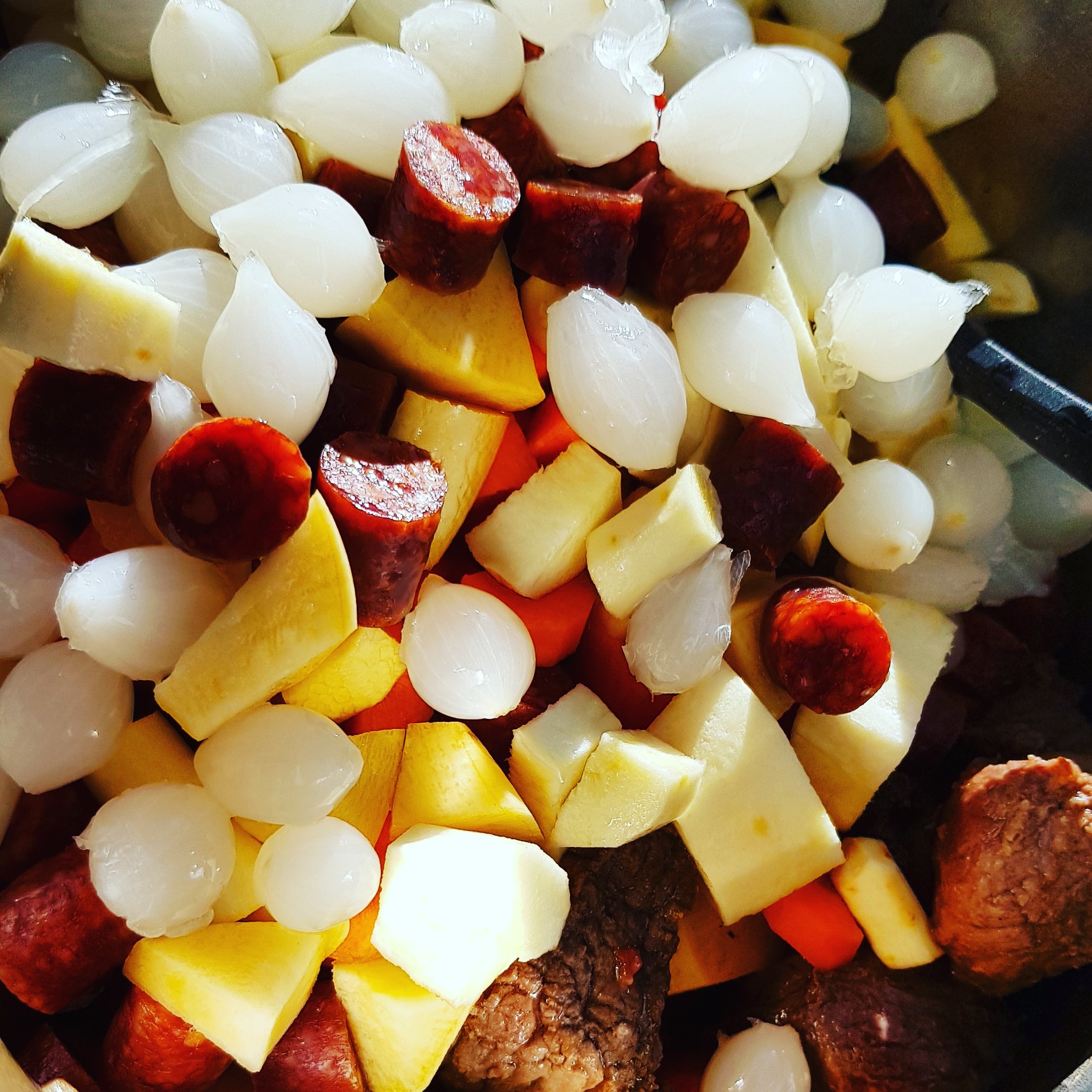 Skölj och skala allt som går att skala. Finhacka lök och stek i laktosfritt smör, ner med högrevsbitar, stek och i med grönsakerna, krydda, smaka av och ner med allt i en gryta. Rör om, häll ner öl, krydda, smaka av och låt det koka upp, sjud samman allt, tillsätt grädde och gelé. Låt det sjuda mellan 3-4 timmar och servera med ris, potatis eller en bit baguette med ett gott glas rött eller en iskall Ipa.