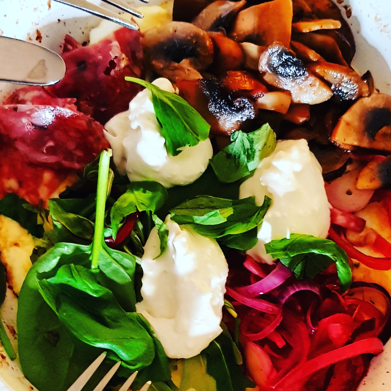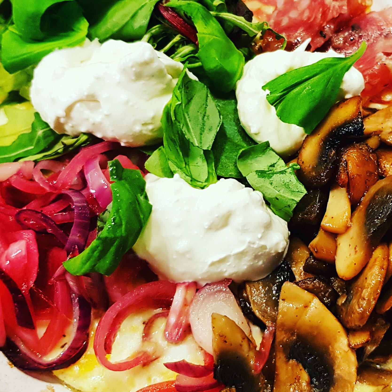 Jag har tillagat en matigare laktosfri omelett med stekt picklad rödlök, vitlöksfrästa champinjoner, halverad tryffelsalami och fetaostcreme med basilika.
