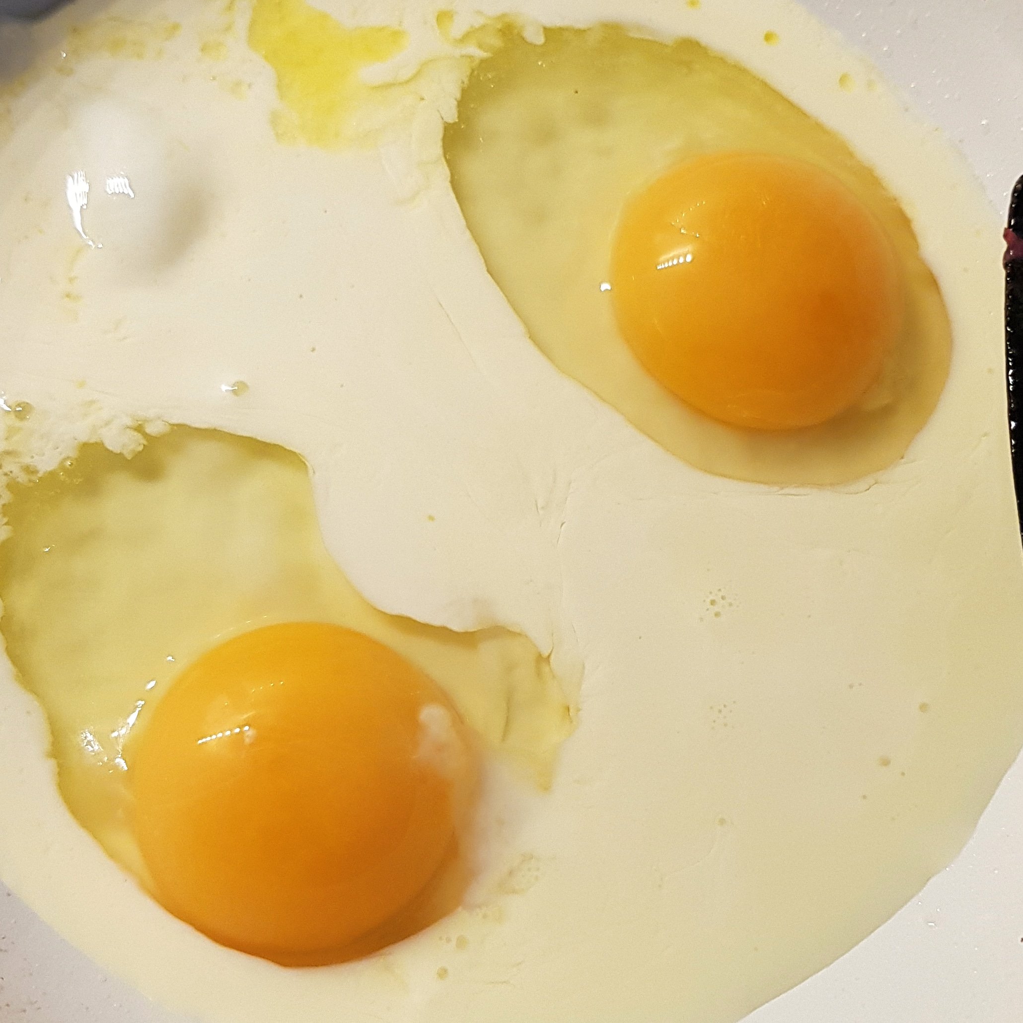 Knäck ägg direkt i pannan och häll över en skvätt laktosfri grädde med kryddor. Det blir en härlig krämig yta och en fast botten.