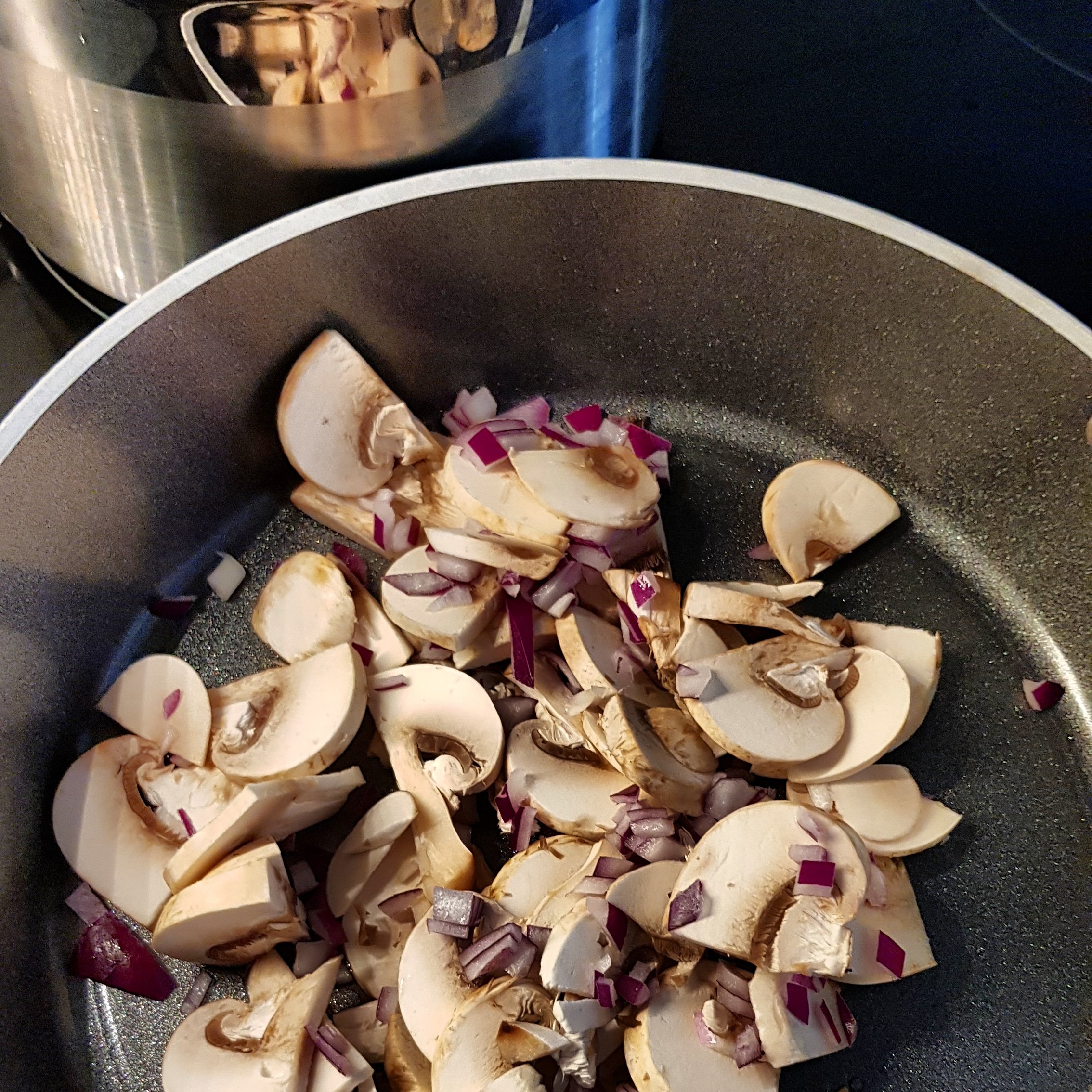 Finhacka lök och halvsingla champinjoner. Stek på högvärme medans du tärnar kycklingen. I med kyckling, stek och krydda. Tryck ut en klick tomatpuré, rör om och blanda ner grädde och cremé fraiche. Smaka av och tillsätt salt?