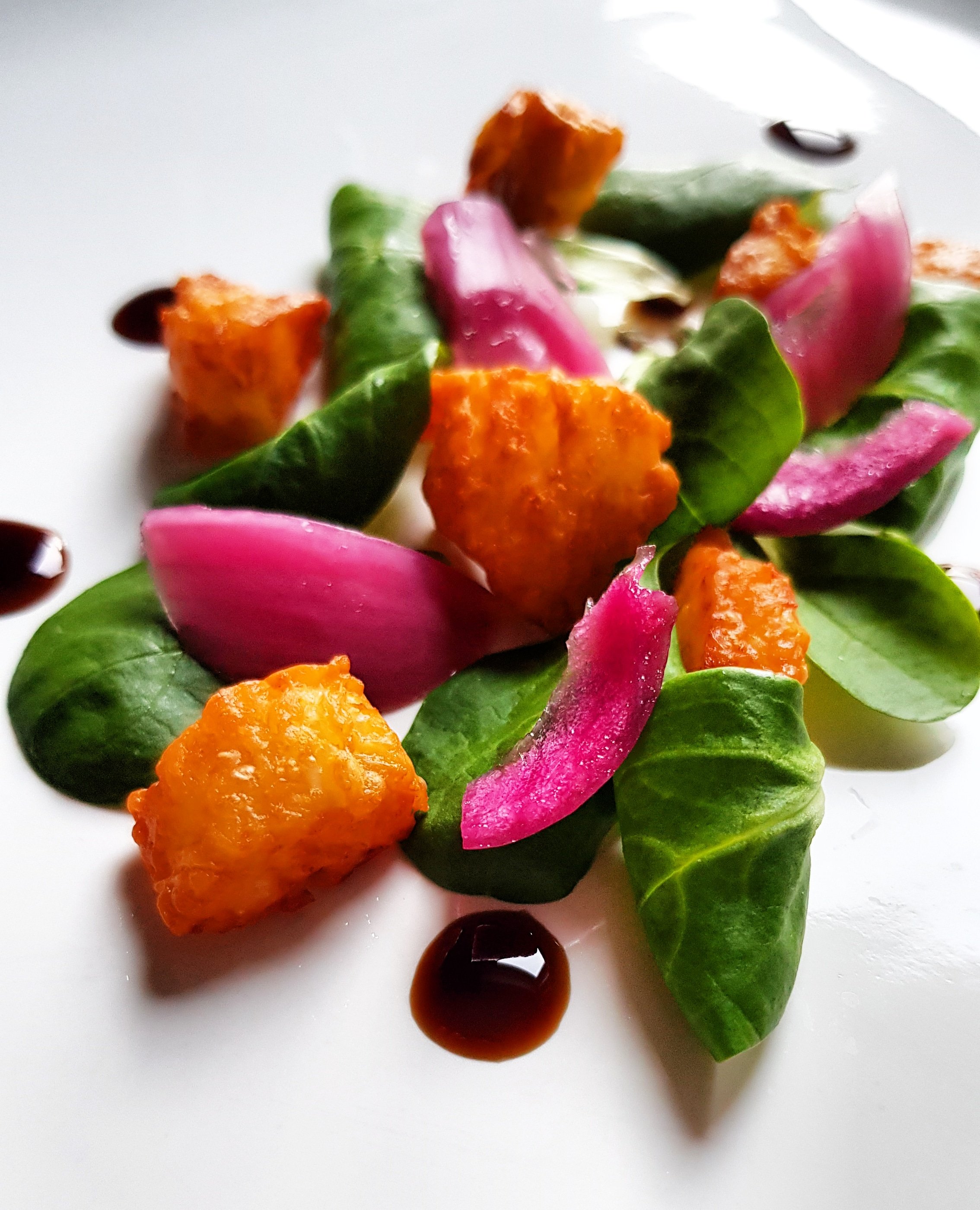 Servera med manchésallad som är nötig men ändå rätt mild och passande till sältan och sötma från picklad rödlök och en liten balsamicoripel för färgen.