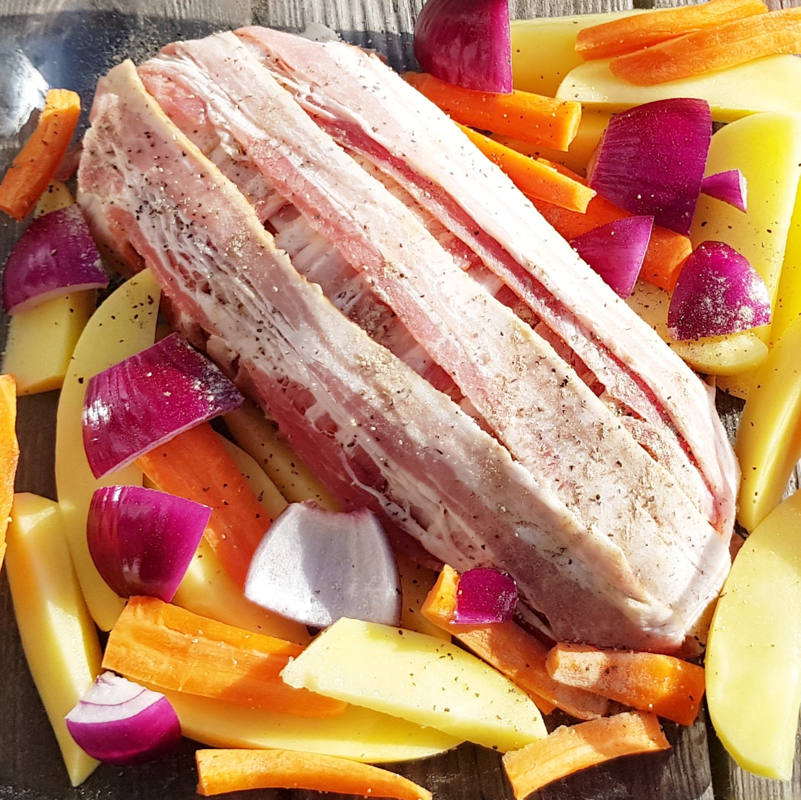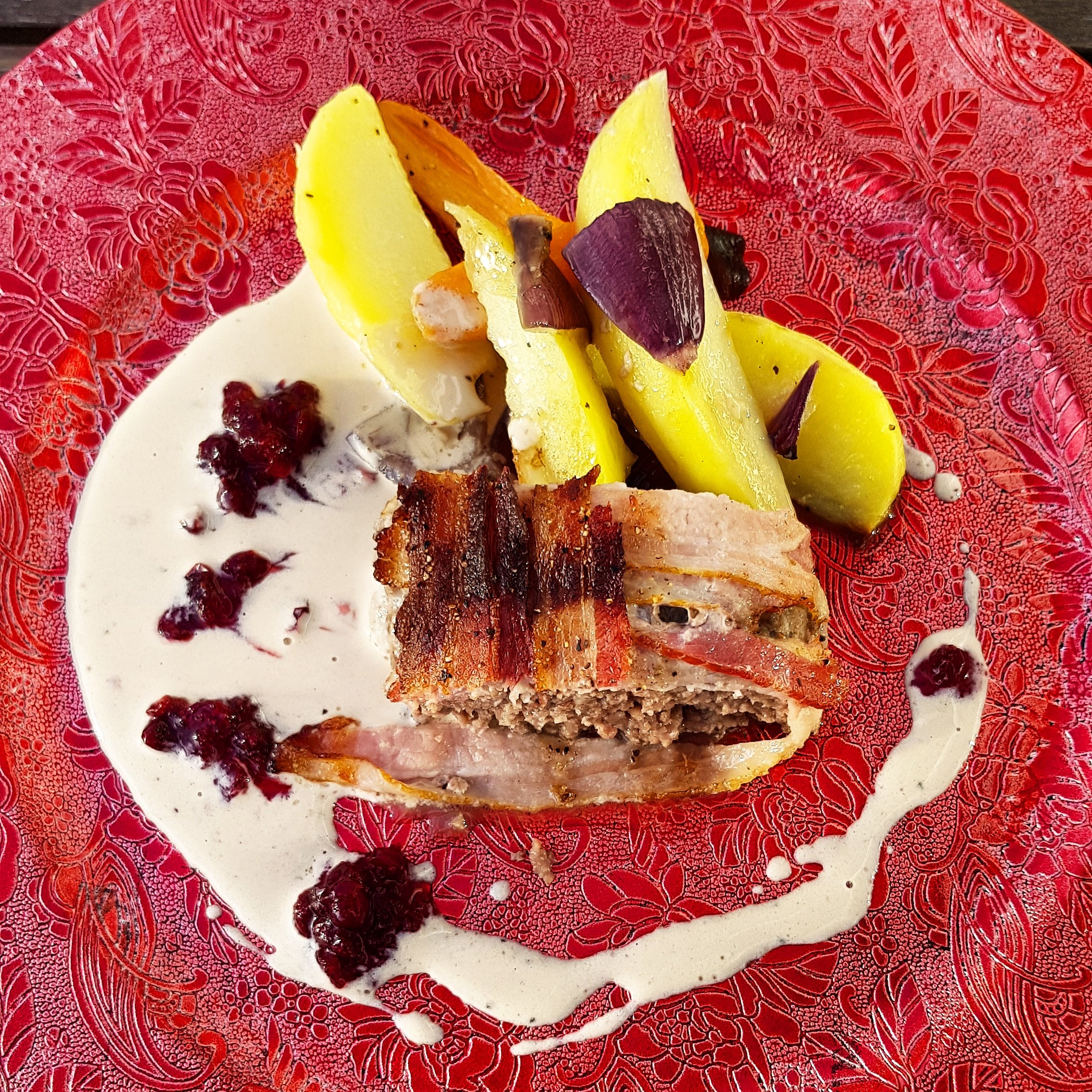 Rör ihop allt till en jämn konsistens, forma en form med smör och forma färsen till en limpa och lägg över bacon om det önskas. In i ugnen på 220 grader i ca 40 min.