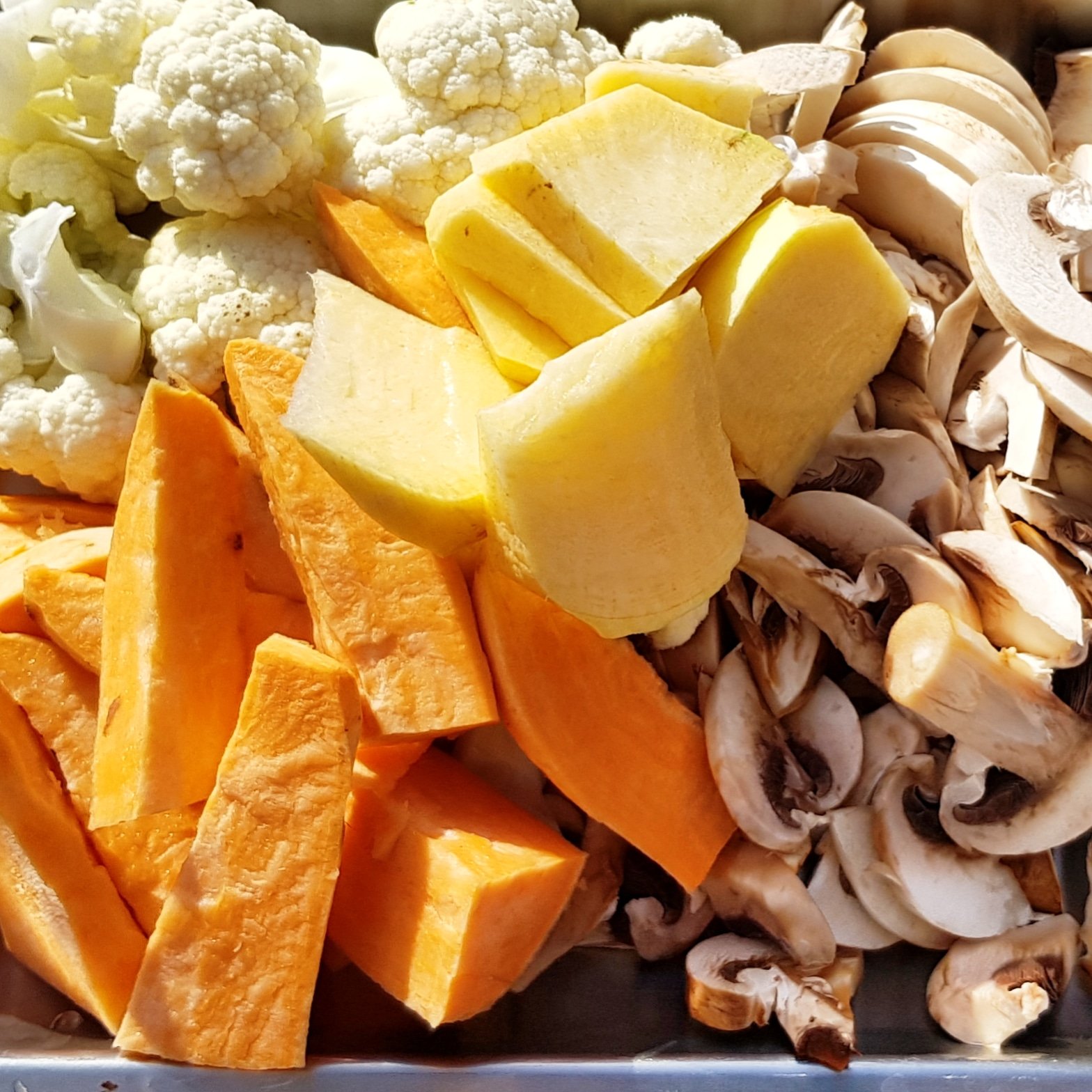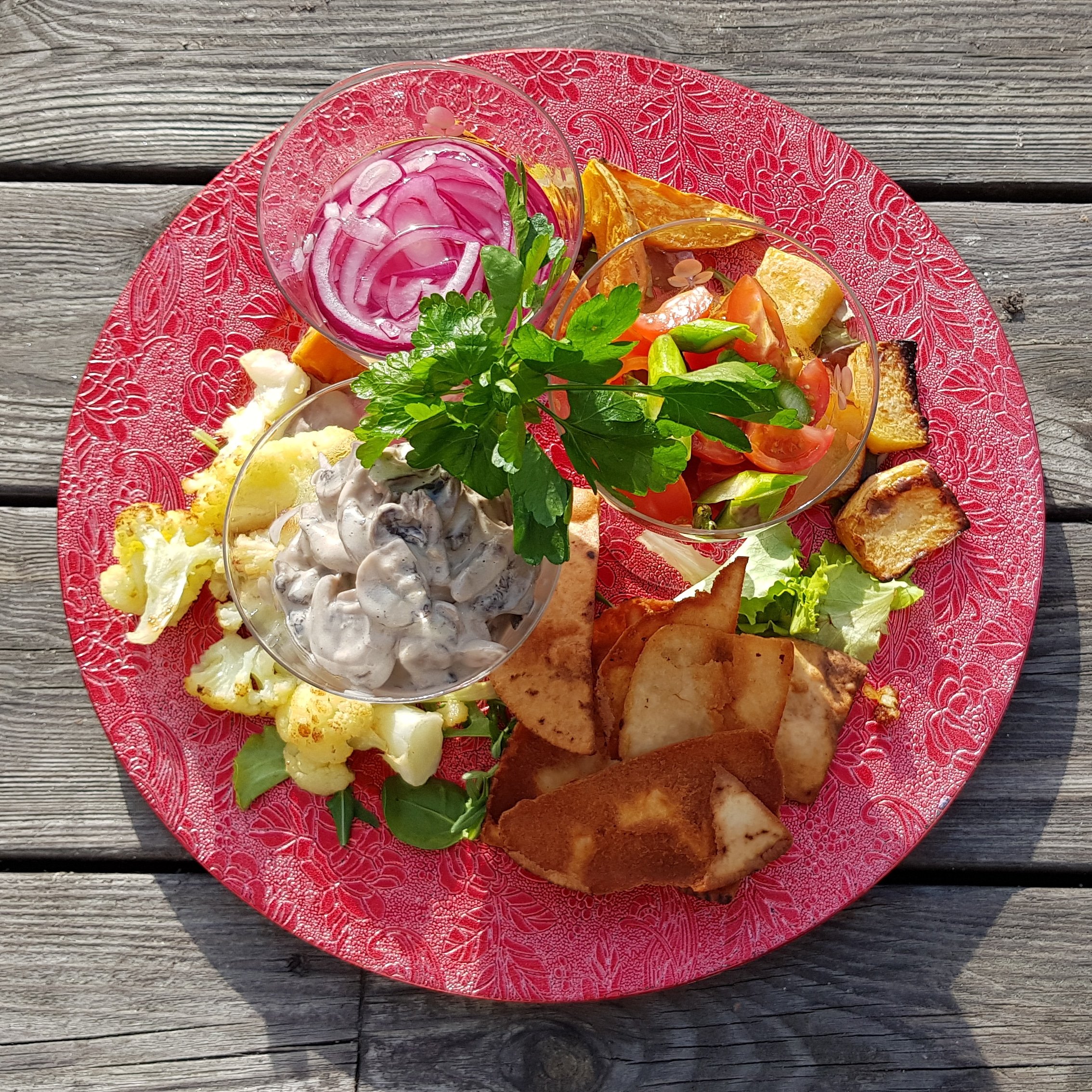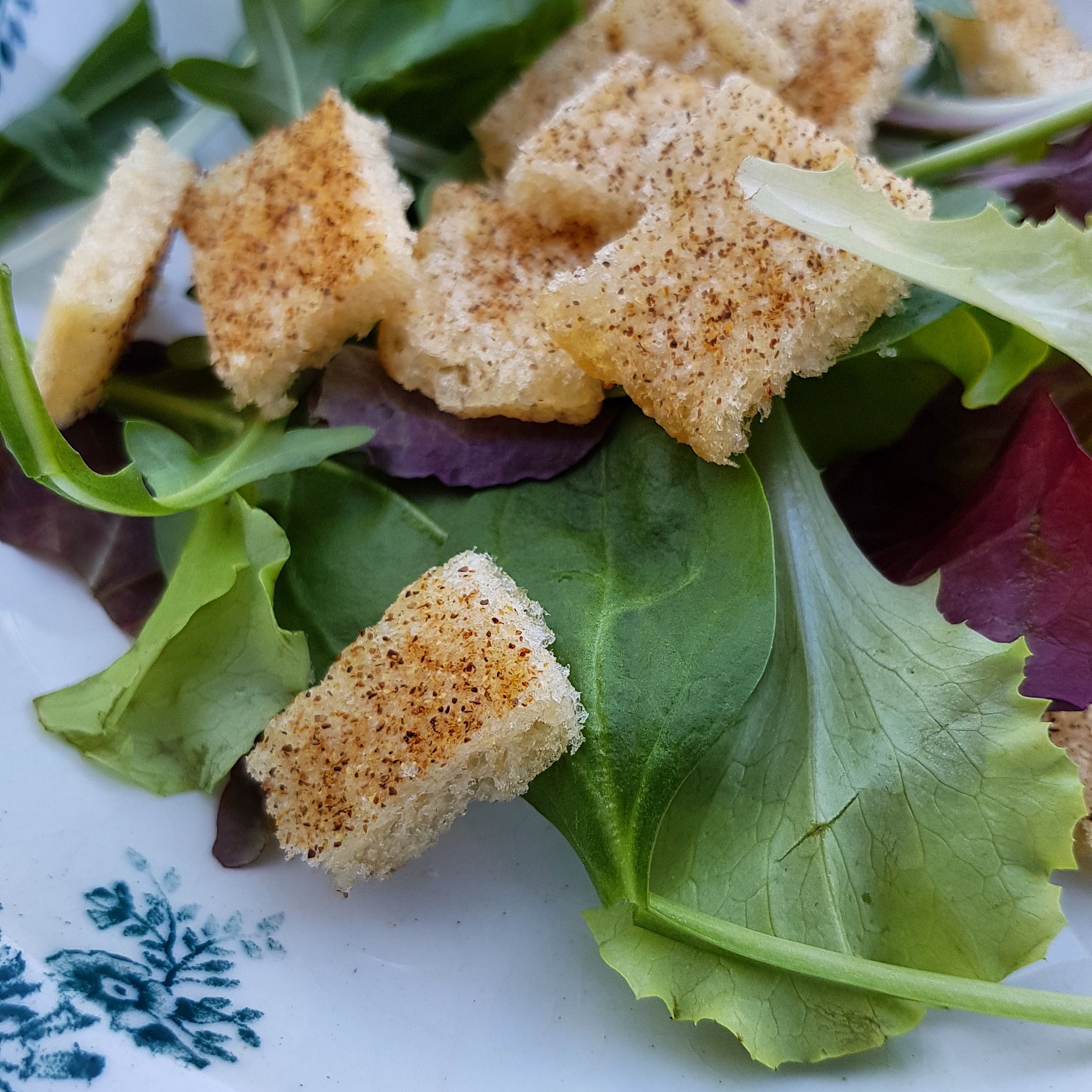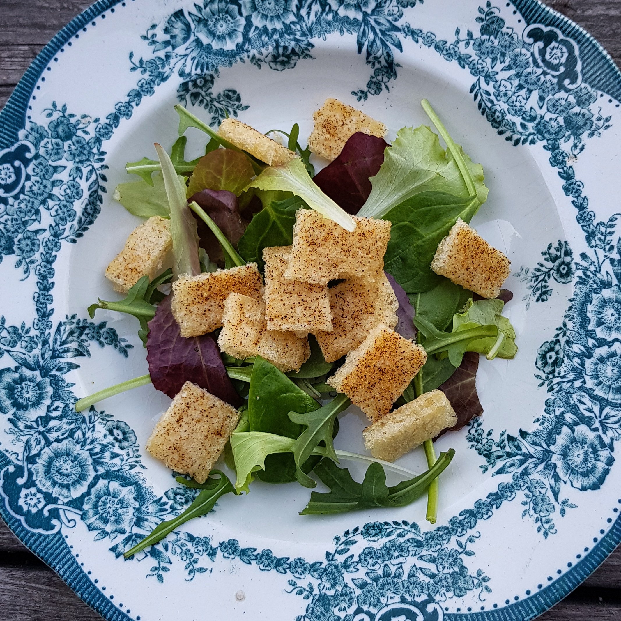 Ugnsrostad krutonger på majsbröd, salt, chili och Cayennepeppar som passar till en härlig sommarsallad.Champinjonröra, friterad blomkål, rostad kålrot, ugnsstekt sötpotatis, picklad rödlök, citronmarinerad grönsparris med cocktailtomater som serveras med en glutenfri Daura. Gott och friskt men många olika smaker.