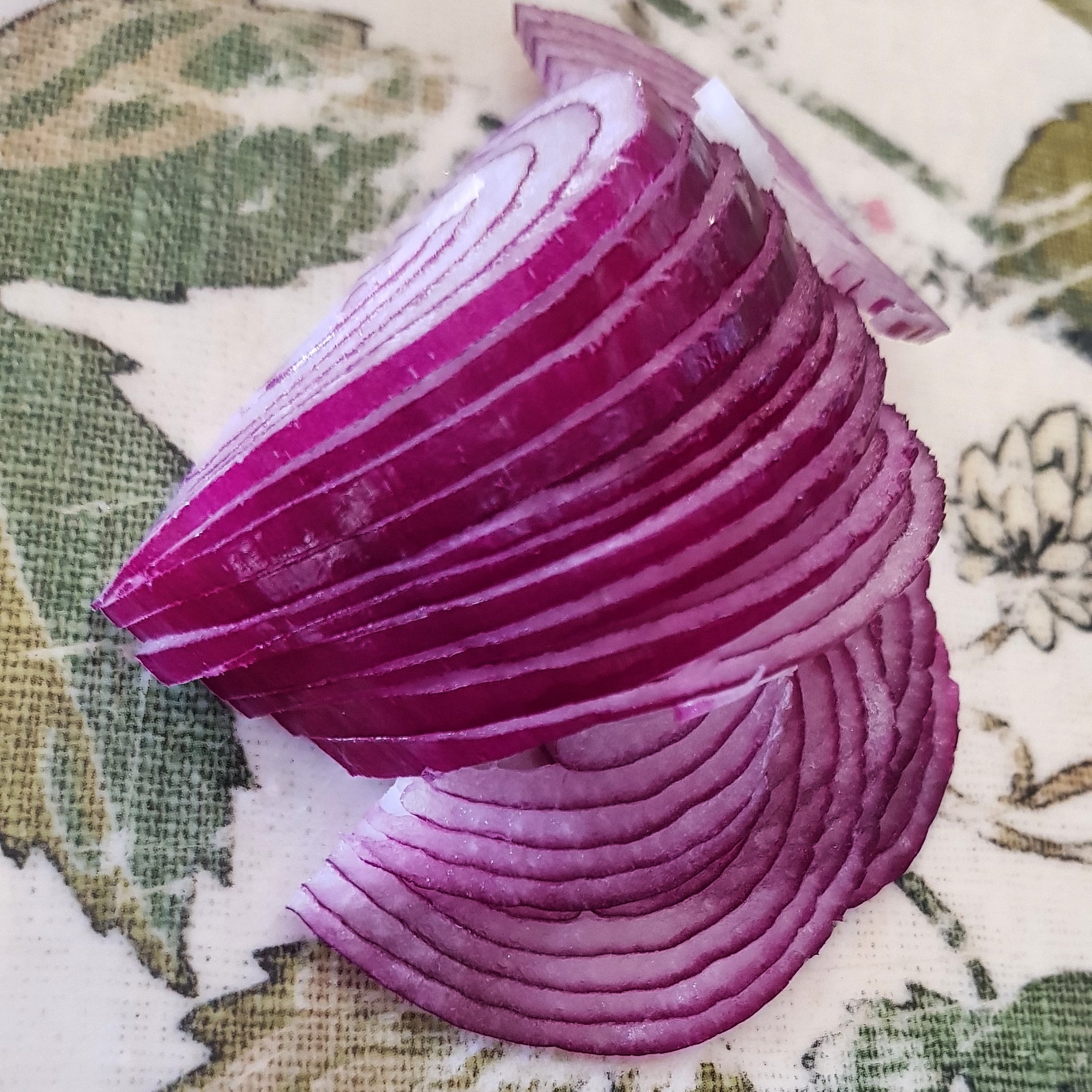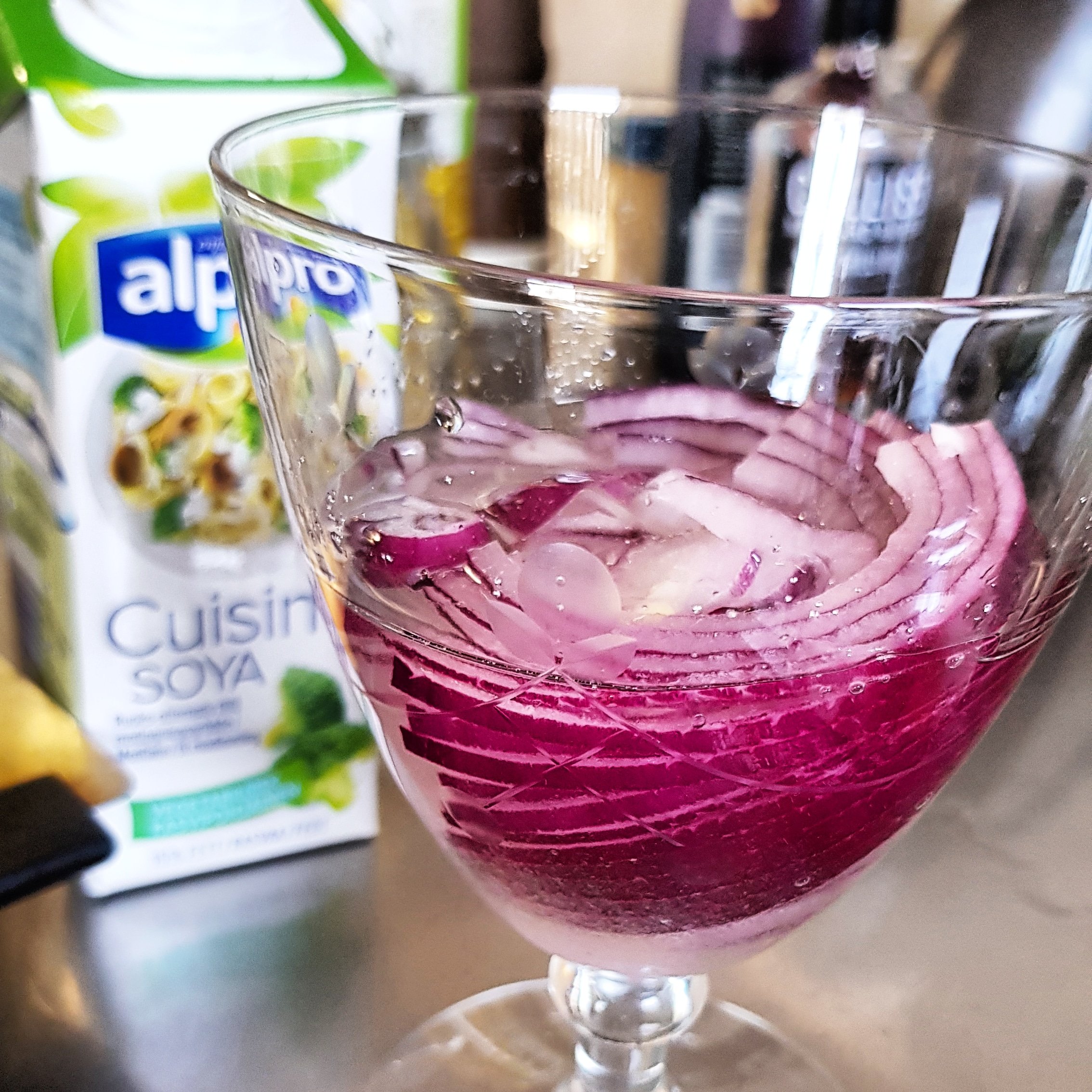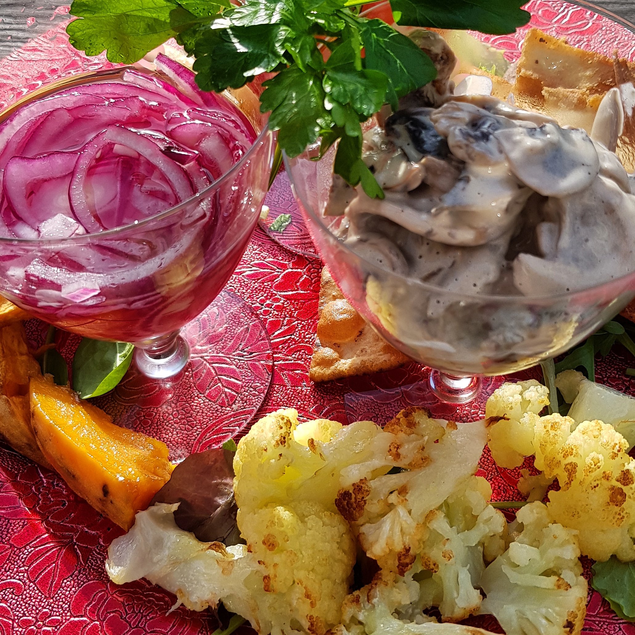 Picklad rödlök. 123 lag (lika recept som inlagd)Citronmarinerad sparris och cocktailtomater.Bilderna kommer lite i fel ordning men här är rester på friterad gluten och veganbröd med socker, kanel och kardemumma som passar bra till kaffe efter maten.