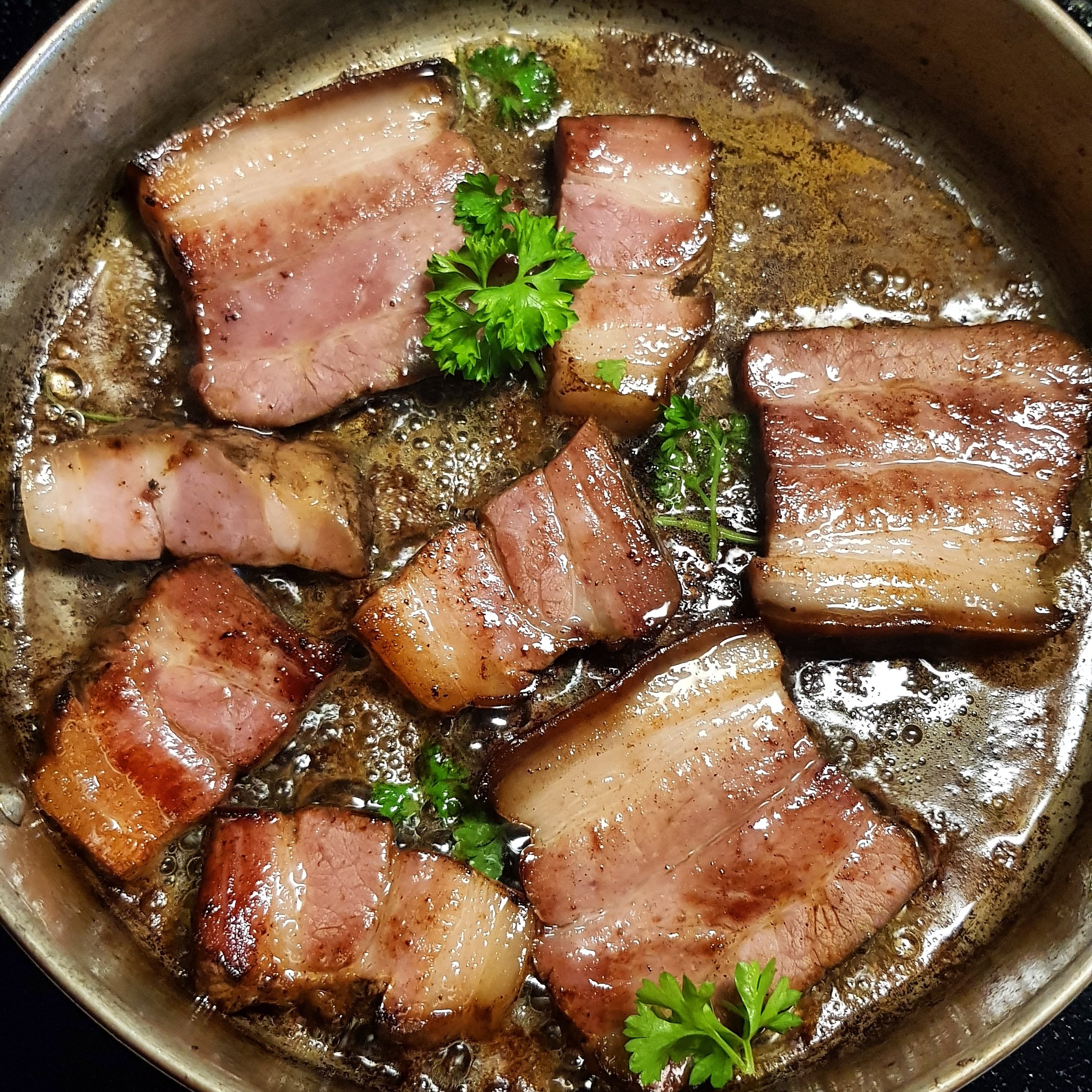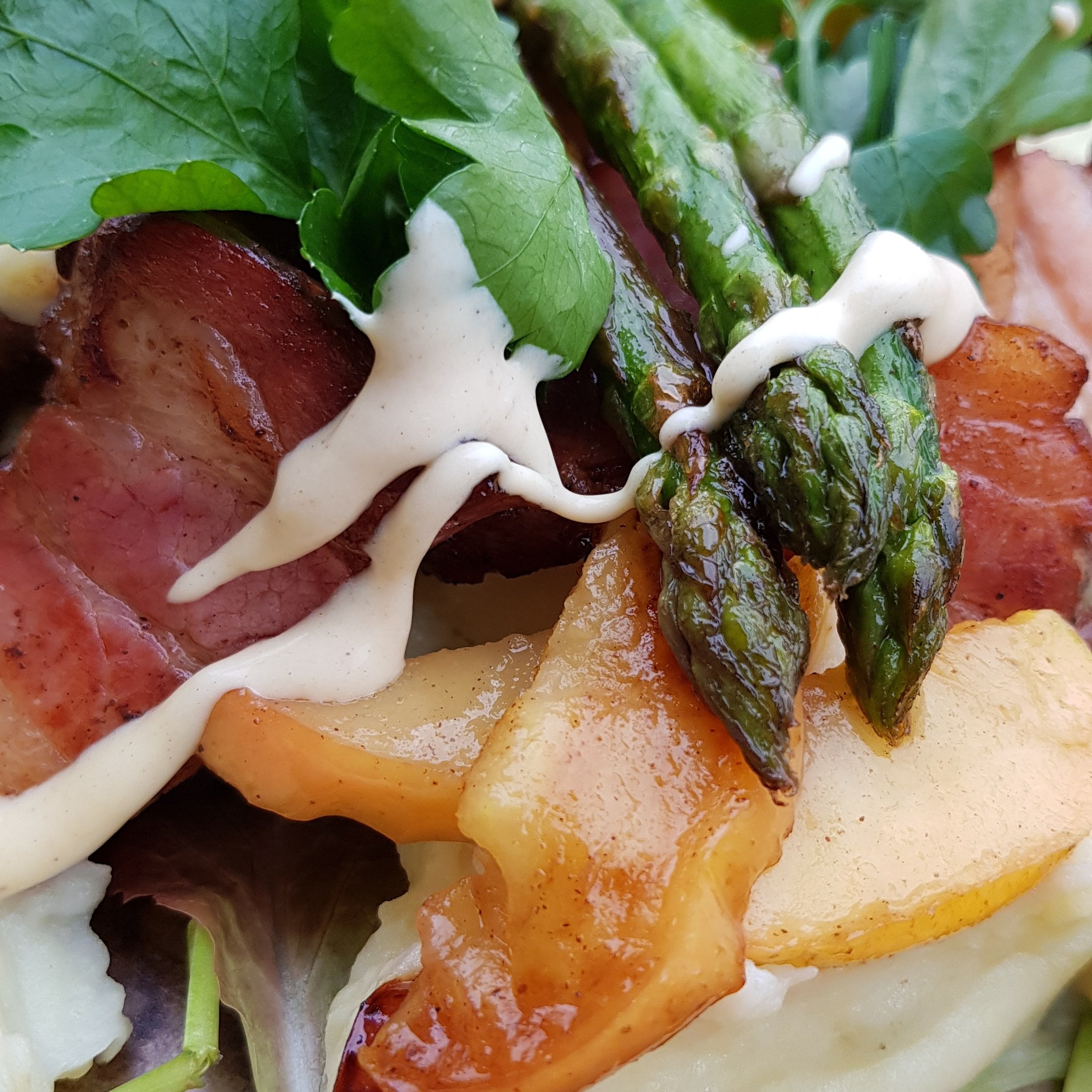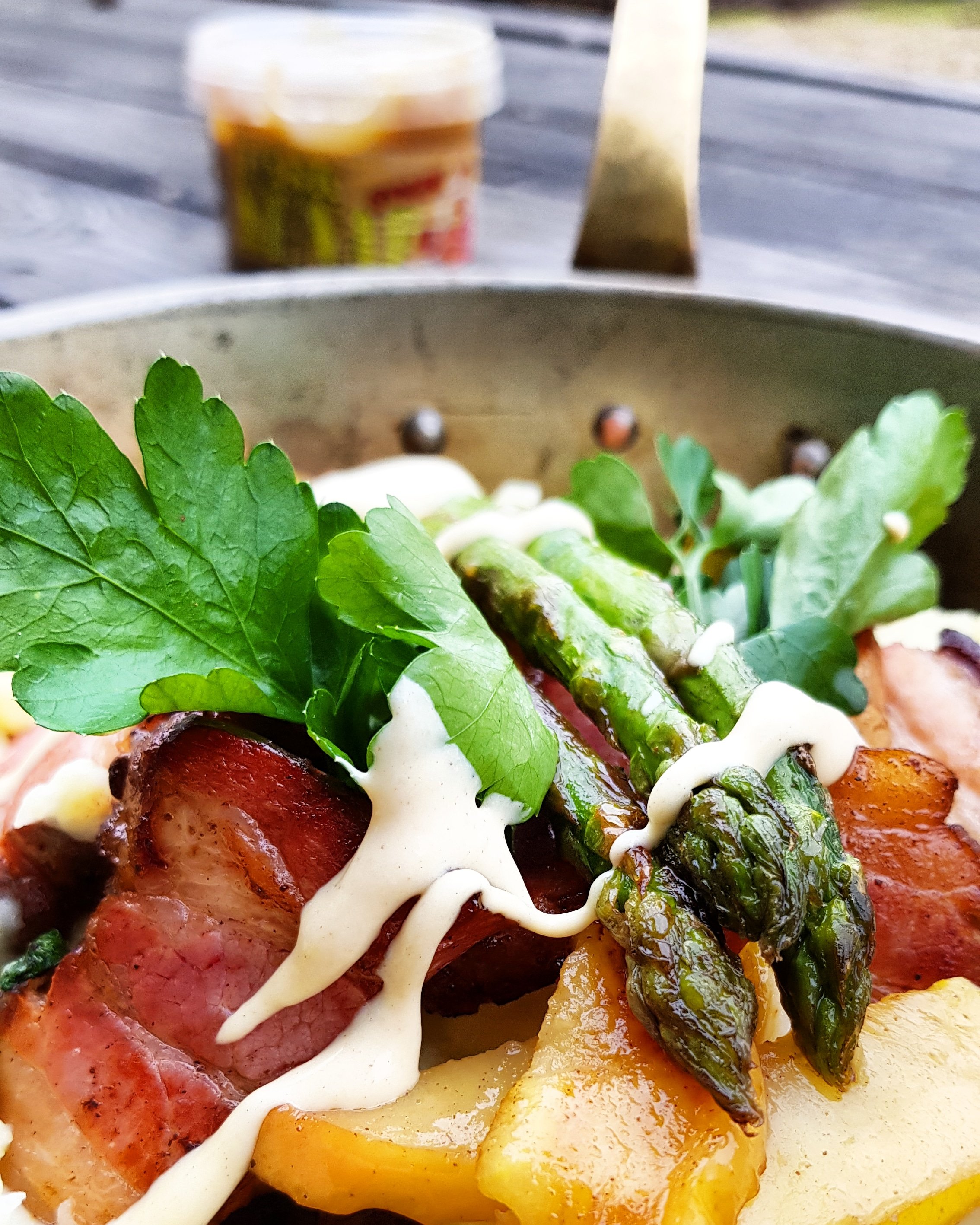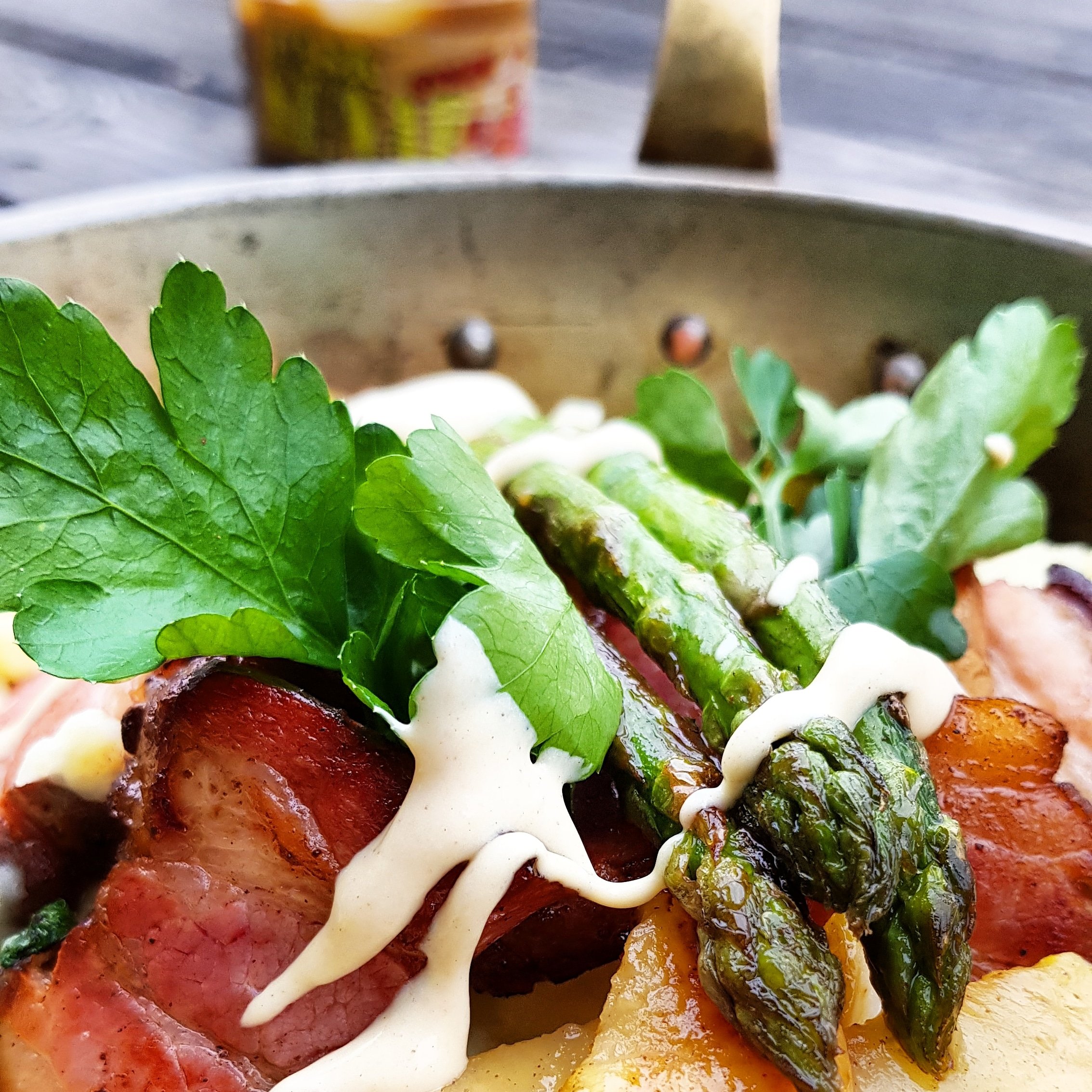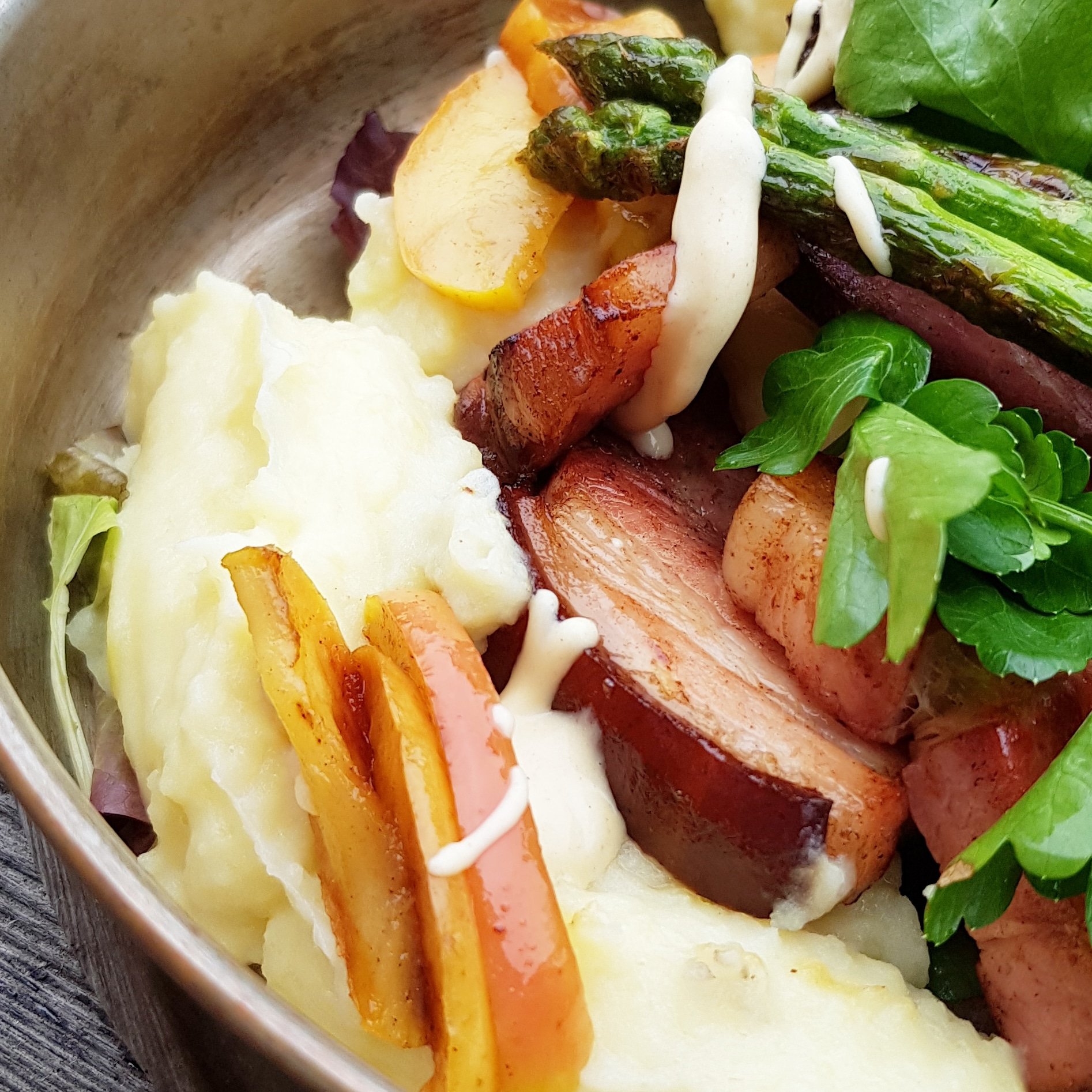 Det gick bli stekt rökt skinka från Vilhelmina till middag. Köttet har fått stekas smör. Äppelhalvorna har fått sjuda i socker och vatten för att senare stekas med lite salt och vitpeppar. Potatismos med salt, grädde och smör. Svårare än så behöver det inte vara. En perfekt sås på starksenap från Johnnys, laktosfri cremé fraiche, salt, lite chili och peppar som toppas med stekt sparris.