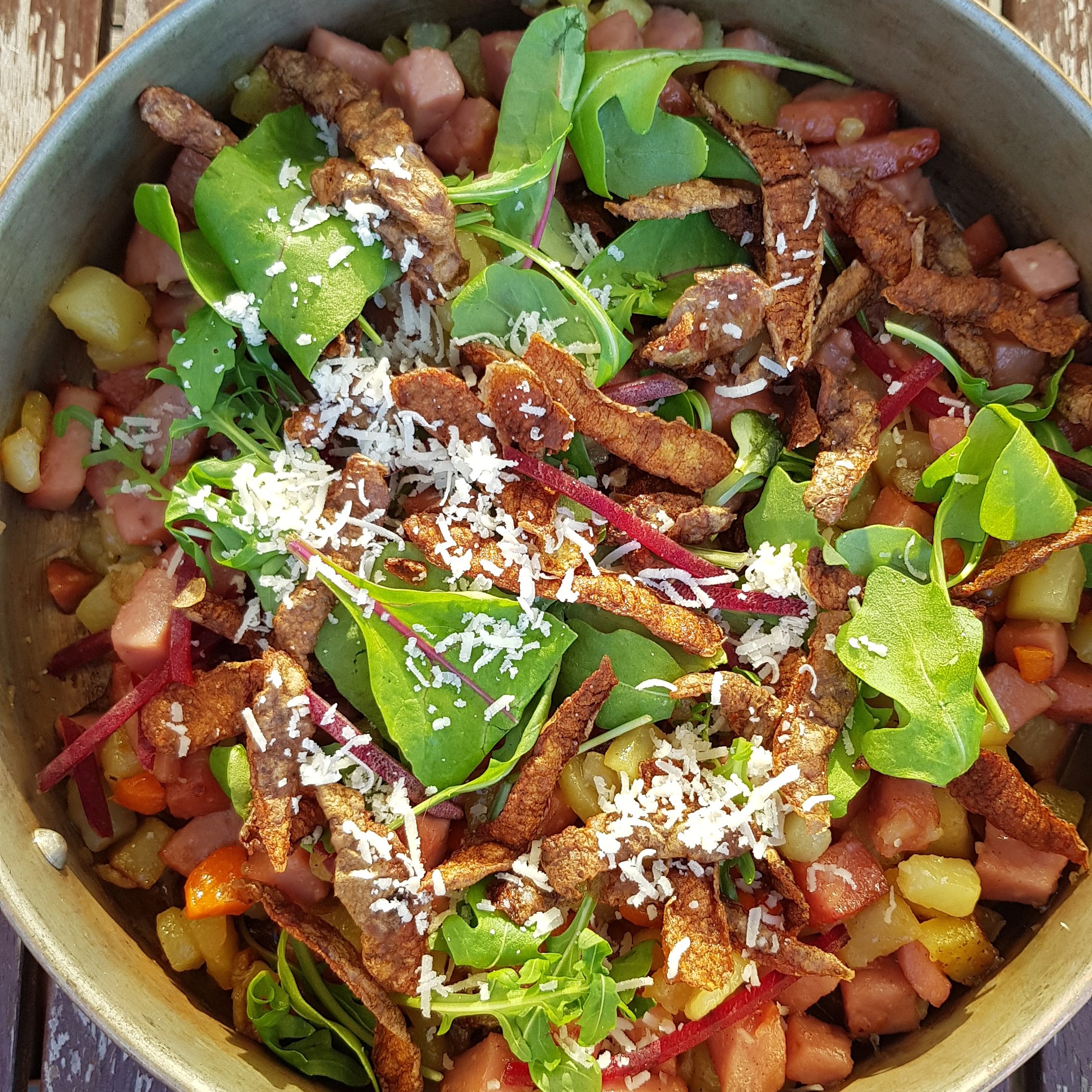 Vanligtvis brukar jag ha i kött och skinka men det här räckte. Skala och hacka potatis i valfria bitar, tärna korv och lök samt morötter. Stek löken, potatis och morötter ihop, sist i med korven och låt det få sjuda på. Potatisskalet friterar jag till chips och saltar samt river över parmensan.