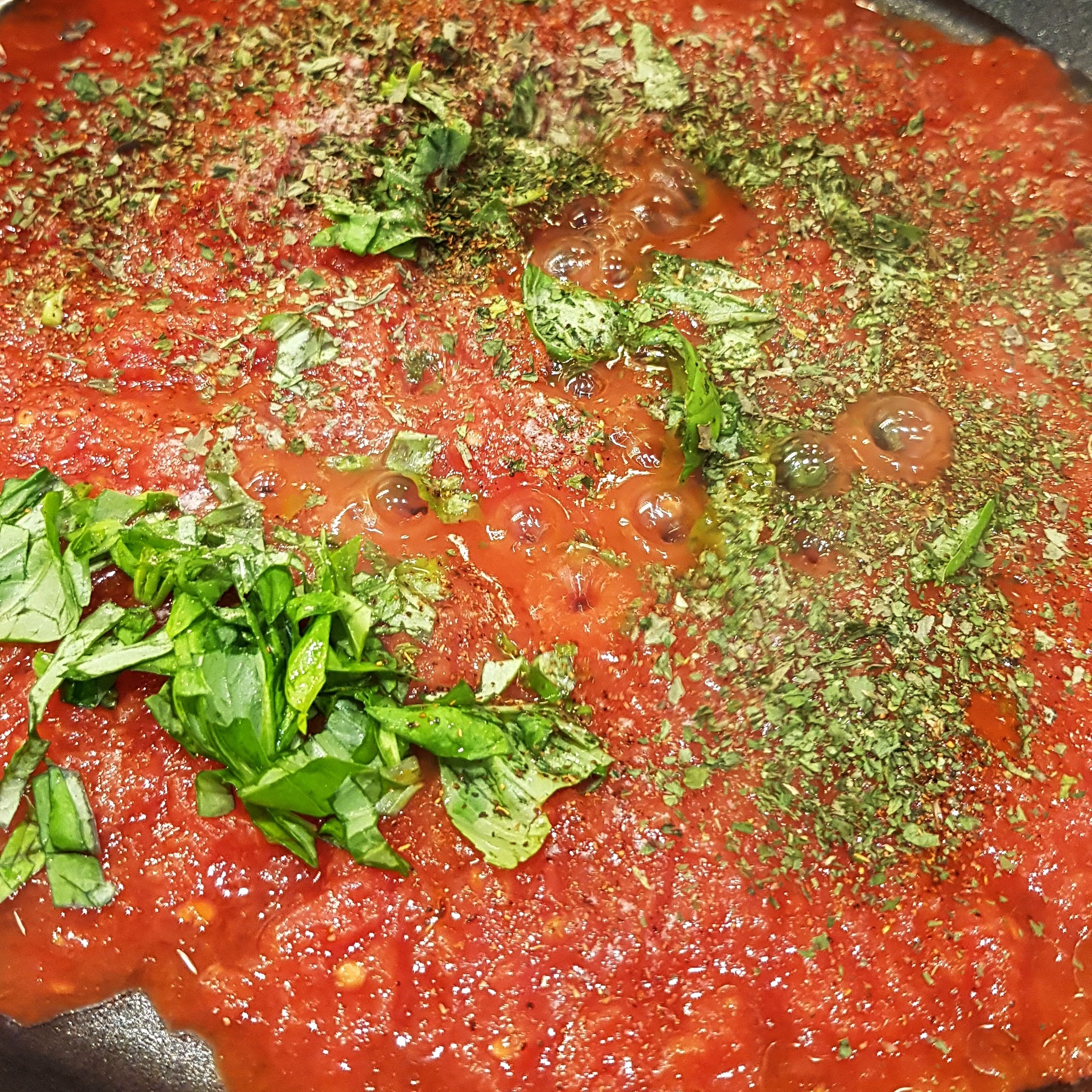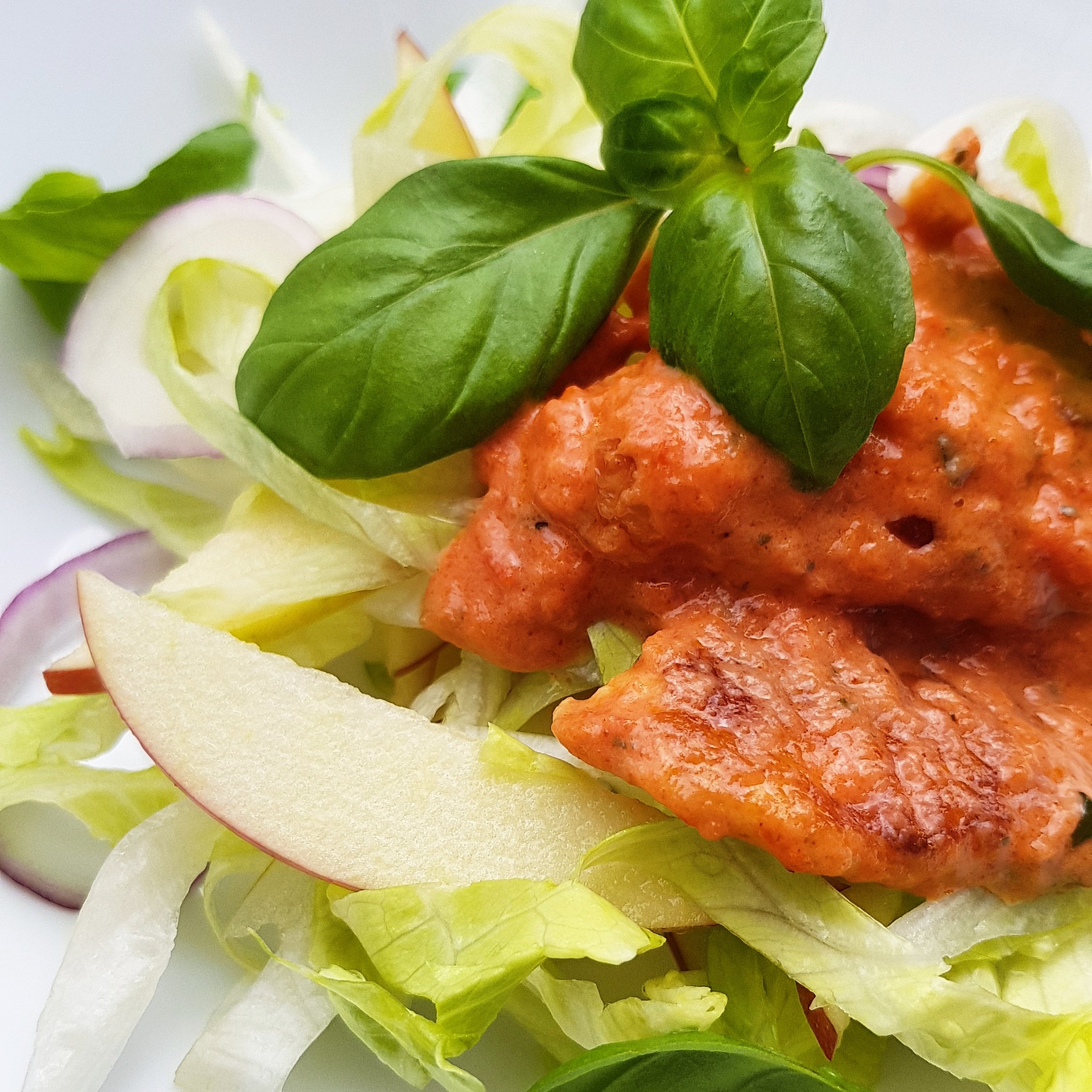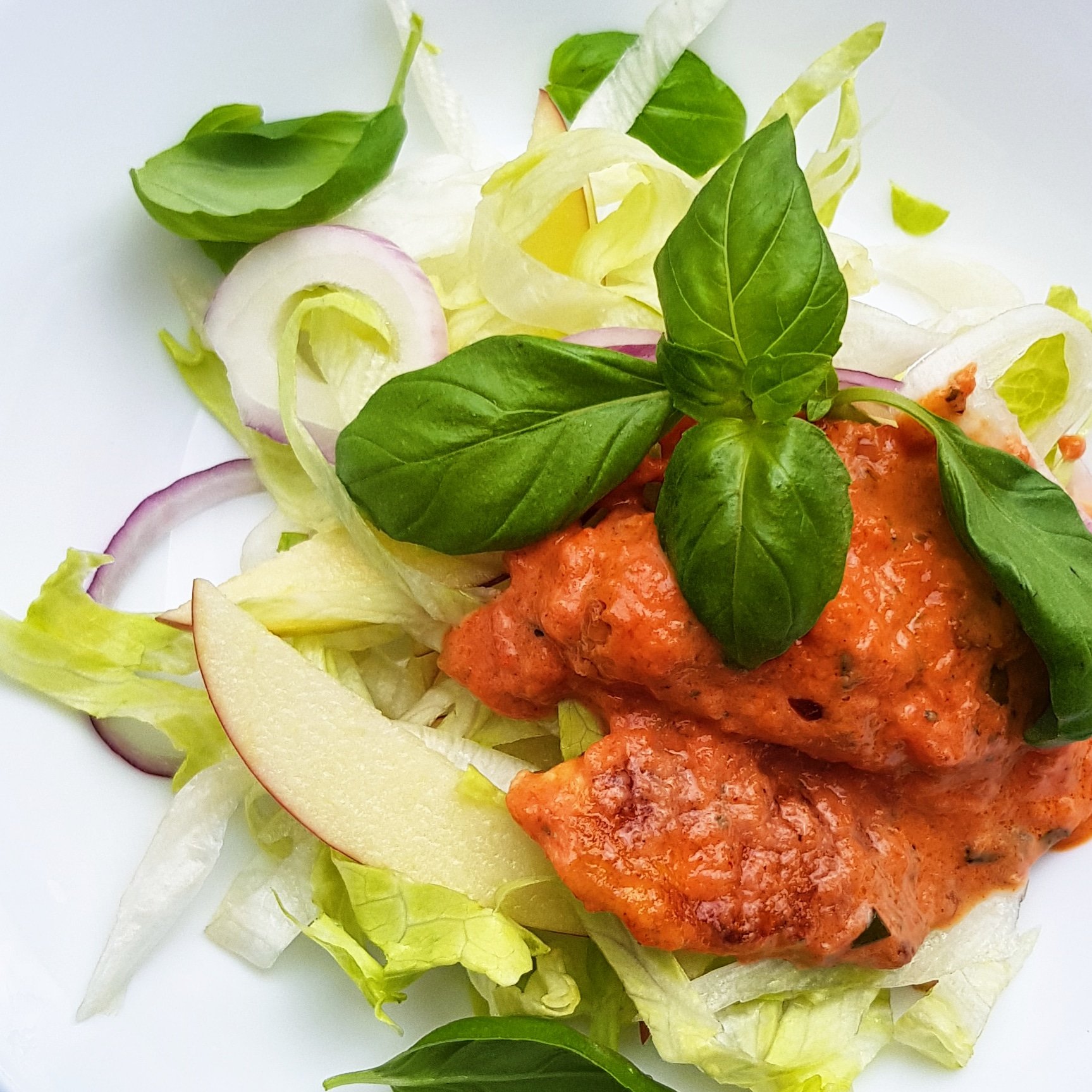 Hallomui skivas efter tycke, koka samman en tomarsås på tomater, tomatpuré, färsk basilika, persilja, vitlök, olja, salt och peppar som får stå och sjuda och koka. Knaperstek osten och häll i såsen samt en skvätt grädde och rör om. Finstrimla isberg och fluffa till en liten pastahög med äpple och rödlök. Toppa med liten valfri dressing i salladen om ni inte tycker såsen från stroganoff räcker.