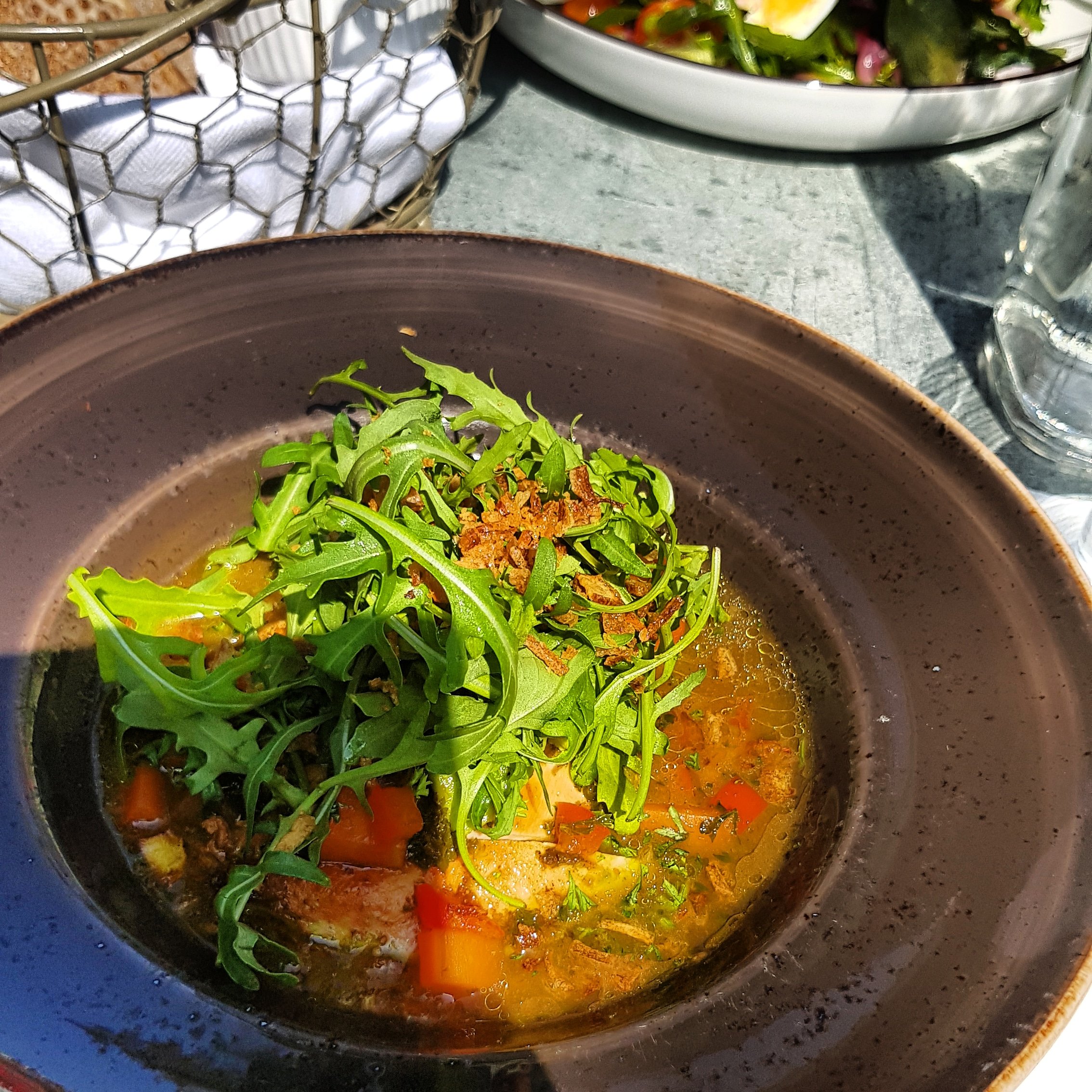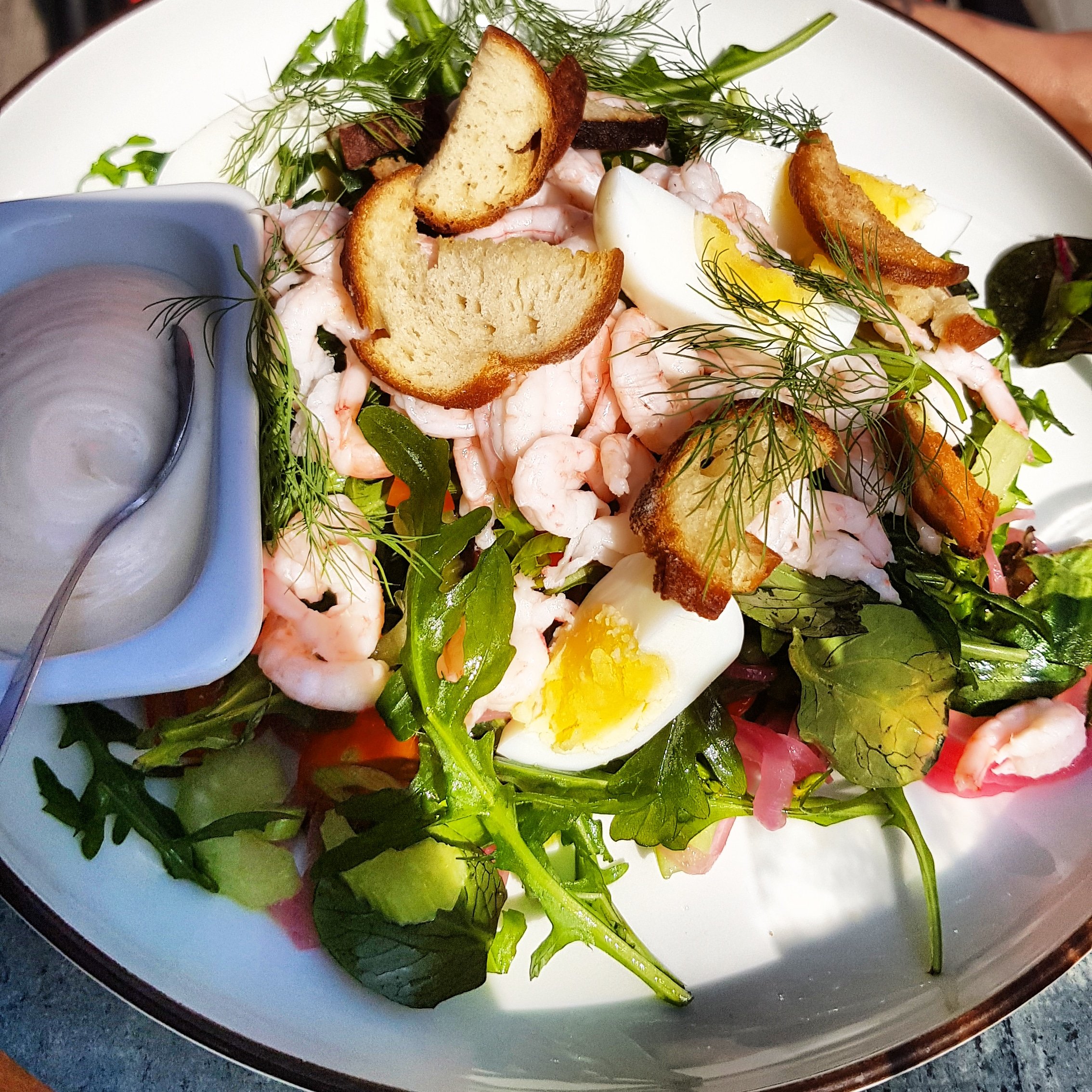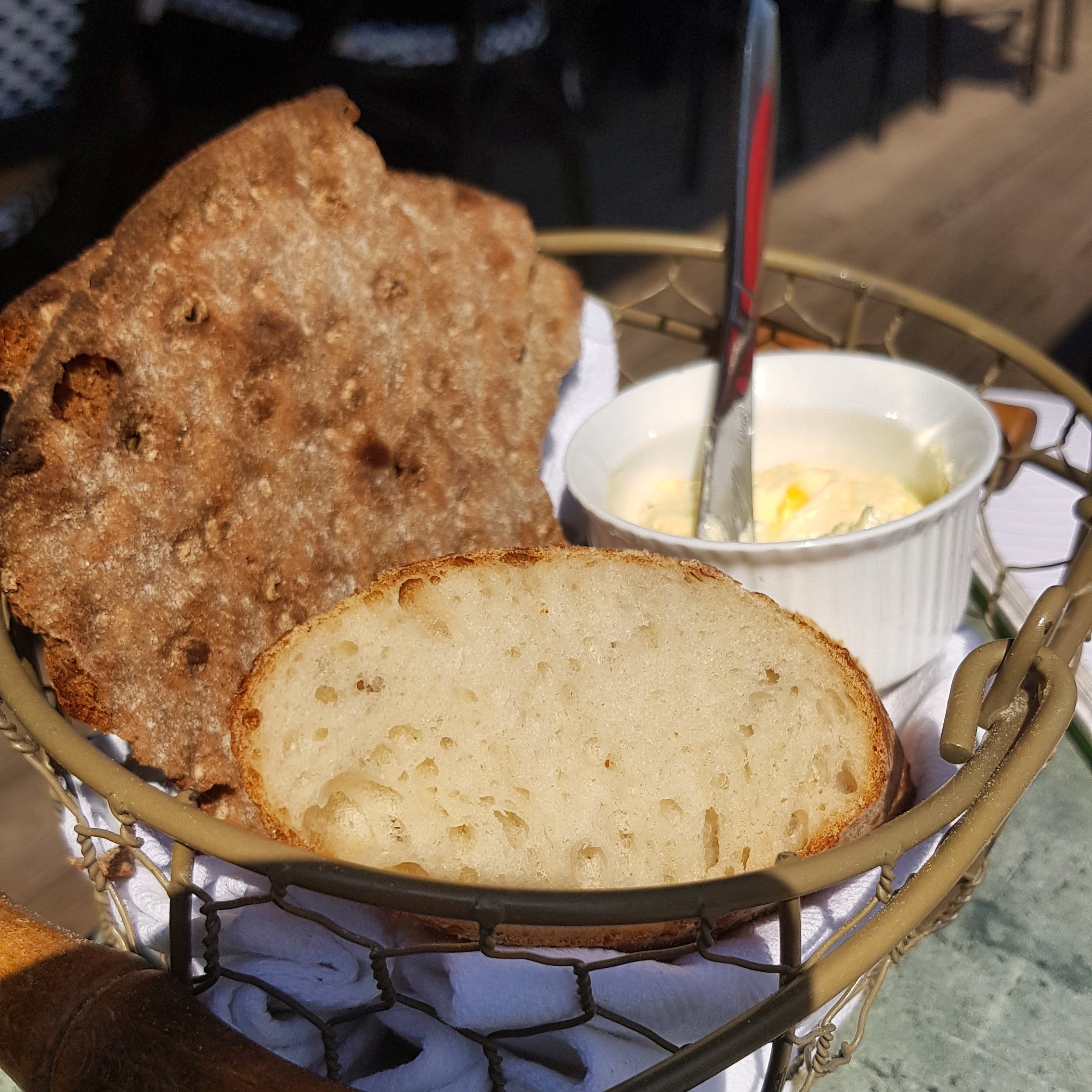 Idag tog vi ett litet break från städöppningen och åt en god lunch på kvarterskrogen Astrids vid Ängbyplan. Du inväntar hovis som hjälper er till bords, ni blir serverad en korg med mjukt bröd och knäcke tillsammans med vispat smör och en flaska vatten. Det finns ett flervals alternativ till lunch och innan hovmästaren kommer ut med dagens lunch serveras dagens soppa till bords och kaffe efter maten. Det känns både lyxigt och fräscht.