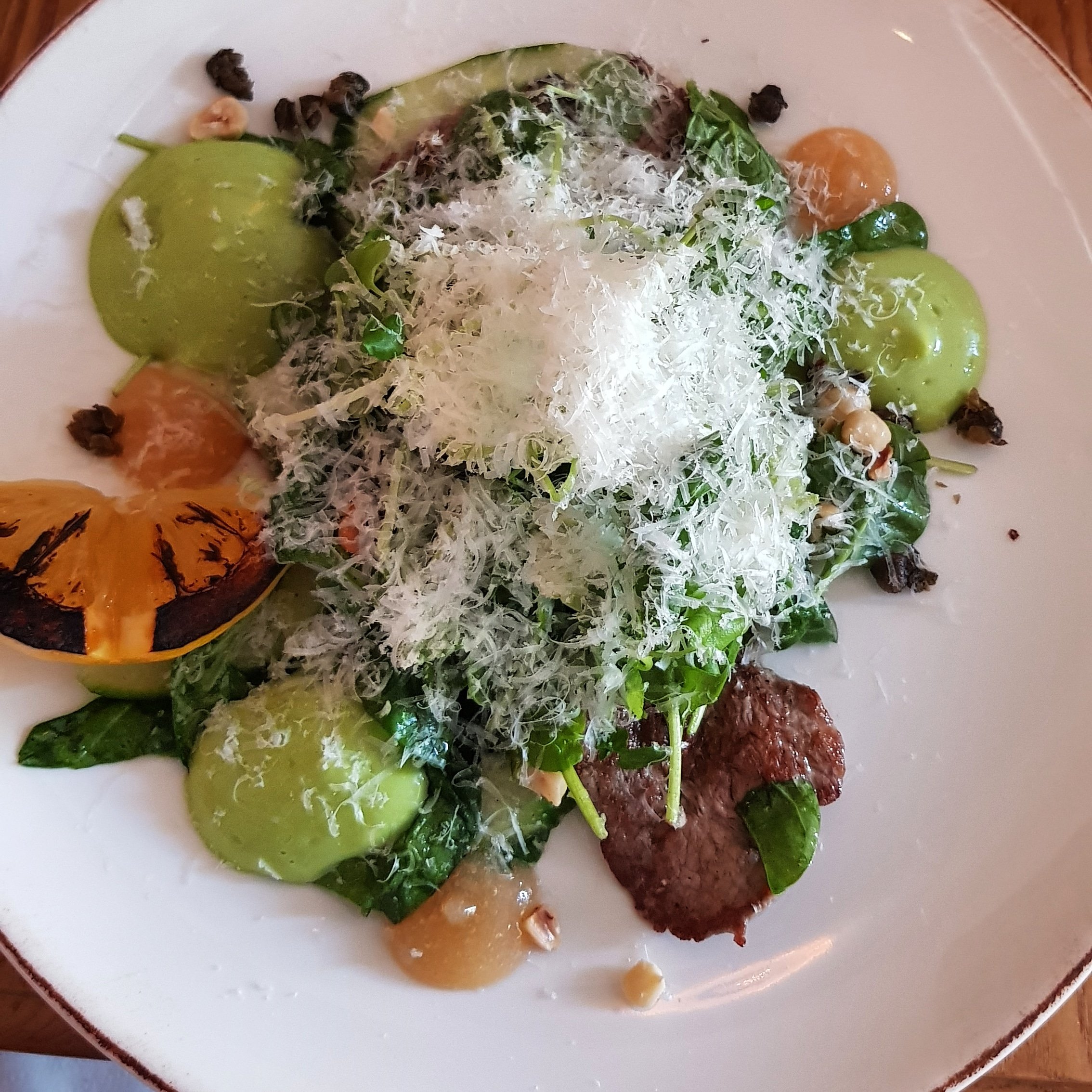 Till varmrätt avnjöt vi Kalvschnitzel med ramslöksmajonnäs, gurka, spenat, parmesan, friterad kapris, brynt smör, citronkräm & hasselnötter som smakade gudomligt. Köttet smälte i munnen tillsammans med en len konsistens. Jag hade kunnat vara utan hasselnötter men som helhet var det perfekt.
