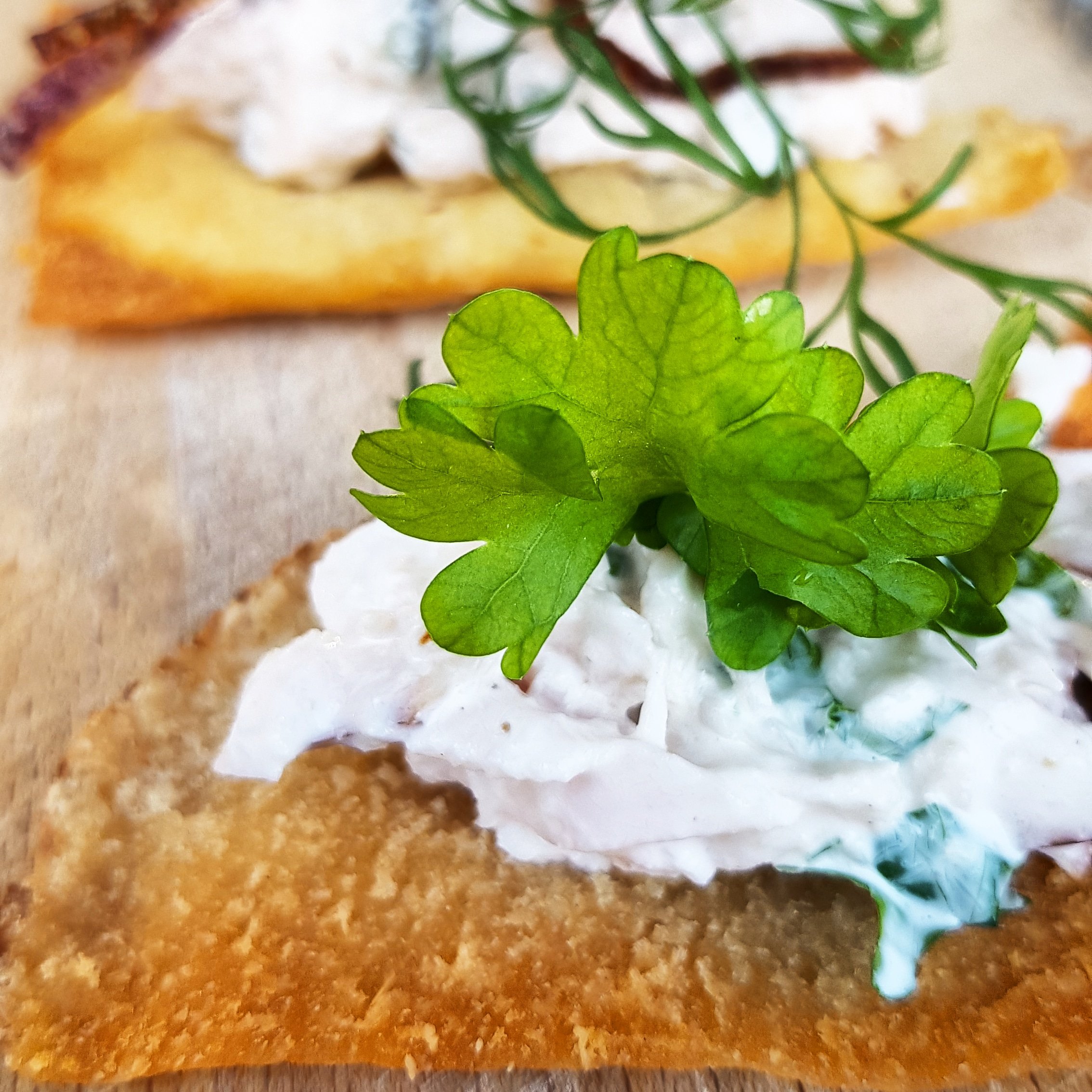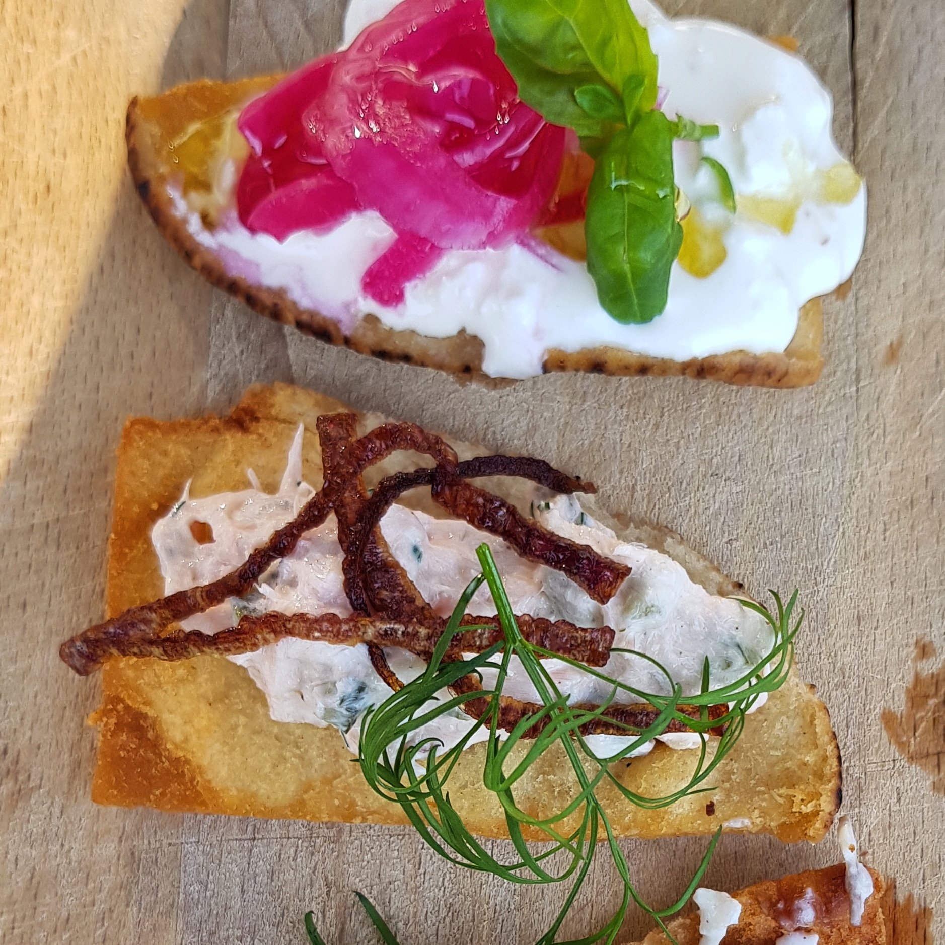 4. Friterade pitabröd med varmrökt laxröra som toppas med friterad rödlök, kalkonröra med pepparrot och fetaostcreme med honung och basilika som toppas med inlagd rödlök.