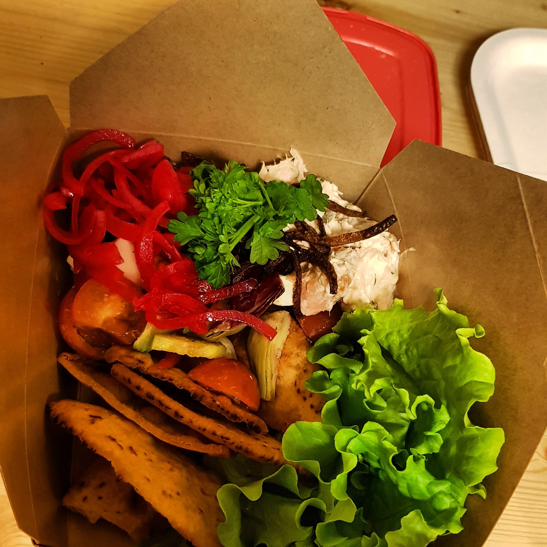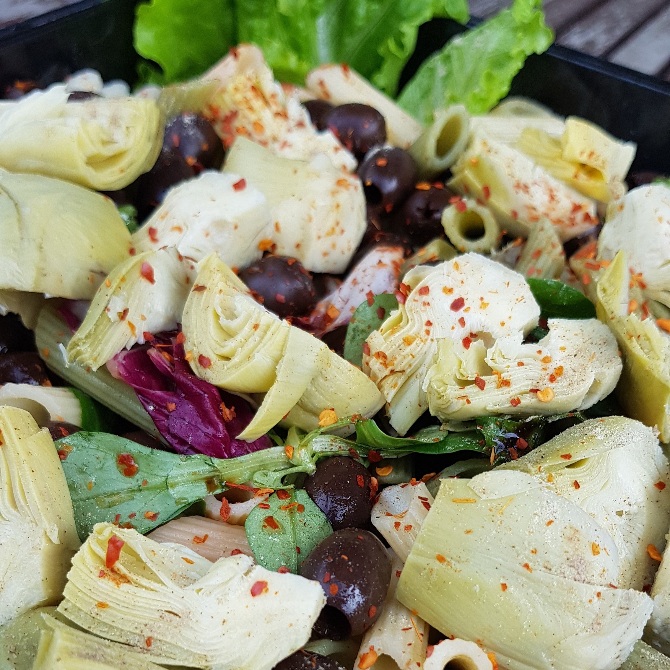 1 Glutenfri pastasallad med oliver, blandsallad och kronärtskocka
