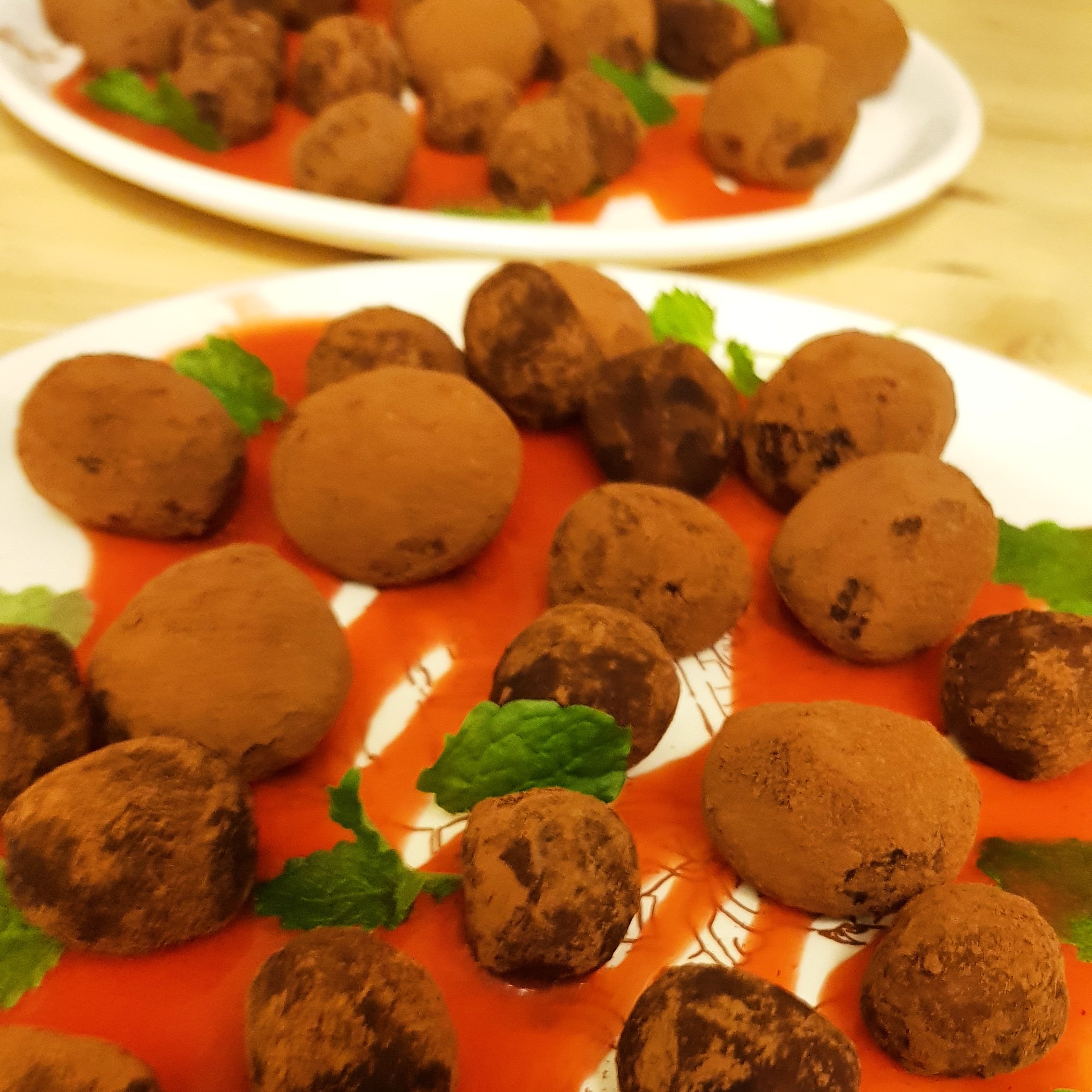 5. Nougat och chokladtryfflar med jordgubbscoullis.