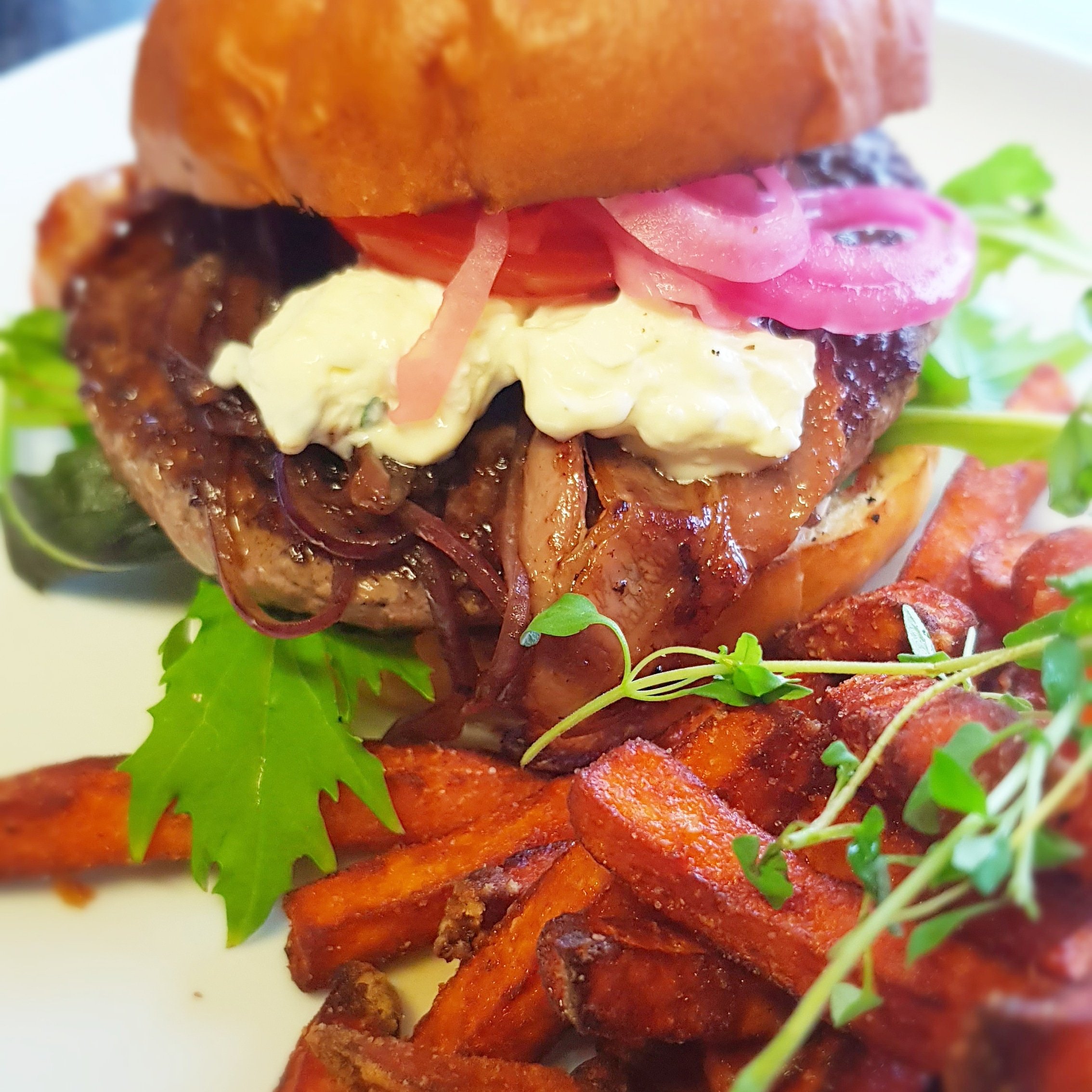 Rostat brioche bröd med chevrecreme, karamelliserad rödlök vänd i rödvinssky, blandsallad, inlagd rödlök, stekt bacon och tomatskivor som serveras med vitlökscreme och sötpommes.