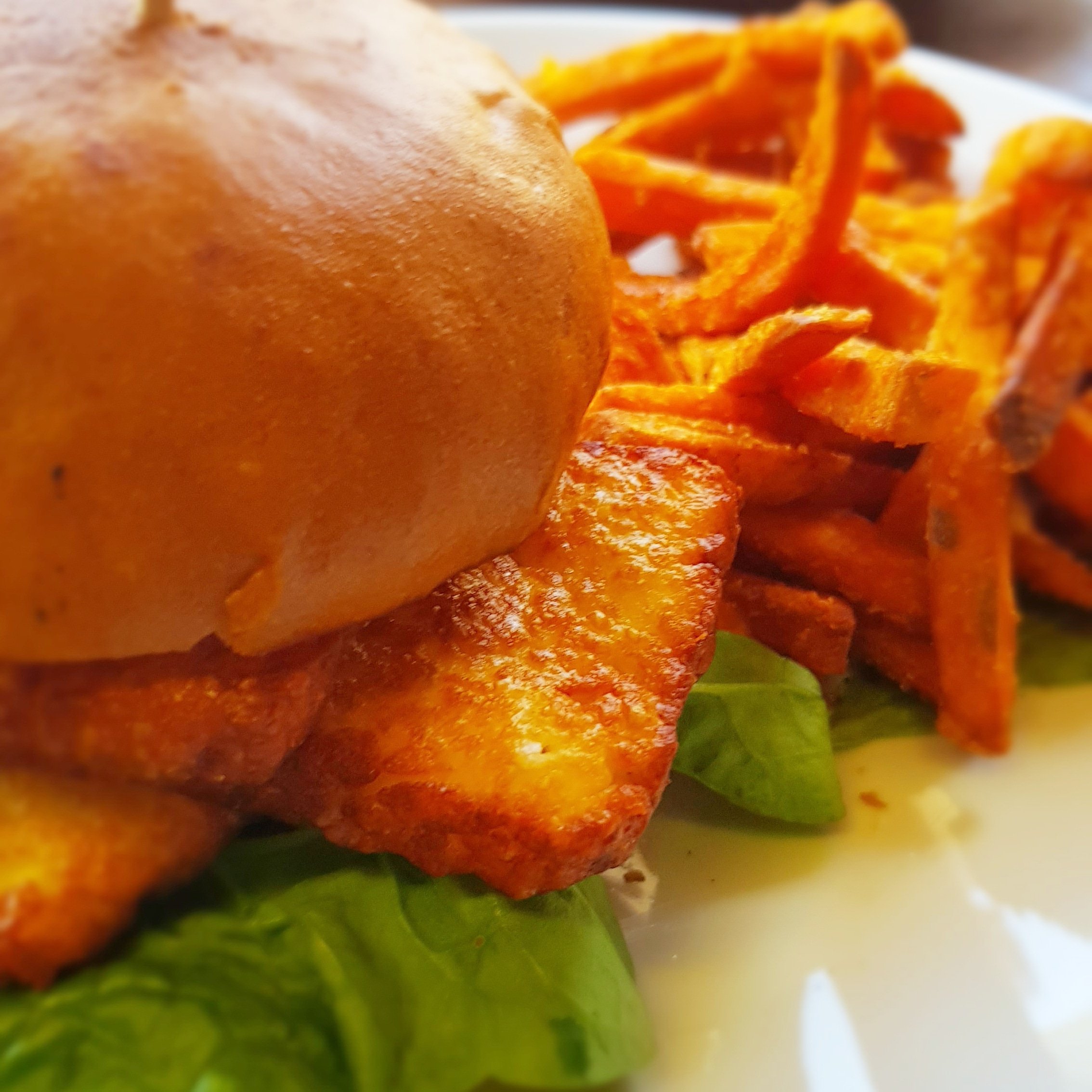 Friterad halloumiburgare är riktigt gott tillsammans med en chilimajo och sötpommes.