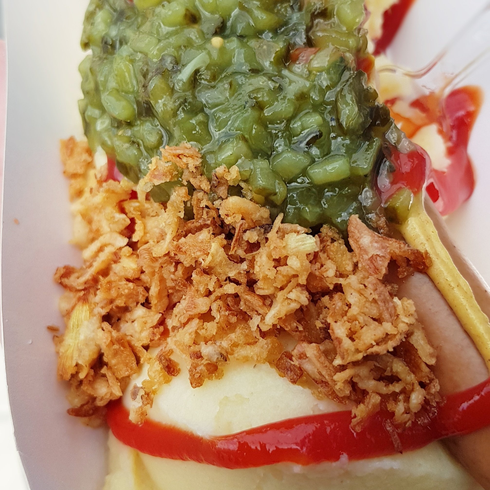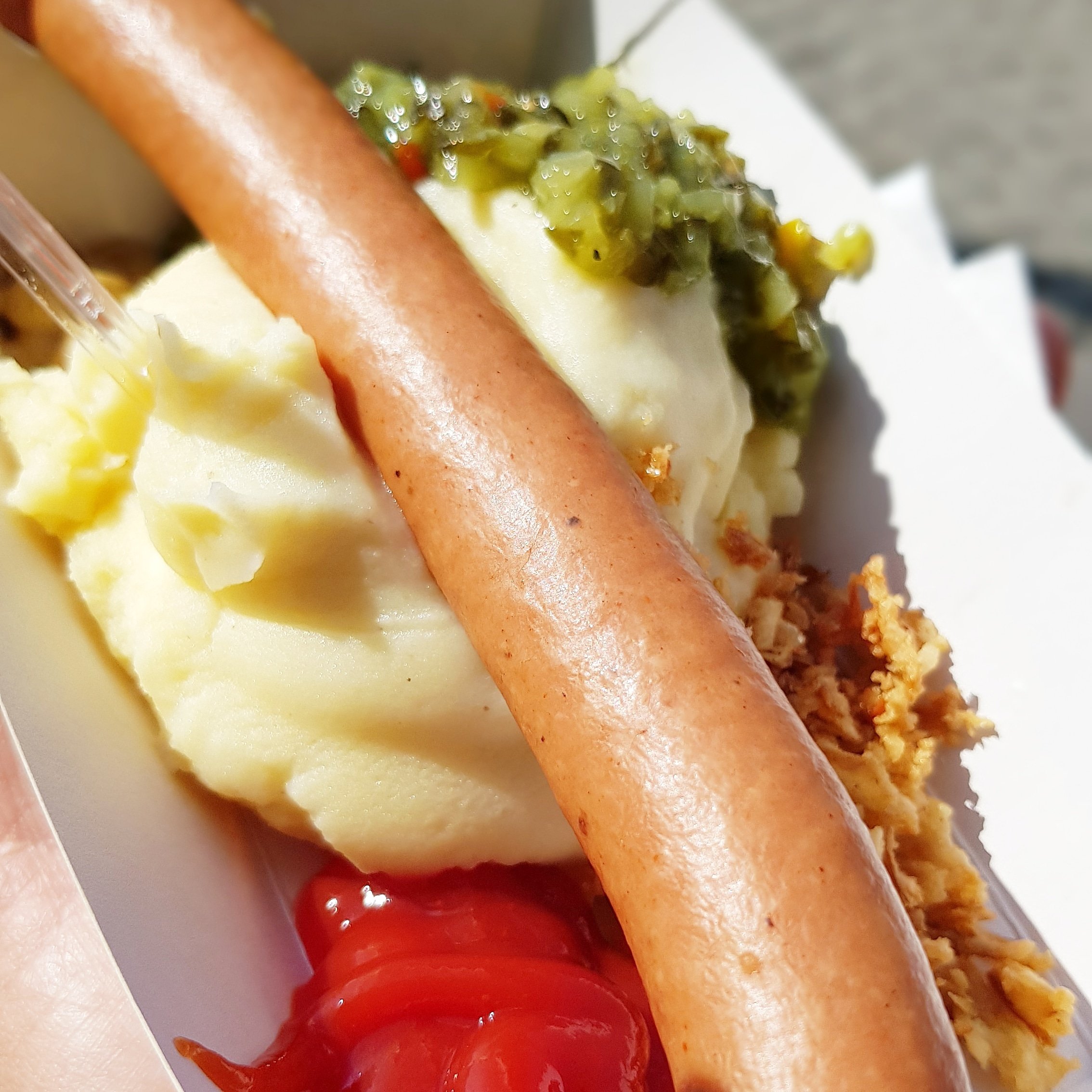 Det fick bli potatismos med rostad lök, bostongurka och en kokt med senap och ketchup. Jag var så hungrig. Att jag inte äter frukost längre? Dygnsrytmen har blivit sisådär? Jag blev verkligen inte mätt så jag beställde en portion till men i mindre format.