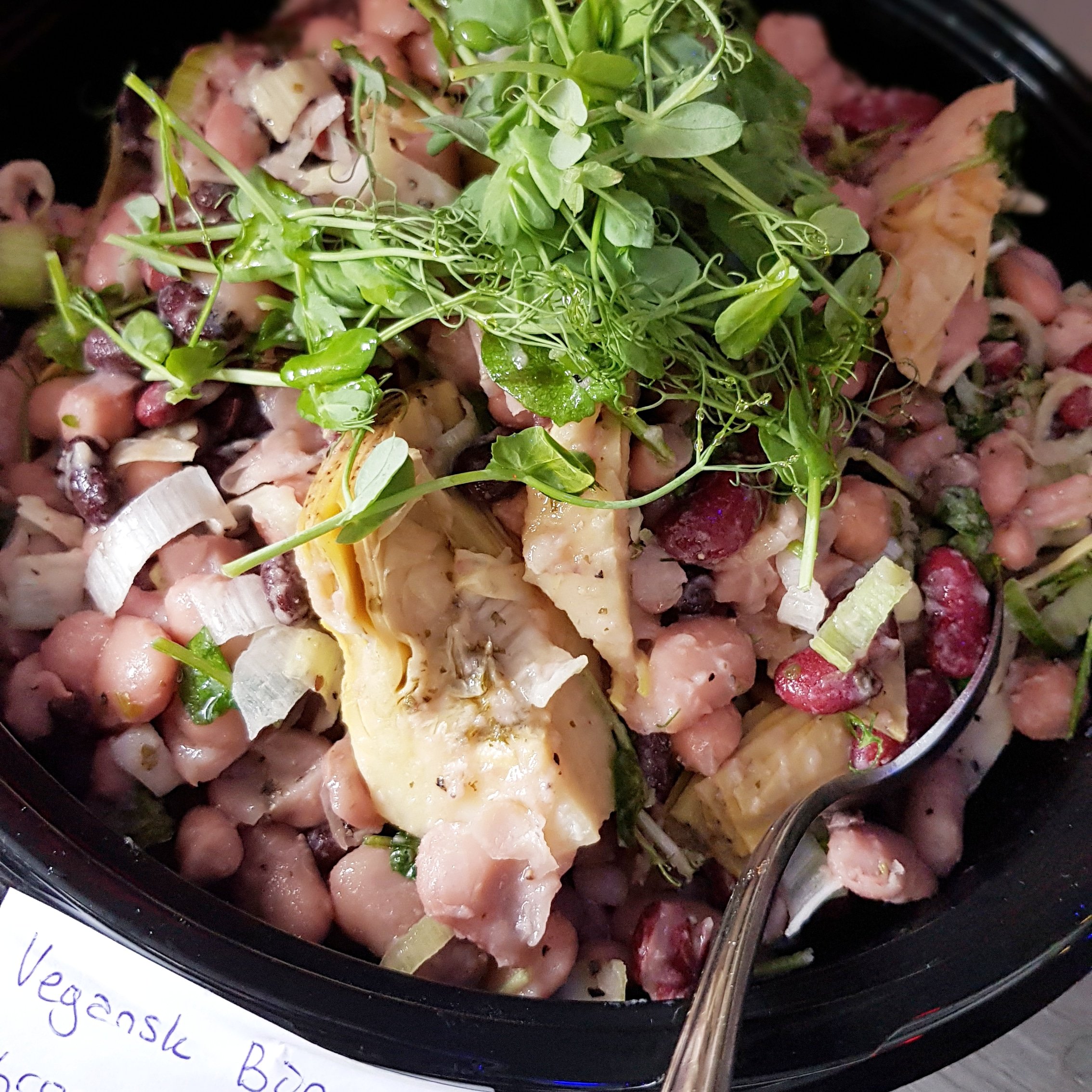 Vegosallad som serveras med grillspett på baljväxtfärs.