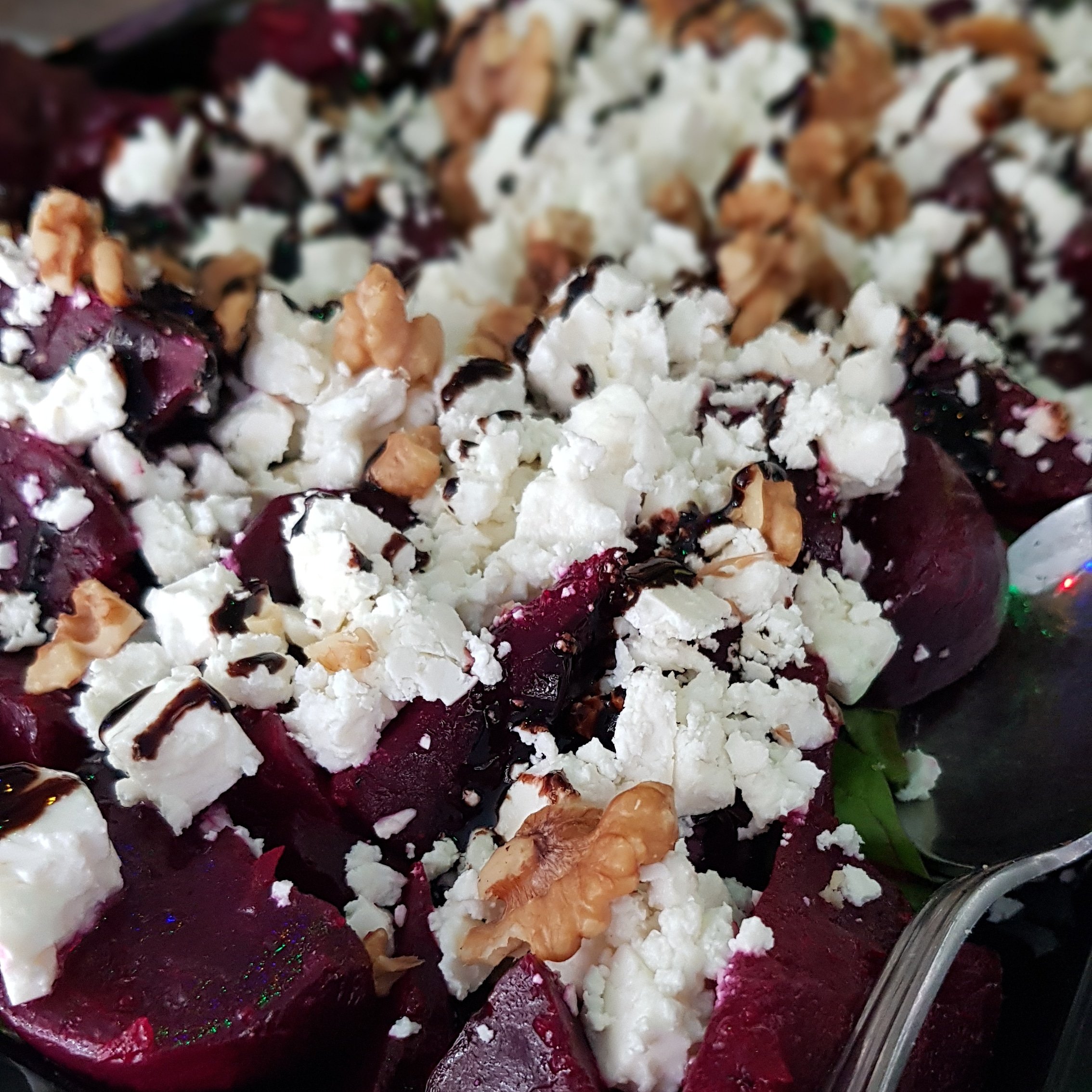 Smörslungade rödbetor med rostade valnötter och chevre.