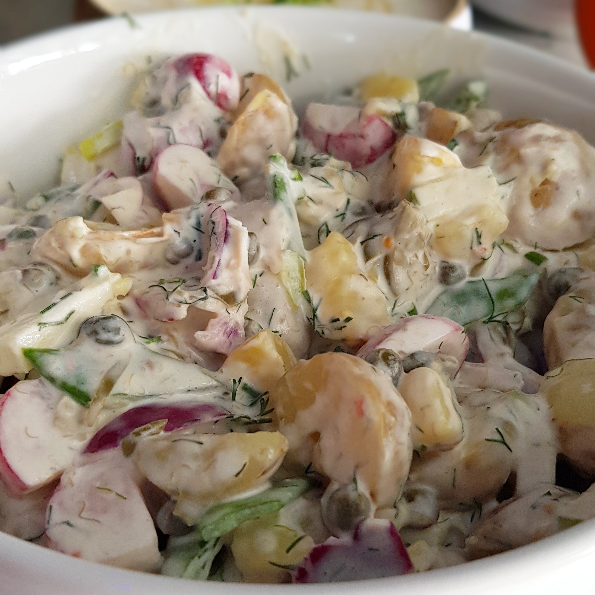 För kvällen blev det två potatissallader. Jag älskar potatissallad som är krämig. Denna bestod av kapris, äpple, creme fraiche, brytbönor, rädisor, rödlök, dill, kryddor och dijon.