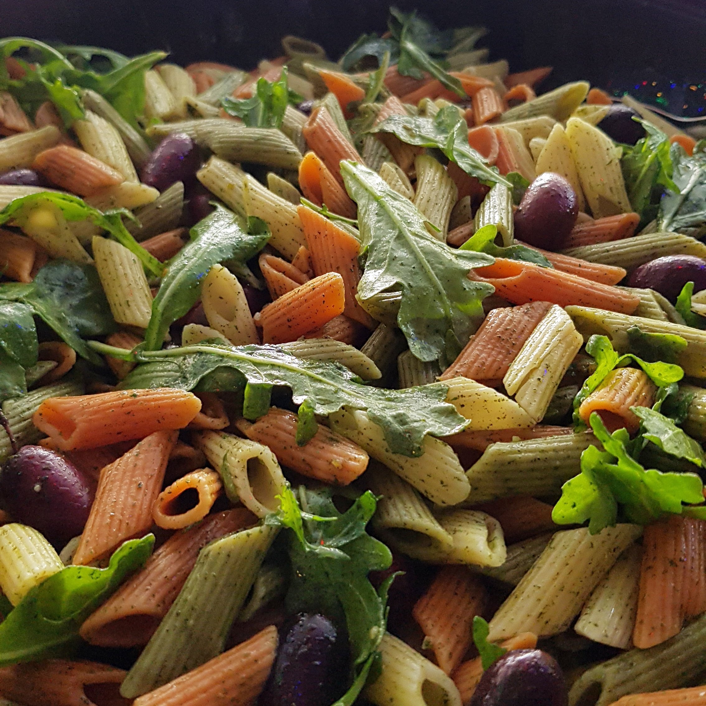 Härlig pastasallad med ruccola, oliver med örtdressing.
