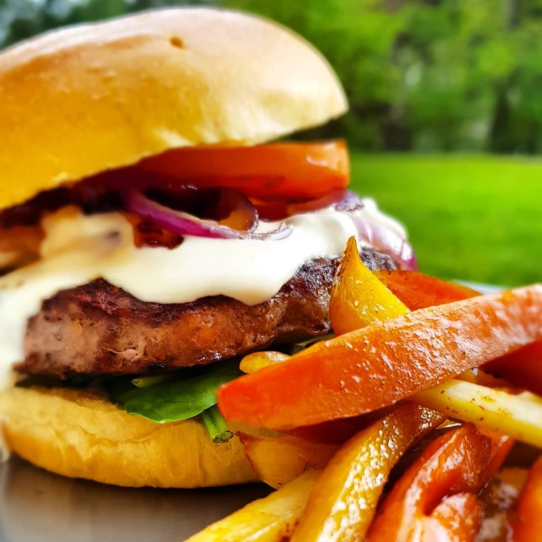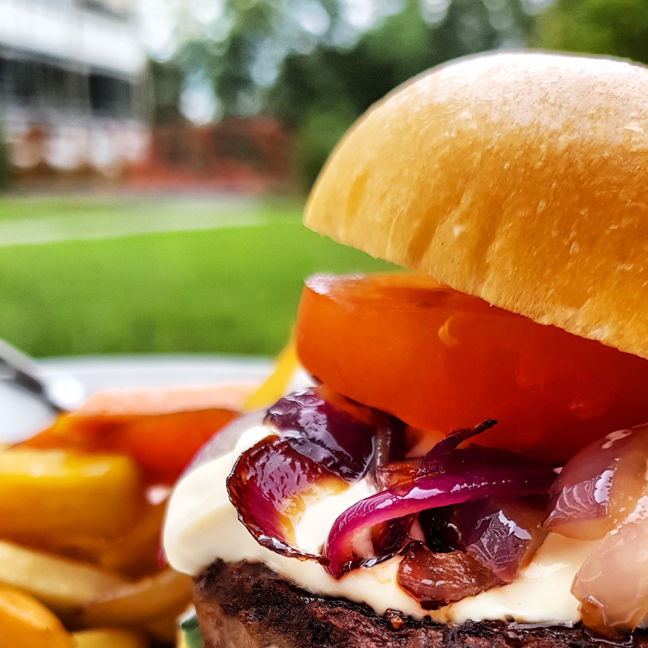 Kvällen till ära blev burgare på briochebröd med härlig cremé, karamelliserad rödlök, spenat och tomat med pommes på kålrot, palsternacka och morötter som har gottat sig i honung, balsamico, vitlök, salt och peppar.