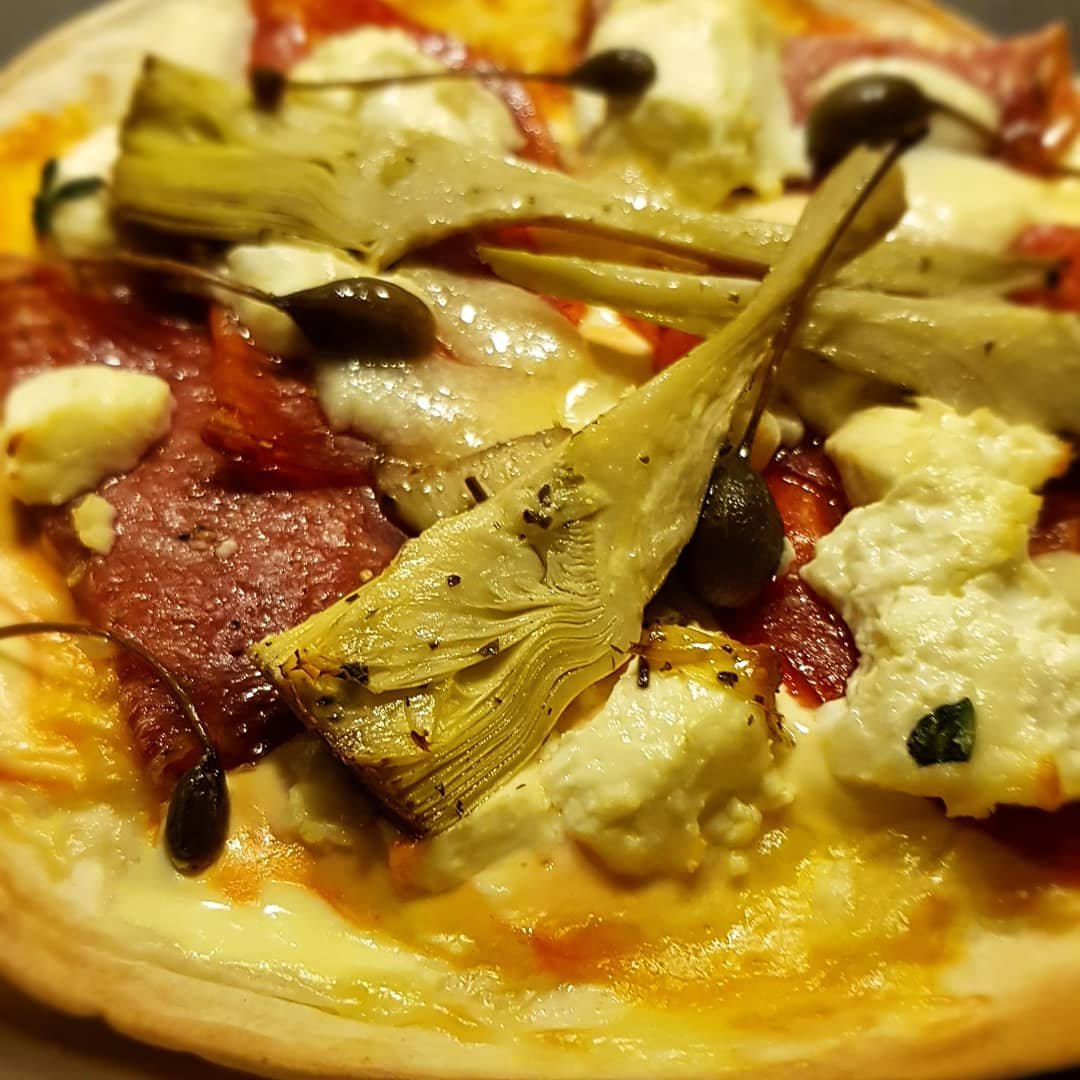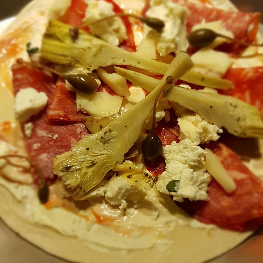Jag gjorde typ samma pizza som i helgen men den här gången hade jag med mig läckra godbitar från delikatessen för att se vad som funkar.