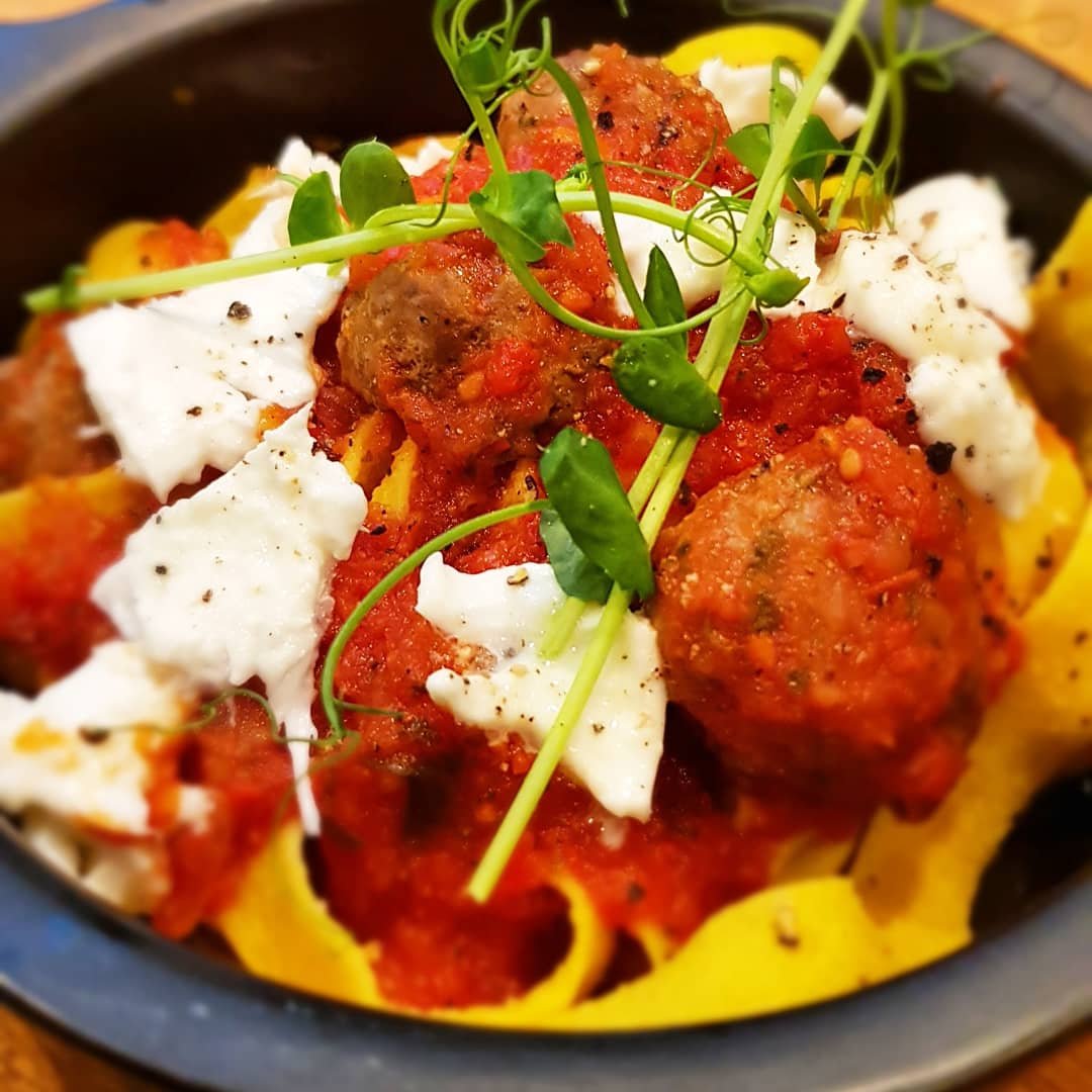 Olja & Oliv Deli kommer att börja servera Italienska kalvköttbullar i tomatsås med färskpasta som toppas med mozarella under några dagar. Här ser ni en supergod grund till färsen som får gotta till sig med en blandning på syrligt och salt samt lite härliga färska kryddor som har fått mixat ihop med lök och vitlök och hela registret.