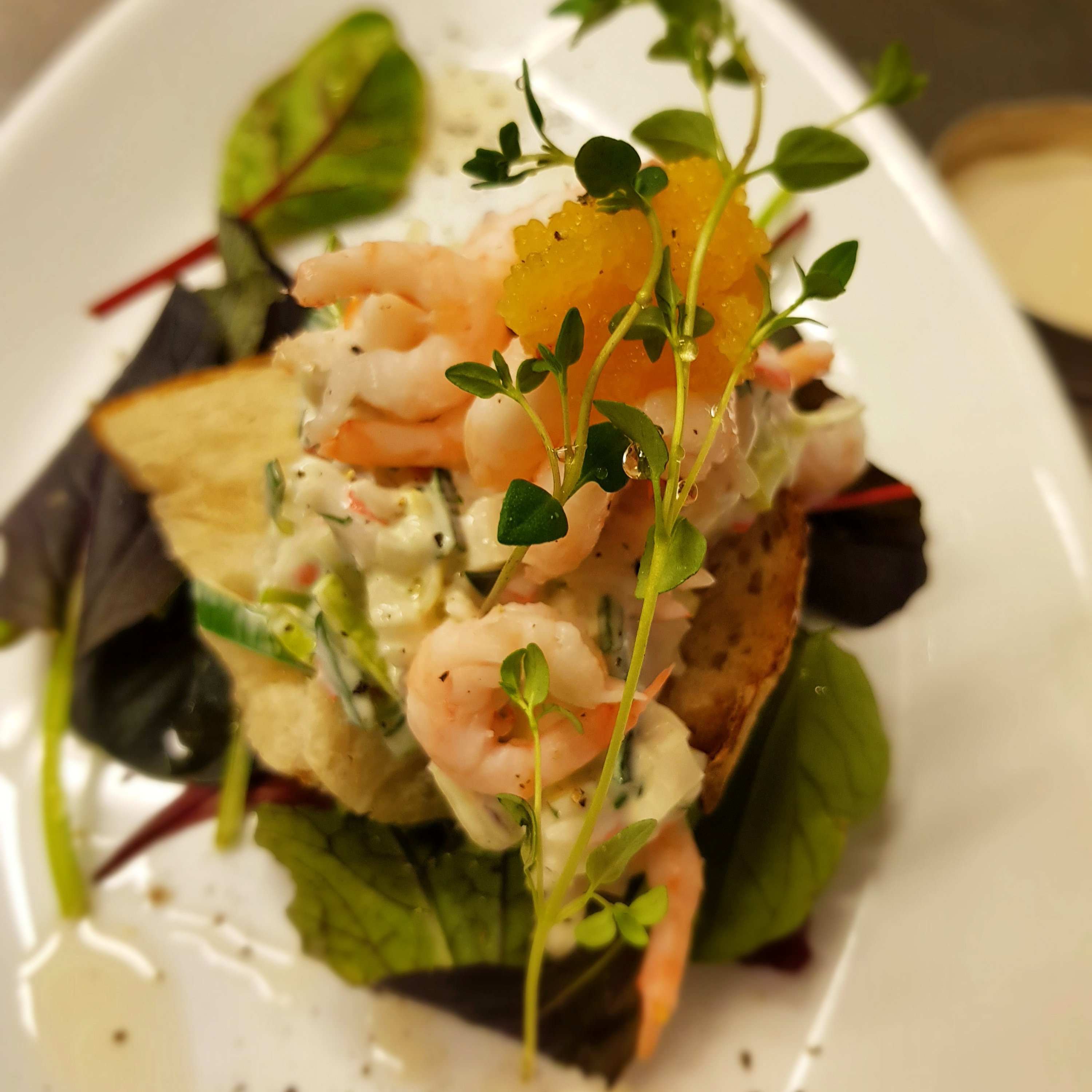 Den här veckan har Olja och oliv på Söder serverat skagen men på vårat vis tillsammans med räkor och caviar som toppas med vit balsamcio. Det är ett härligt citronsalt som har rörts ner. Saltet finns i butiken så jag ska ta en bild på det så ni får se. Jätte smakrikt och gott.