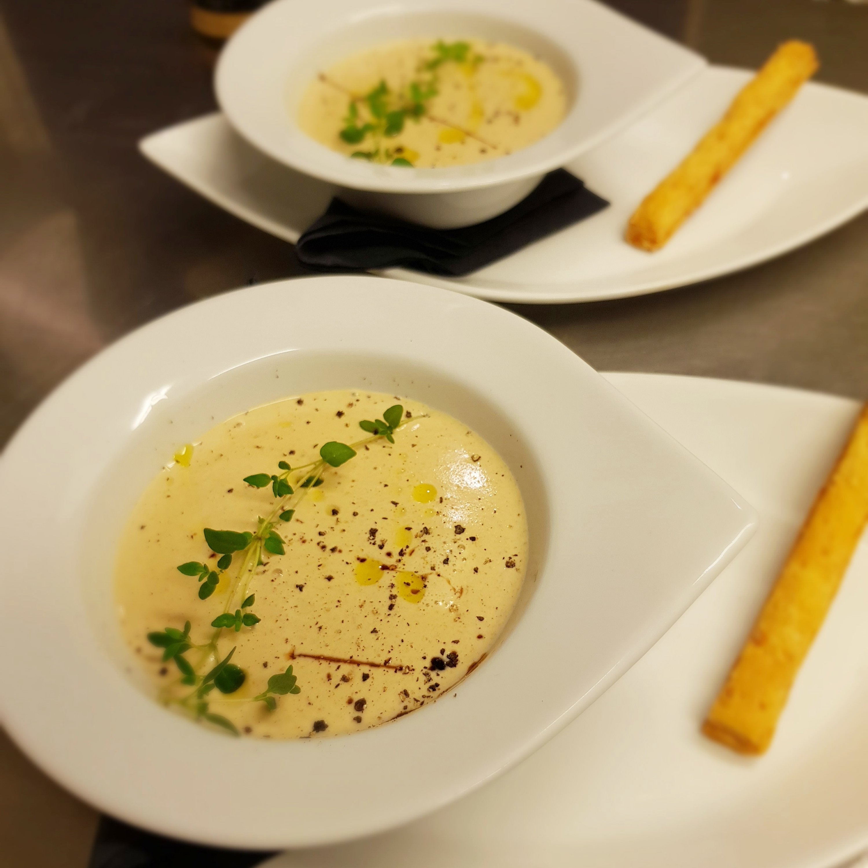 En härlig höstsoppa på kantareller som smörsteks tillsammans med rotselleri, schalottenlök, vitlök och timjan. Slår på sherry eller vittvin och grädde som får koka ihop på svag värme. Sen mixar du soppan slät och smakar av med salt, peppar och toppar med tryffelolja och balsamcio som har lagrats i 4 år och blandats med 20% vinvinäger.