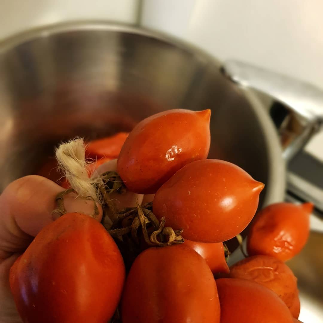 Här ser vi en fin tomatklase som lagras i södra Italien. Detta är en hundraårig teknik som kallas ”de pomodorino del piennolo” tomaterna har tjockt skinn som lagras över vintern och blir godare med tiden. Det finns bara fem tomatersorter som får kallas för piennolotomater men jag är ingen tomatexpert så jag inte namnge resterande.