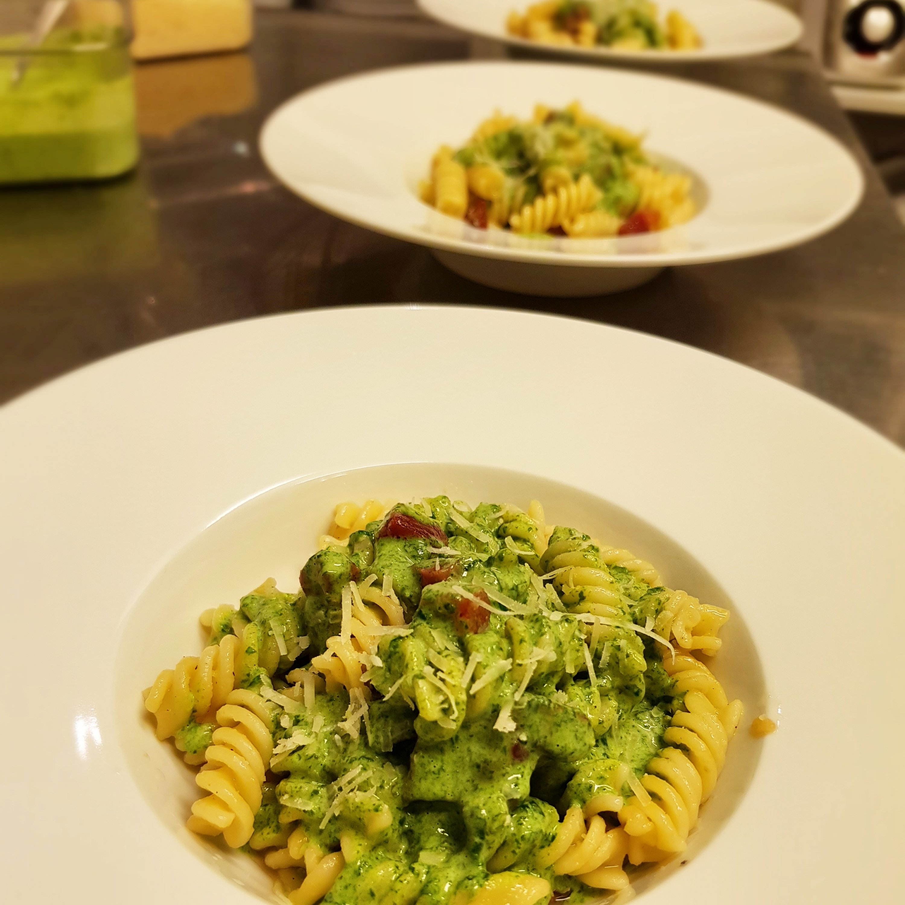 Vi serverar potatisgratäng på spenatbädd och idag tog jag till vara på resten av spenaten och drog ihop en spenatsås. När åt folket en spenatsås sist? Jag stekte lite bresola och kokade ihop pasta till mina kollegor och svischade över med lite parmesanost. En bra middag till personalen.